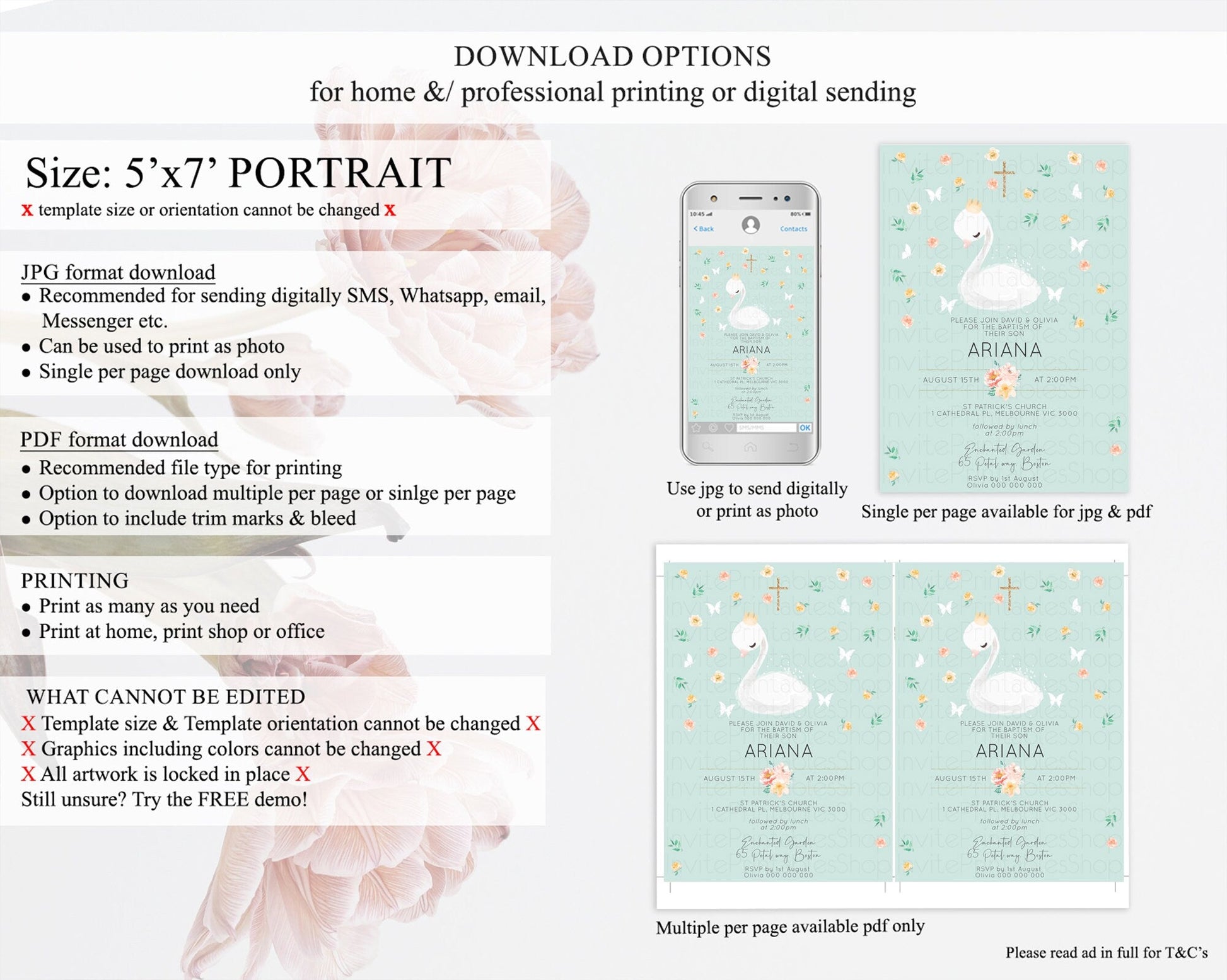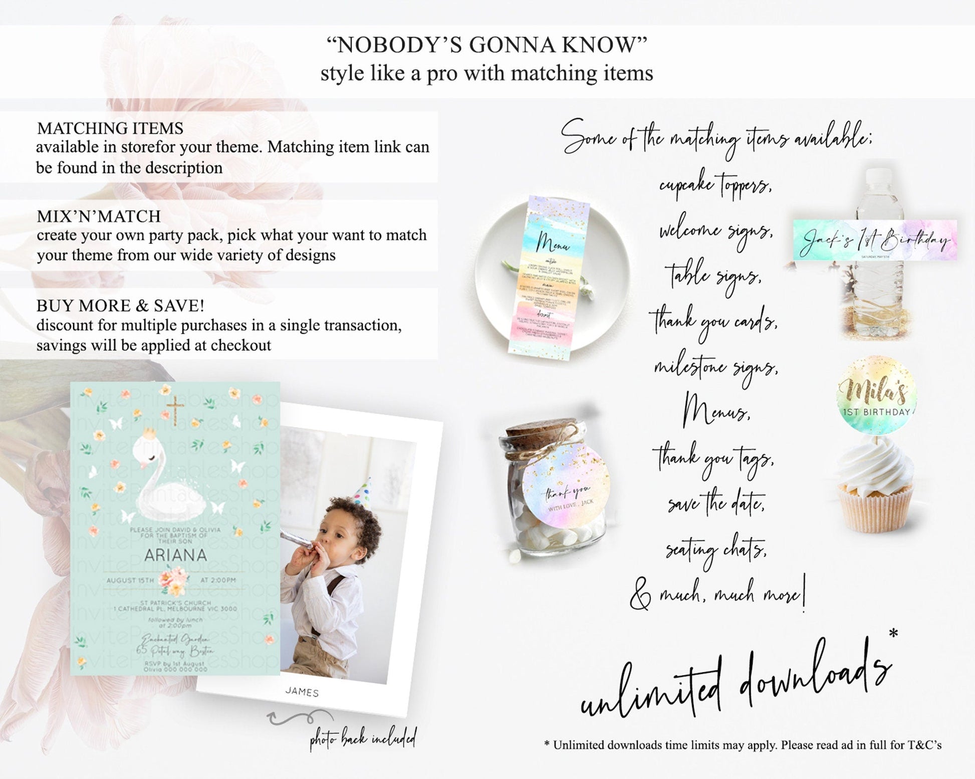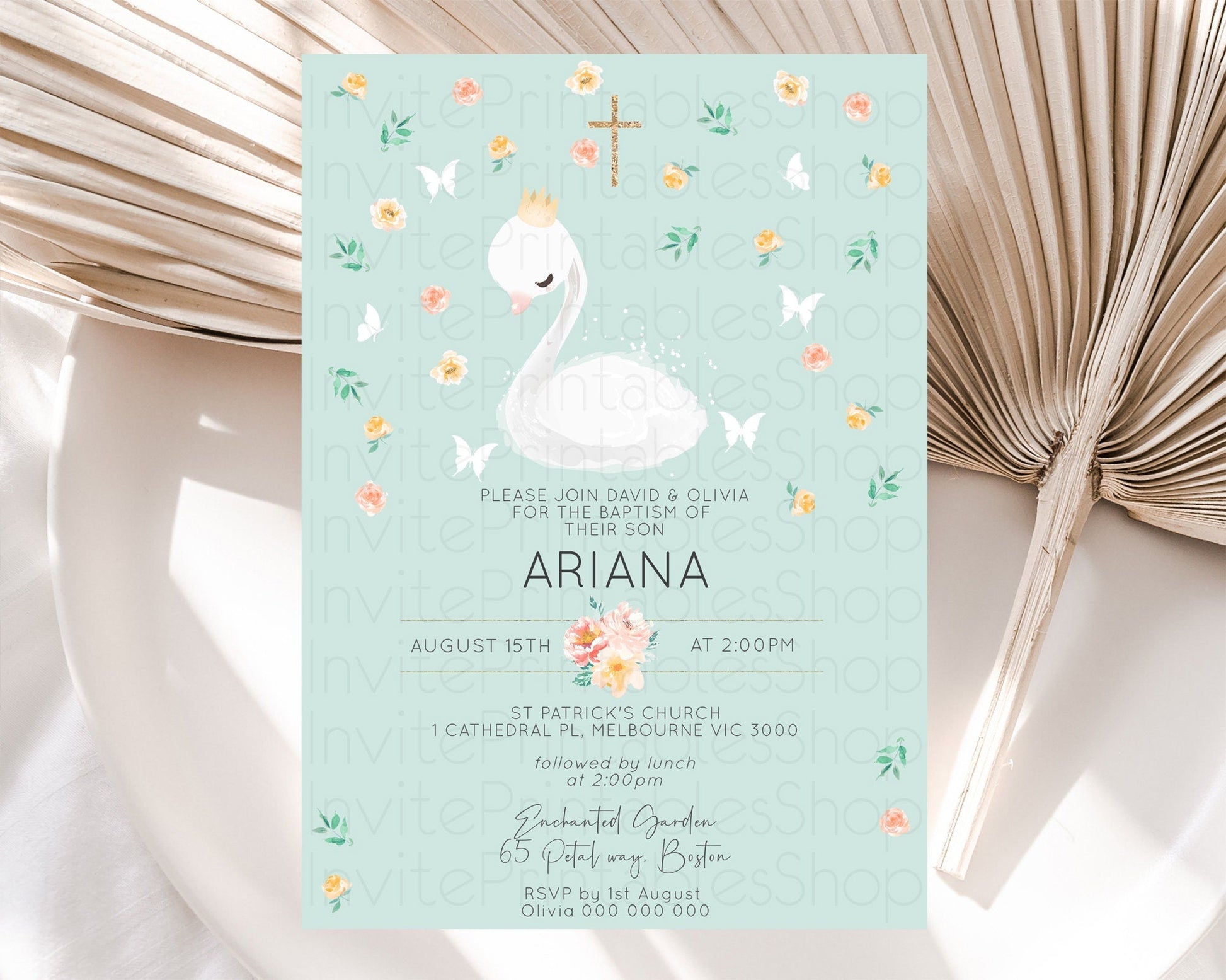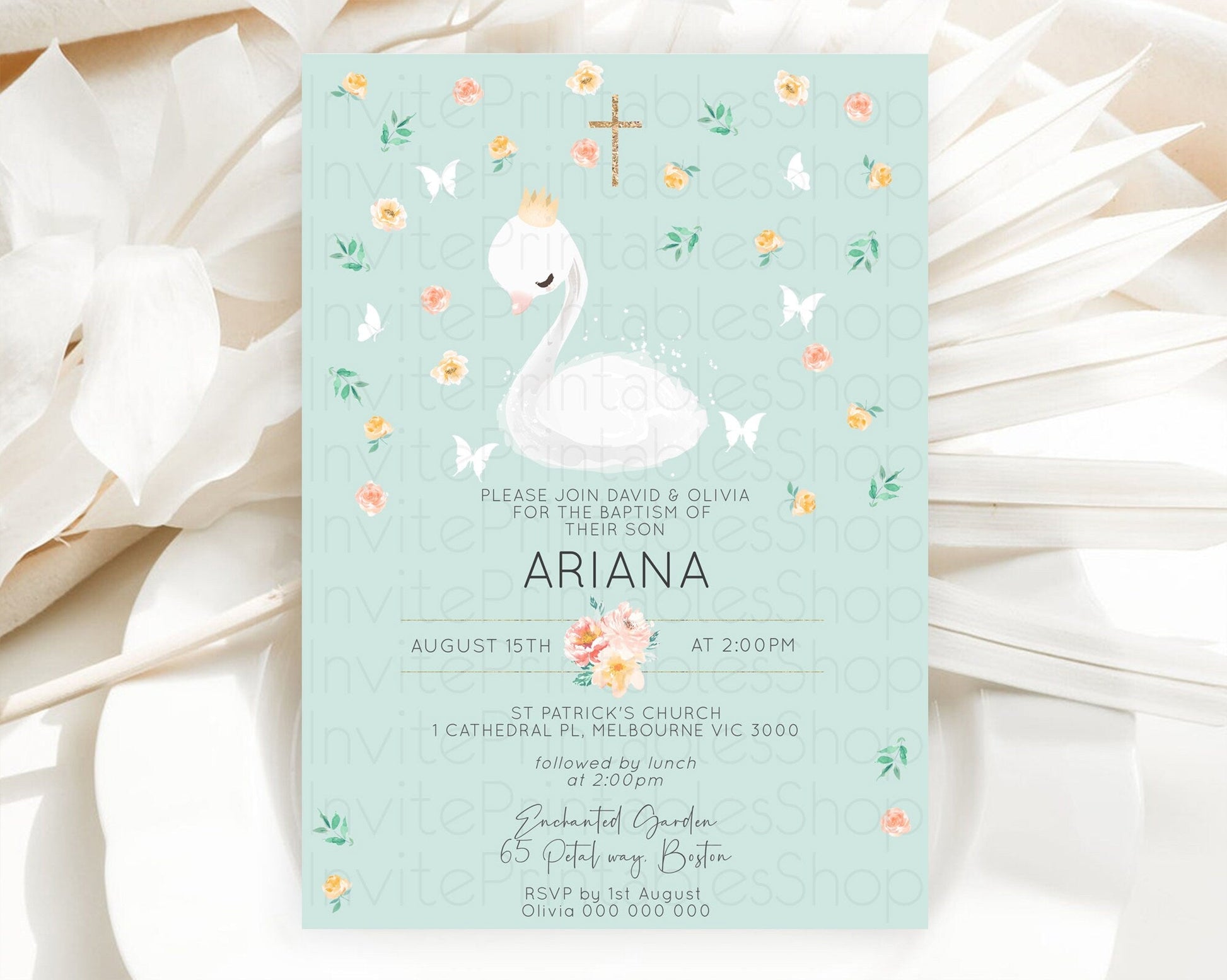 Swan Lake Baptism Invitation Swan Princess Ballet Baptism 1st Birthday Enchanted Forest Secret Garden Watercolour Pastel Floral D10905