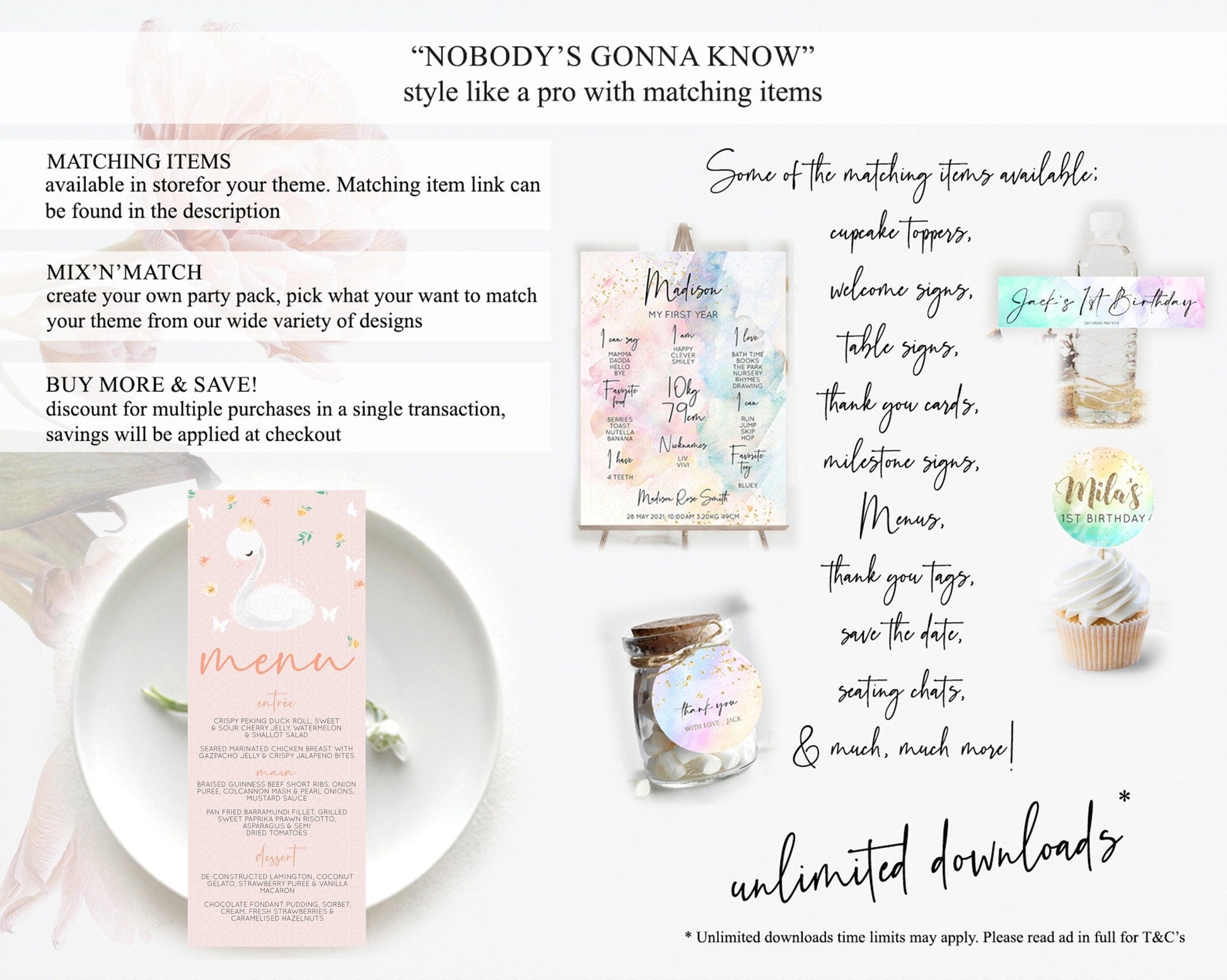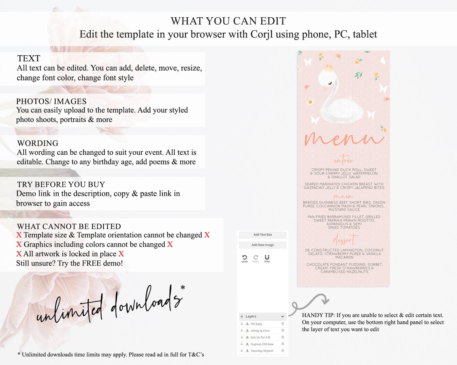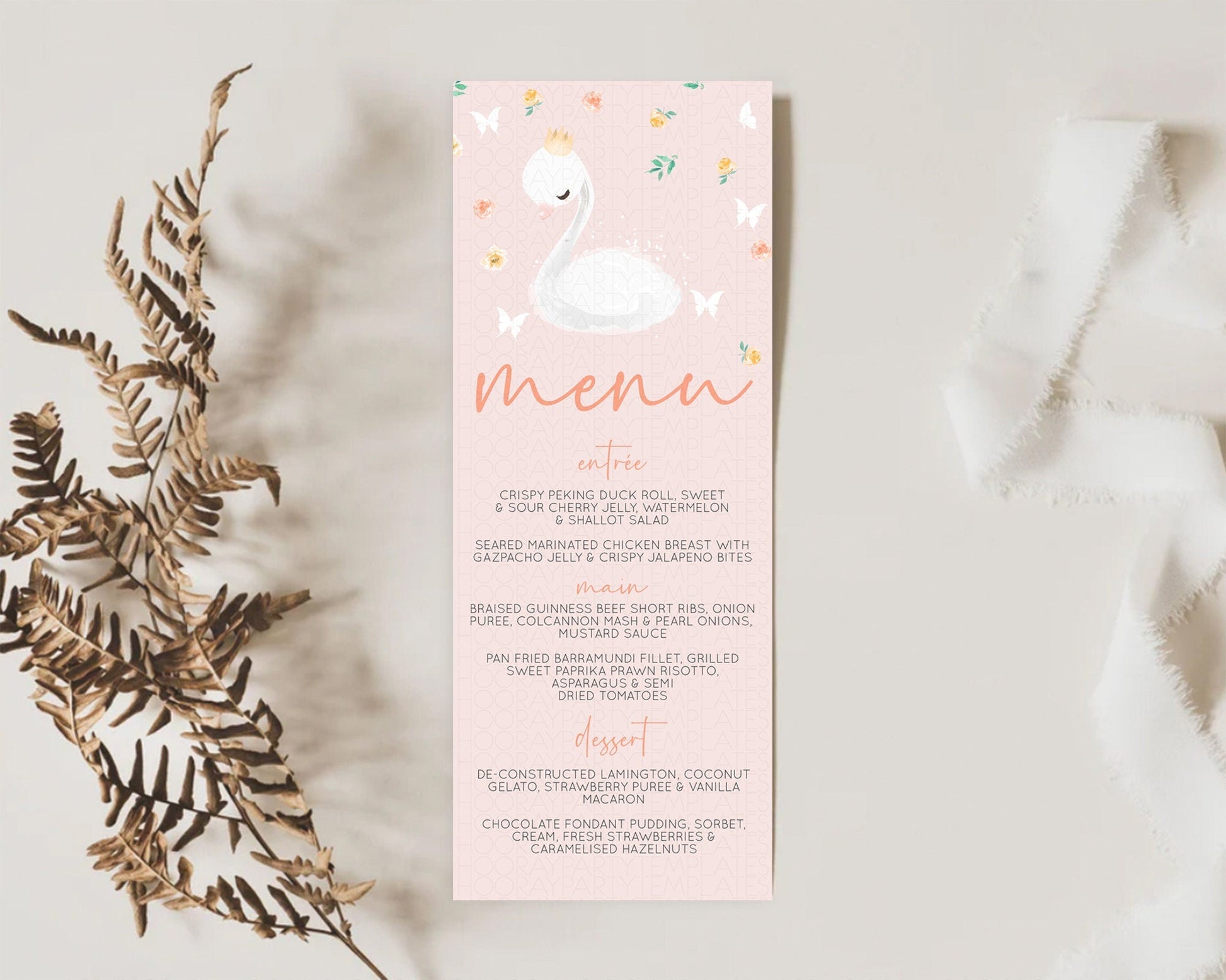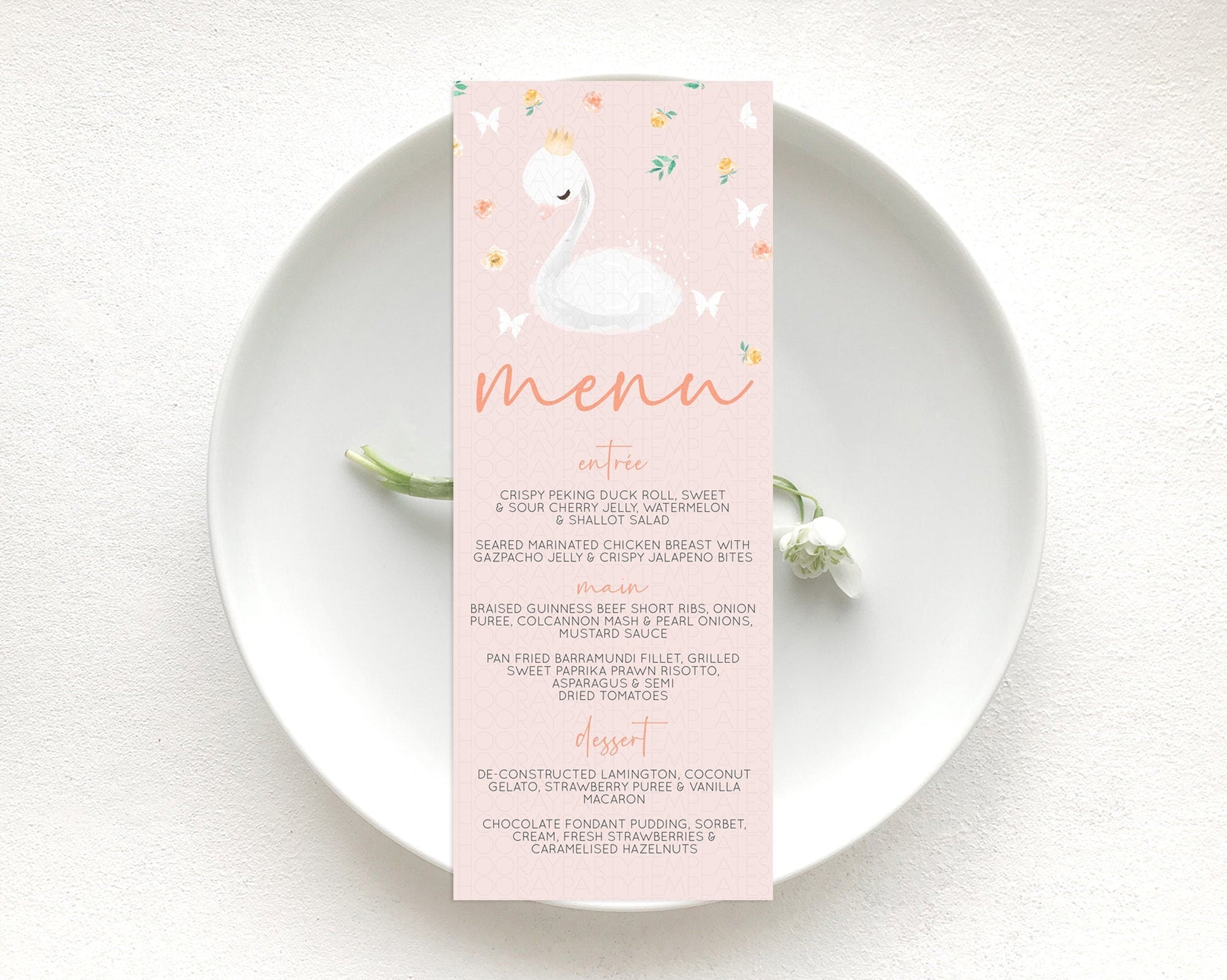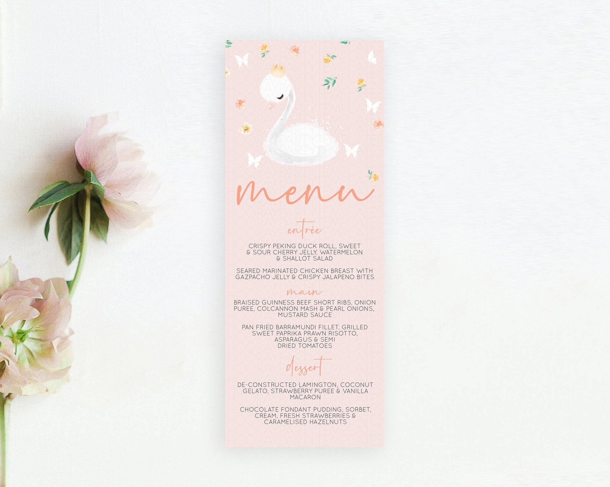 Swan Menu Swan Princess Ballet Menu Template Enchanted Swan Lake Table Decor Secret Garden Pastel Floral Dinner Dessert Food Menu D10388