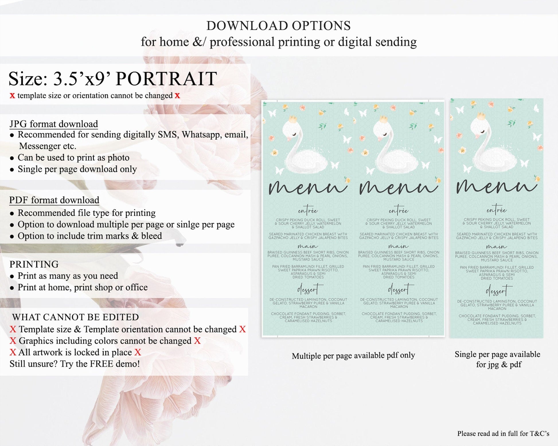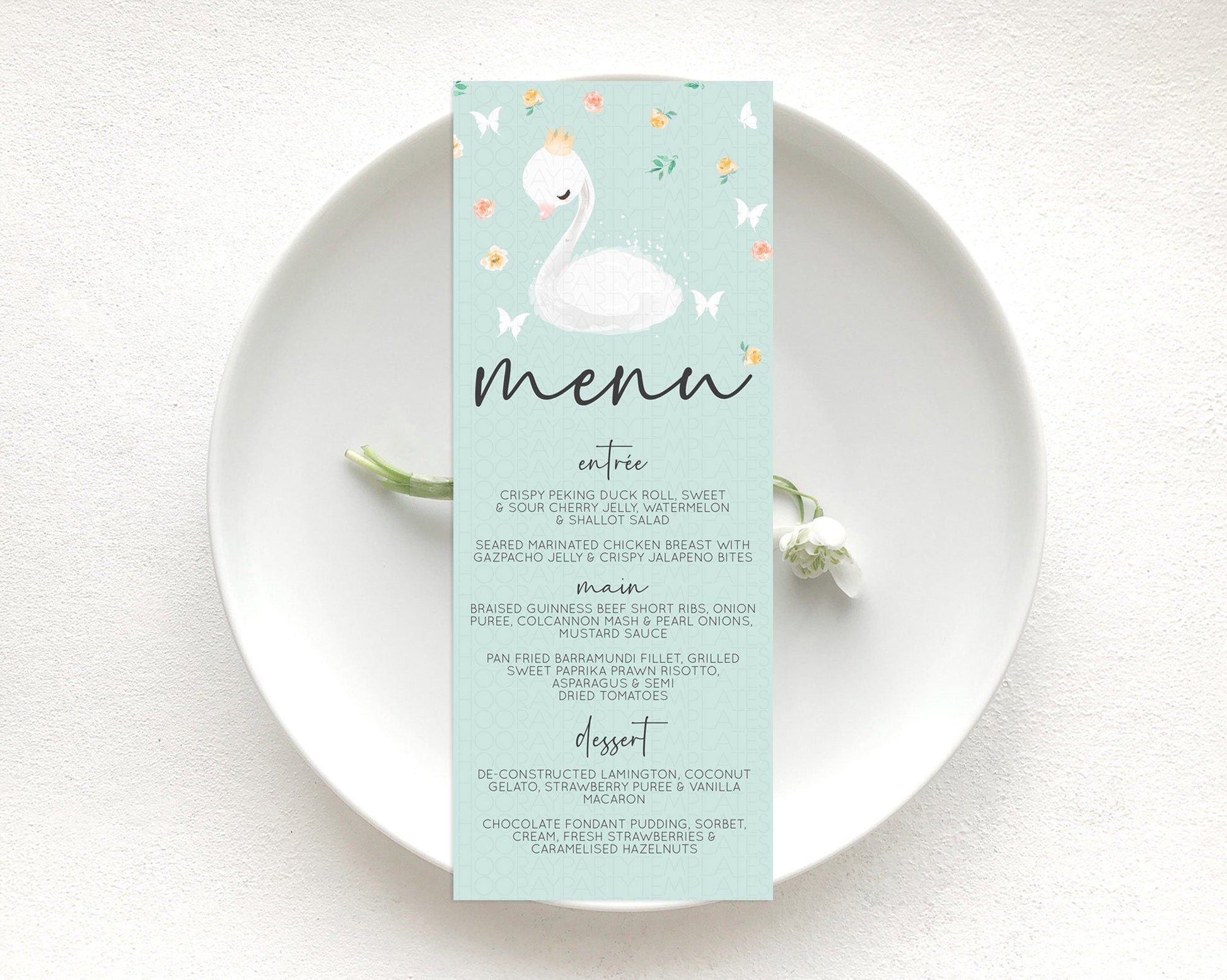 Swan Menu Swan Princess Ballet Menu Template Enchanted Swan Lake Table Decor Secret Garden Pastel Floral Dinner Dessert Food Menu D10905