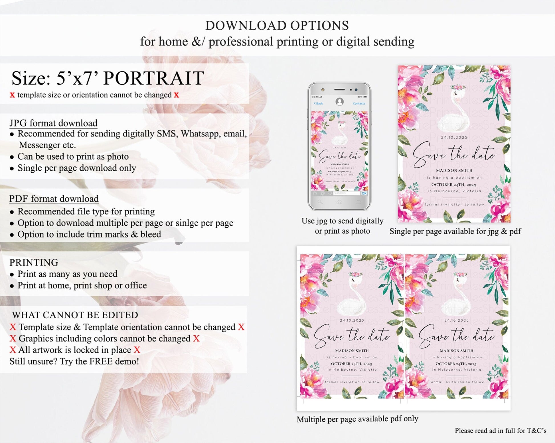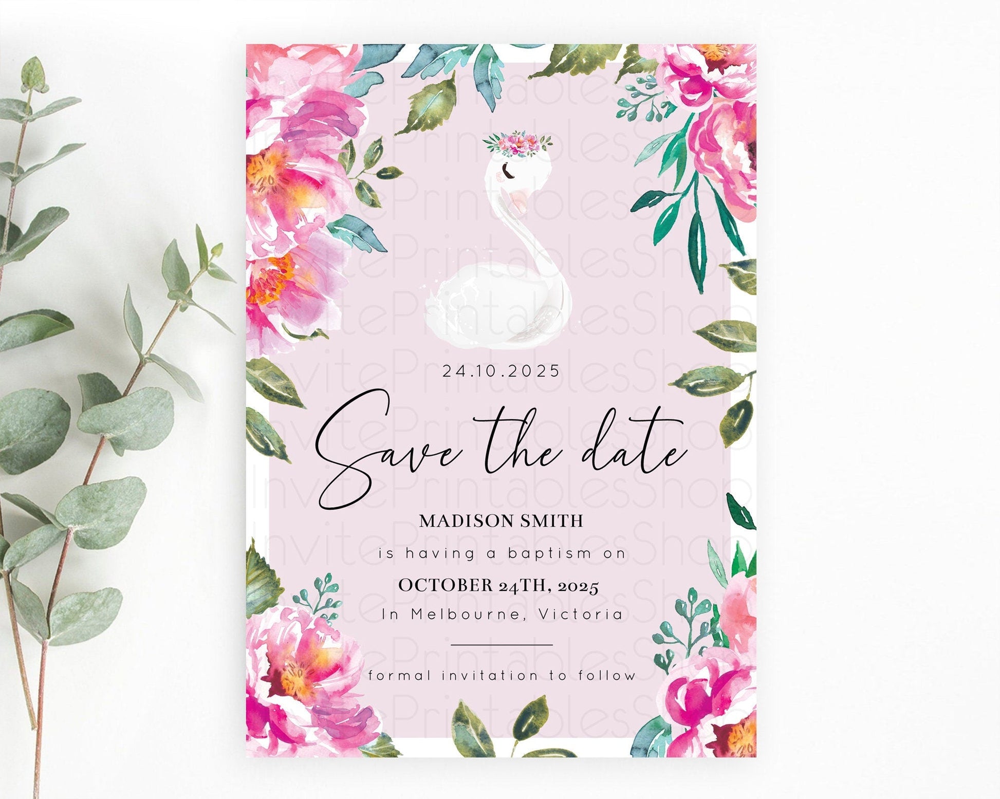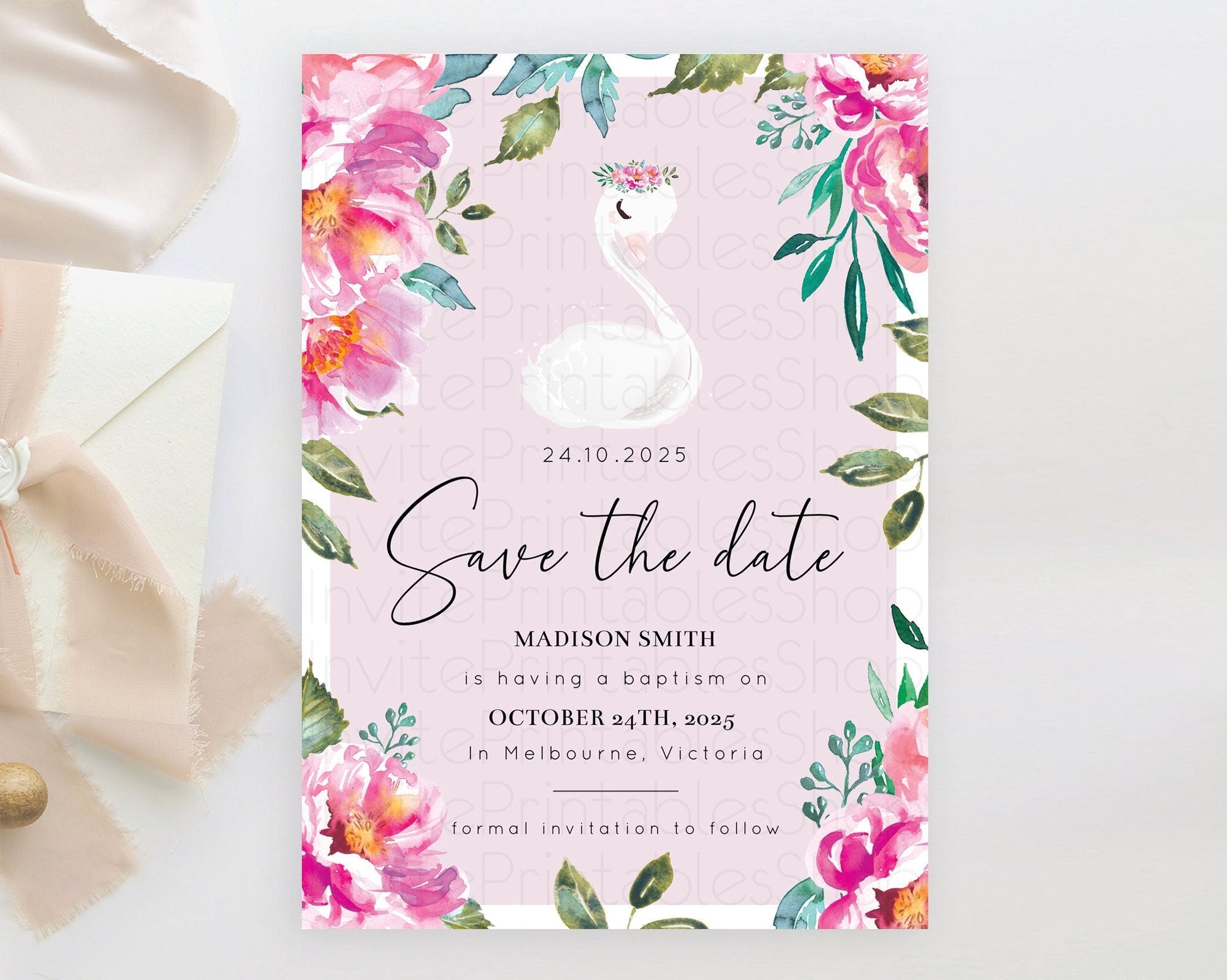 Swan Save The Date Template Swan Princess Ballet Party Enchanted Swan Lake Secret Garden Pastel Floral Birthday Baptism Baby Shower D10757