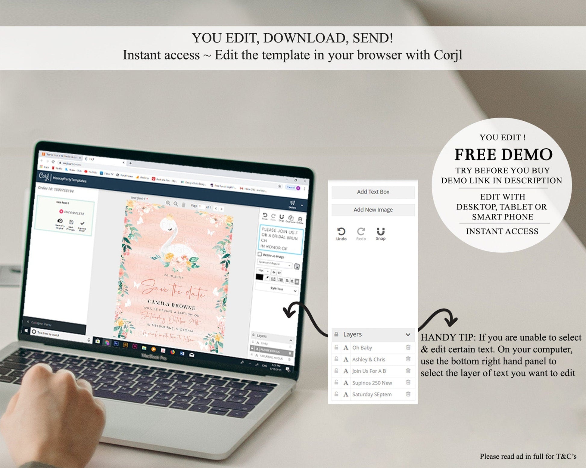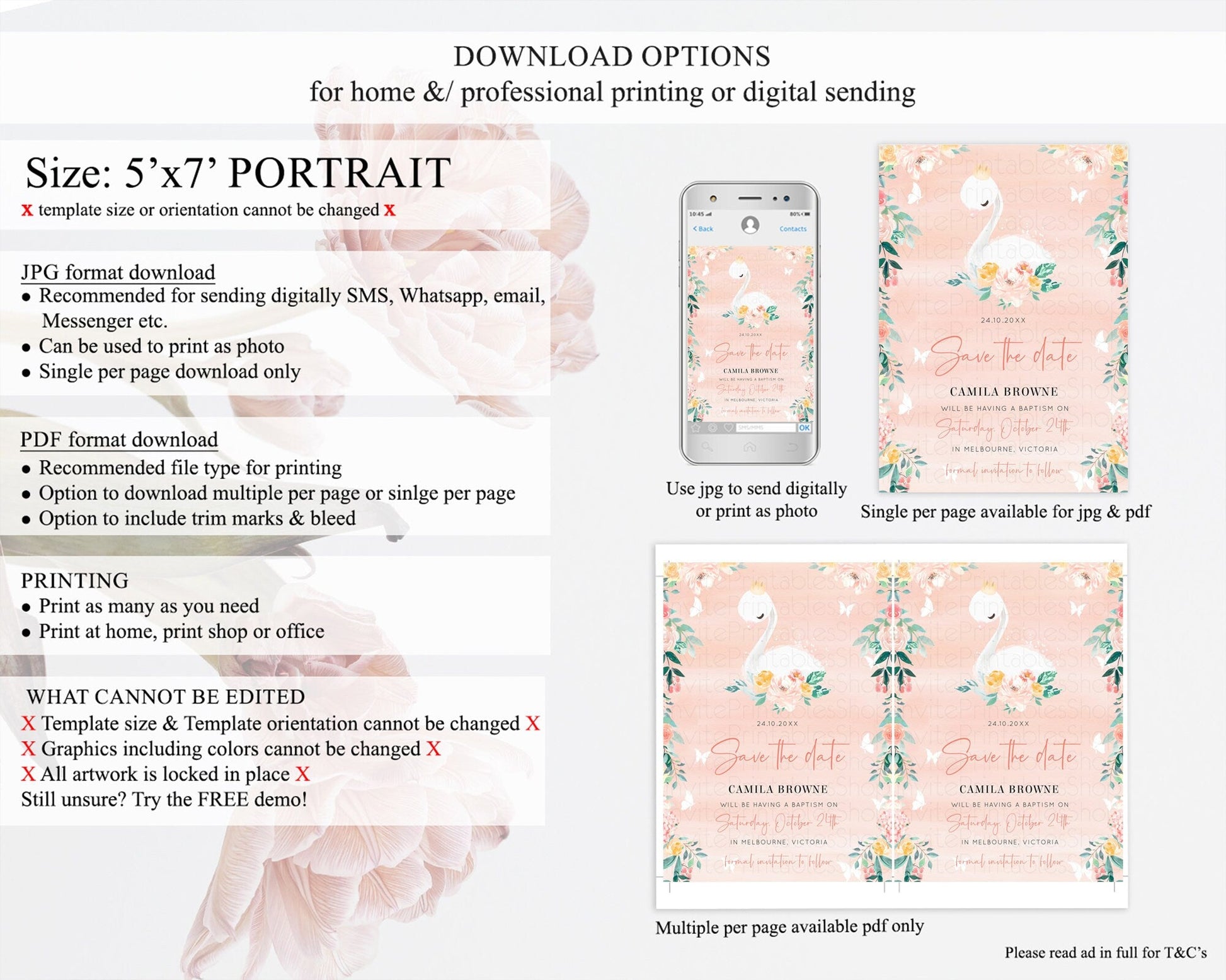 Swan Save The Date Template Swan Princess Ballet Party Enchanted Swan Lake Secret Garden Pastel Floral Birthday Baptism Baby Shower D10884