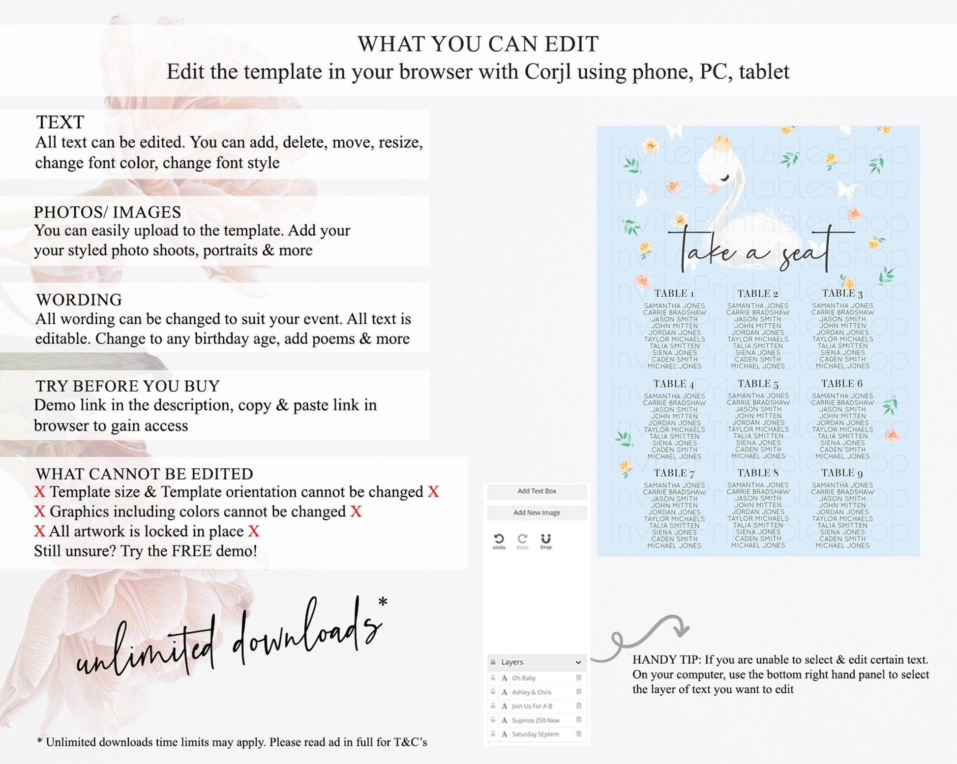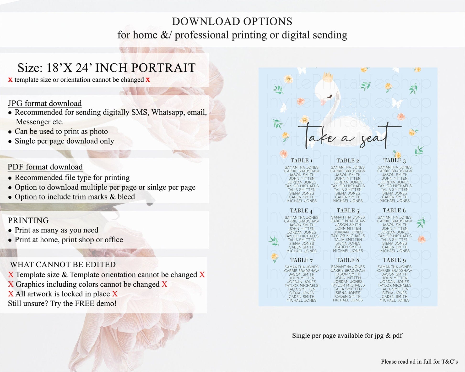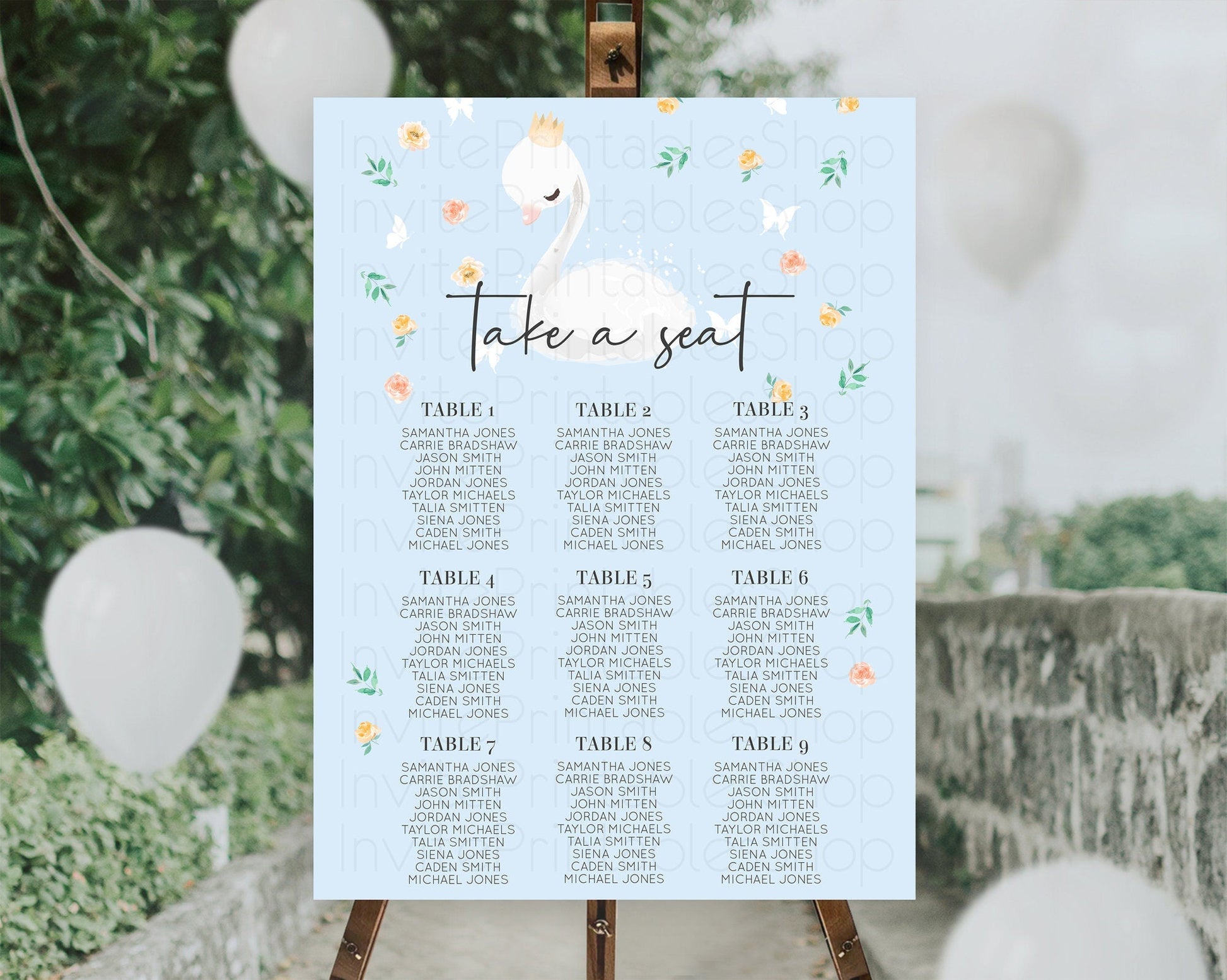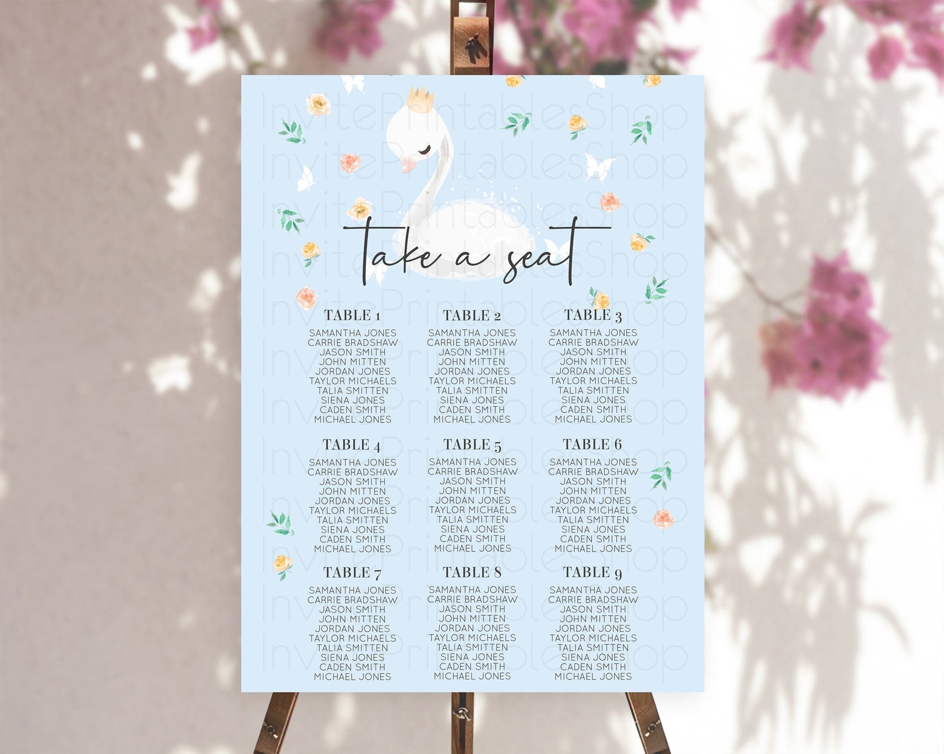 Swan Seating Chart Swan Princess Ballet Seating Sign Watercolour Pastel Floral Enchanted Forest Swan Lake Party Decor Secret Garden D10903