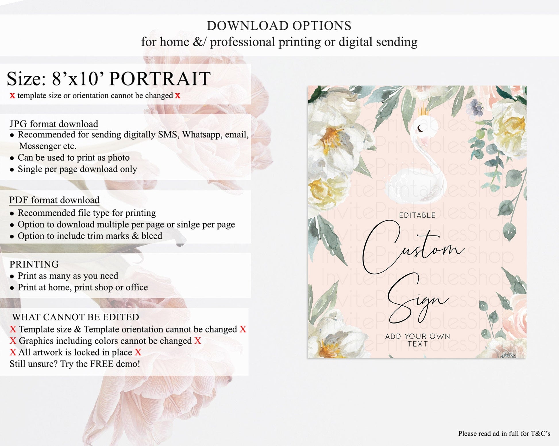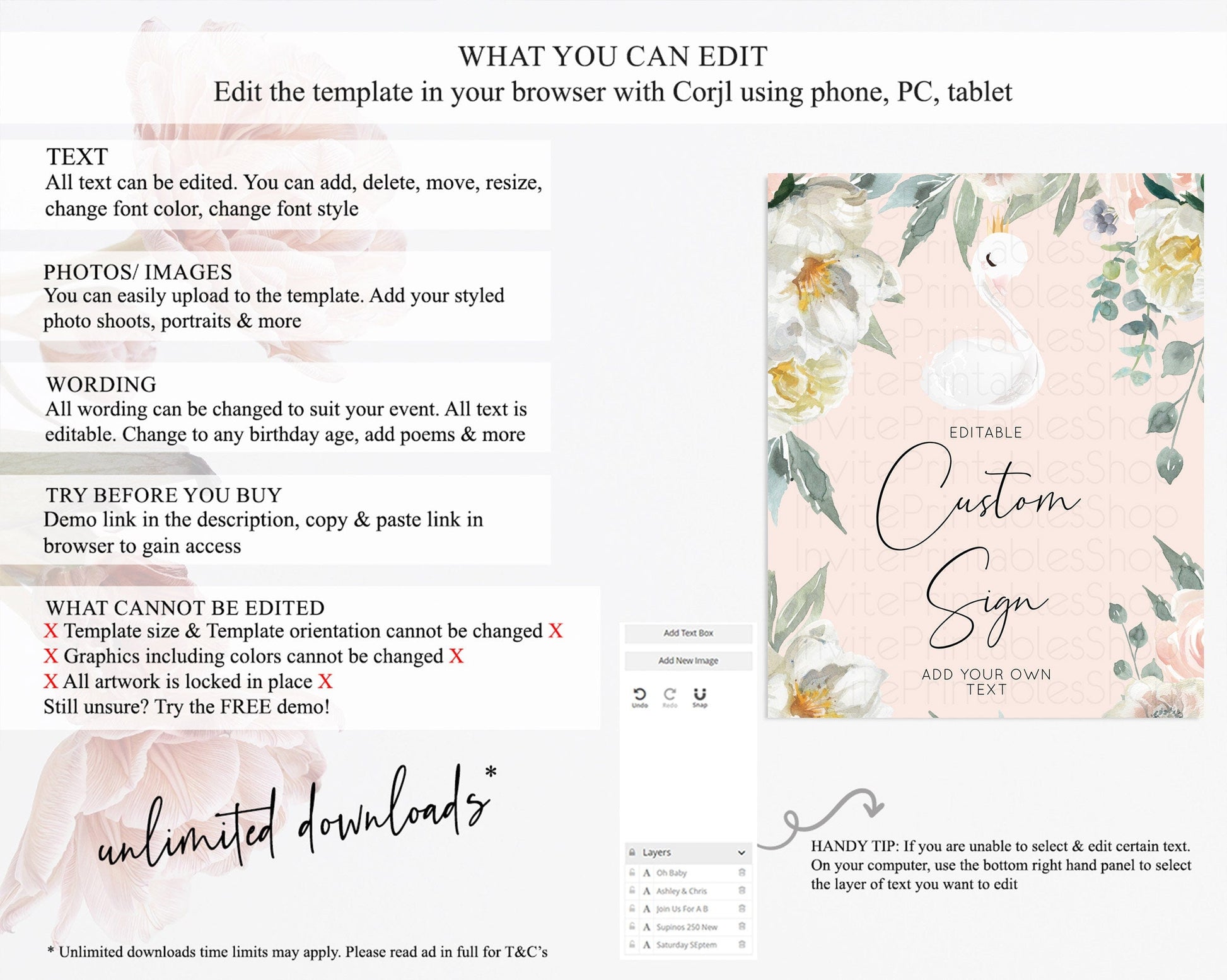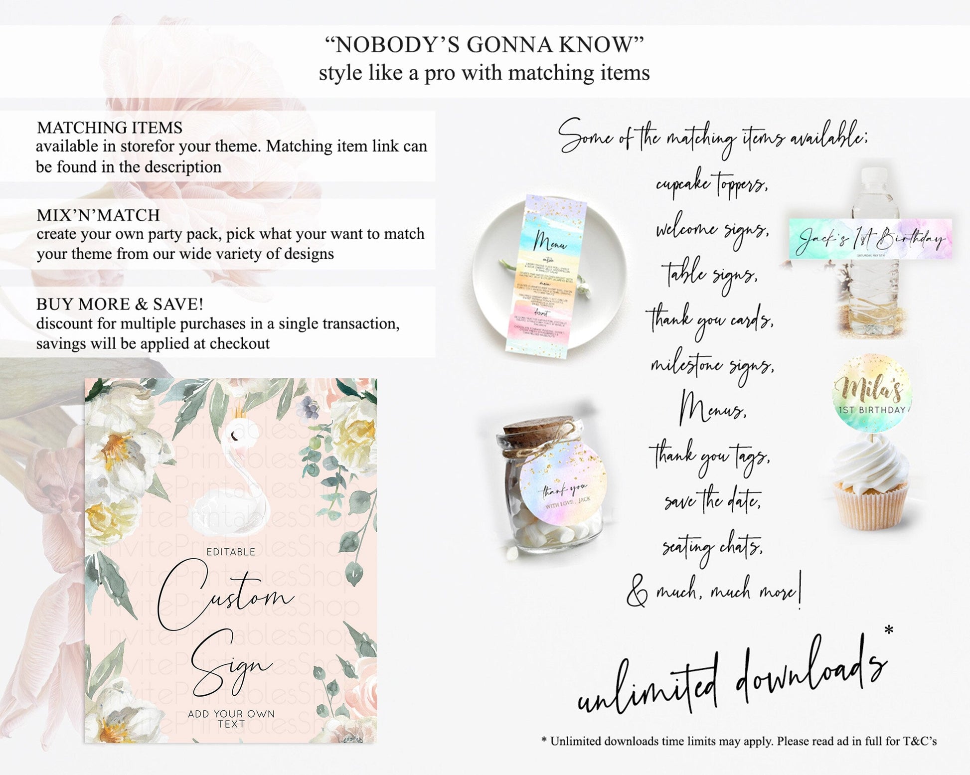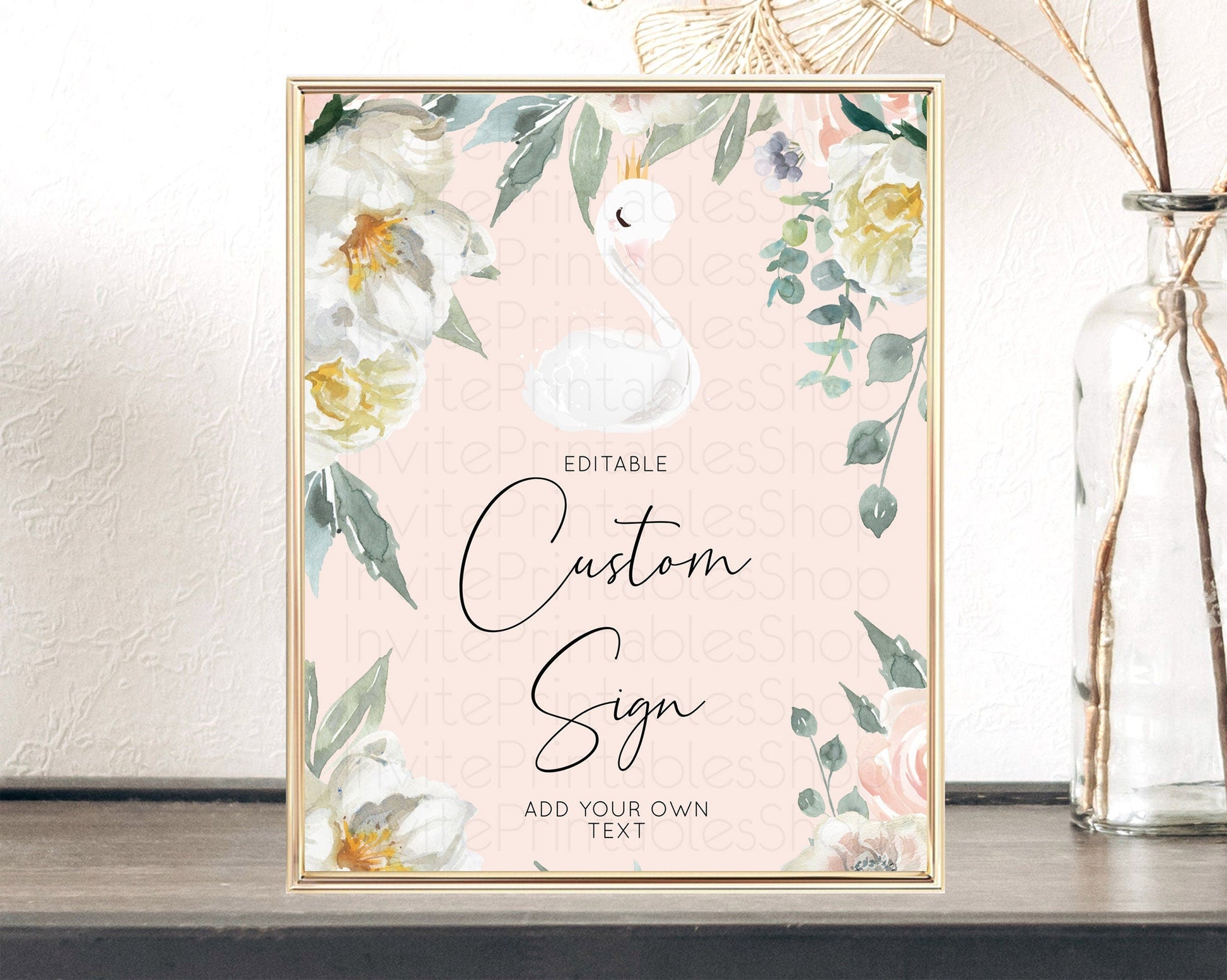 Swan Table Sign Decor Swan Princess Ballet Party Enchanted Swan Lake Secret Garden Pastel Floral 1st Birthday Baptism Baby Shower D10755