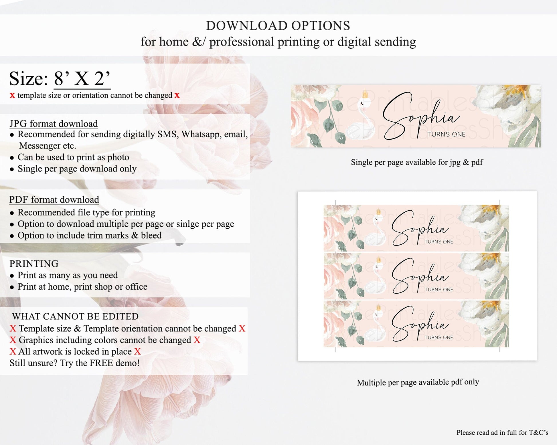 Swan Water Label Template Swan Princess Ballet Party Decor Enchanted Secret Garden Pastel Floral Birthday Baptism Baby Shower D10755