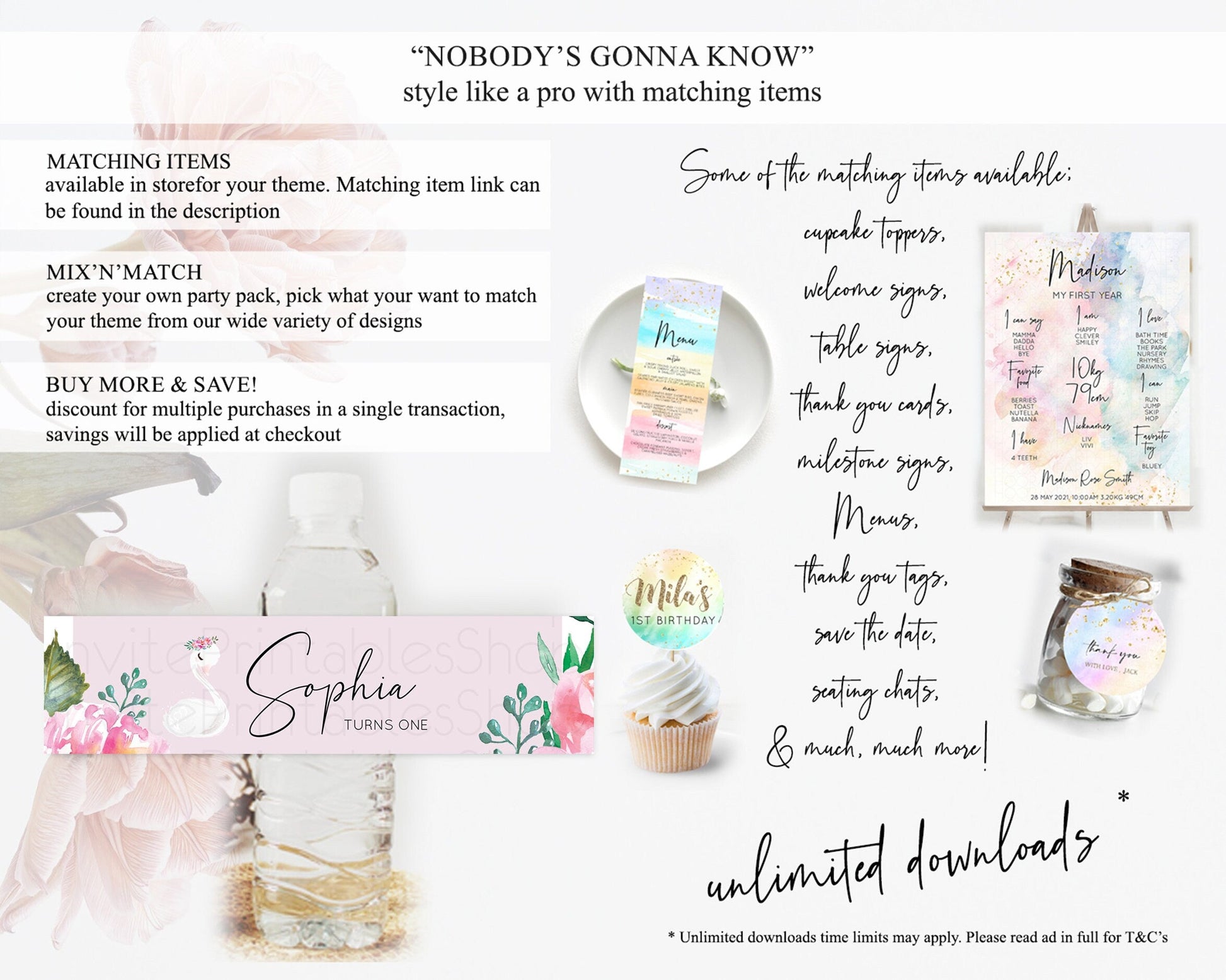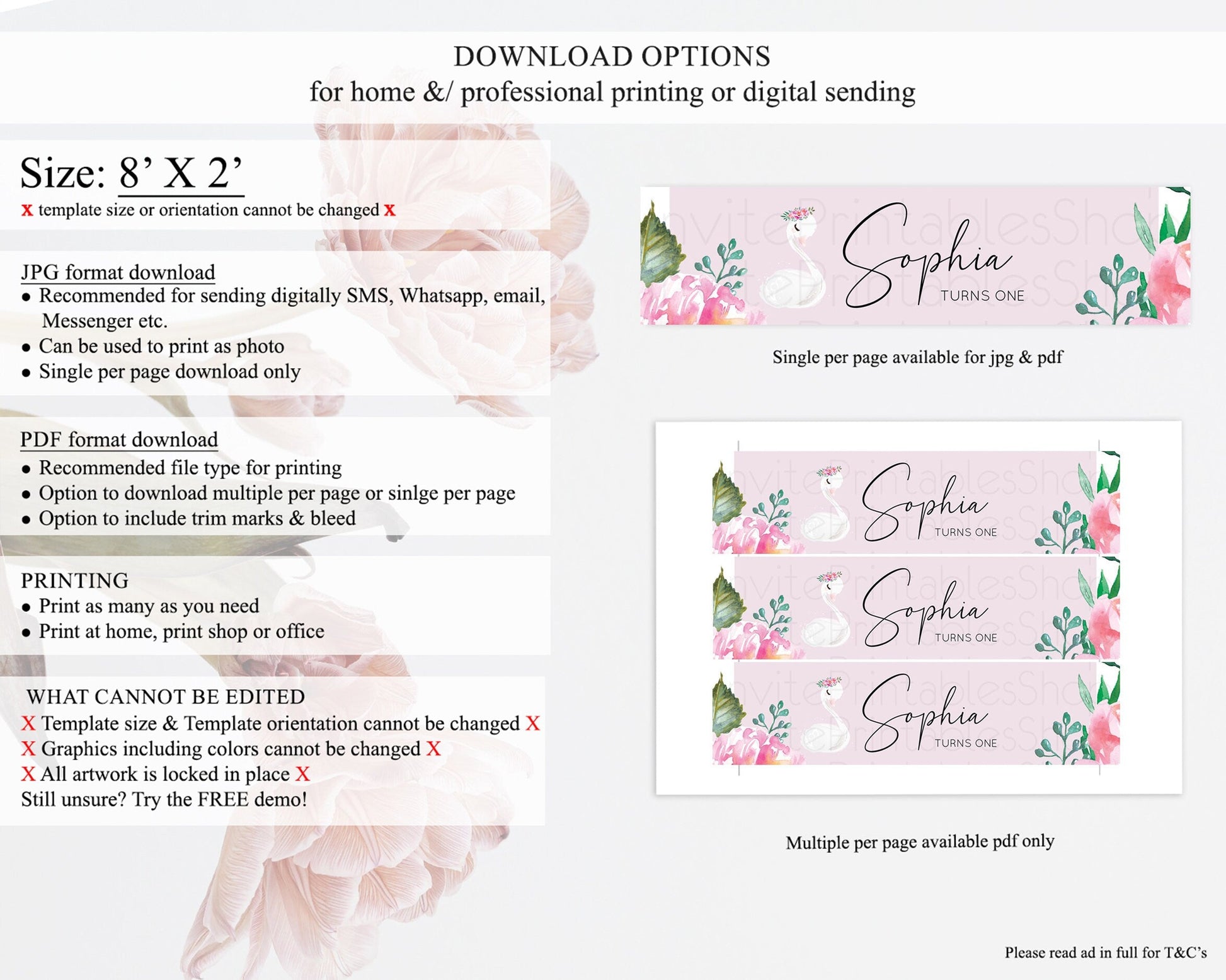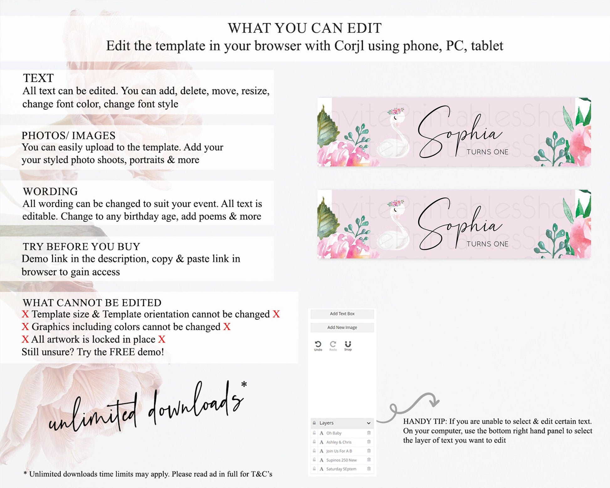 Swan Water Label Template Swan Princess Ballet Party Decor Enchanted Secret Garden Pastel Floral Birthday Baptism Baby Shower D10757