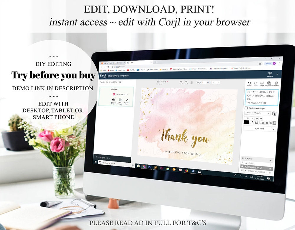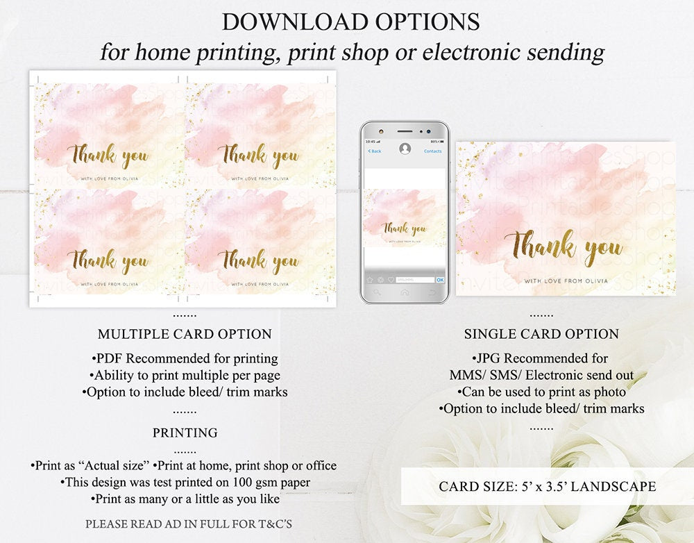 •Try before you buy! • DEMO LINK- https://www.corjl.com/d/26MG3F PLEASE READ AD IN FULL!! •Digital file. No physical item will be shipped •Do it yourself Editing. Edit online with Corjl or Edit with your mobile ITEM DETAILS Thank you cards Card size: 5’x3.5’ File type: PDF, JPEG Resolution: 300DPI PDF FILE OPTIONS: •Recommended for printing •Ability to print multiple per page (if size permits) •Option to include bleed/ trim marks JPG FILE OPTIONS: •Recommended for MMS/ SMS/ Electronic send out •Can be used to print as photo •Option to include bleed/ trim marks EDITING • Do it yourself editing • Mobile editing is available • Google chrome is the recommend browser for Corjl. Please download here for FREE: https://www.google.com/chrome/ • Using other browsers may not show all of Corjl's editing features • Editing on a desktop/ laptop computer is recommended to access all of Corjl features • Mobile editing is available, please use a desktop/ laptop computer to access all of Corjl features DOWNLOADS & EXPIRY •Maximum 3 downloads on the same edit •Link expires 30 days after purchase DOWNLOAD NOTICE •Once you have reached your download limits &/ “approve proof” in Corjl. You will not be able to request further downloads on your design. Further download requests are not permitted WHAT IS EDITABLE •Text - colours, fonts, size, move, delete & rotation. •Please see demo link for what you can and can’t do WHAT YOU CAN’T EDIT •Template size •Template orientation •Graphics CAN NOT BE deleted, moved, or changed in colour •Please see demo link for what you can and can’t do HOW TO 1. Choose design template & checkout on Etsy. 2. Email will be sent from Corjl. Follow link to access template 3. Edit, save & print INSTRUCTIONS •Instructions on how to edit your design have been written by Corjl and will be available with your purchase. PRINTING •Colours can vary depending on the monitor, printer & cardstock •Can be printed at home •Home printing will require you to select the high quality print settings, select appropriate paper thickness & click "Actual size" prior to you printing •This design was test printed on 100 gsm paper •Can be printed at local print shop. Please check printing requirements & any printing restrictions prior to purchase PERSONAL USE ONLY. This item cannot be shared, re-sold, or used commercially for profit. REFUND POLICY •We are unable to provide a refund/ exchange on commenced & completed work, instant downloads or self-editing link templates. Please use the demo link to work out if this product is right for you. Copyright © 2018 by InvitePrintablesShop PTY LTD All rights reserved. This file or any portion thereof may not be reproduced or resold without the express written permission of the publisher (including edits to the design). Our files are provided as high-resolution PDFs – the end result is dependent upon the printer and paper used. If using a professional printing company, InvitePrintablesShop are not responsible for their specific printing requirements, paper or colour quality. Any changes required to the template are not included with your purchase – the files come as described in the listing only and cannot be changed. Thank you for visiting Invite Printables Shop:) #abcdef12345