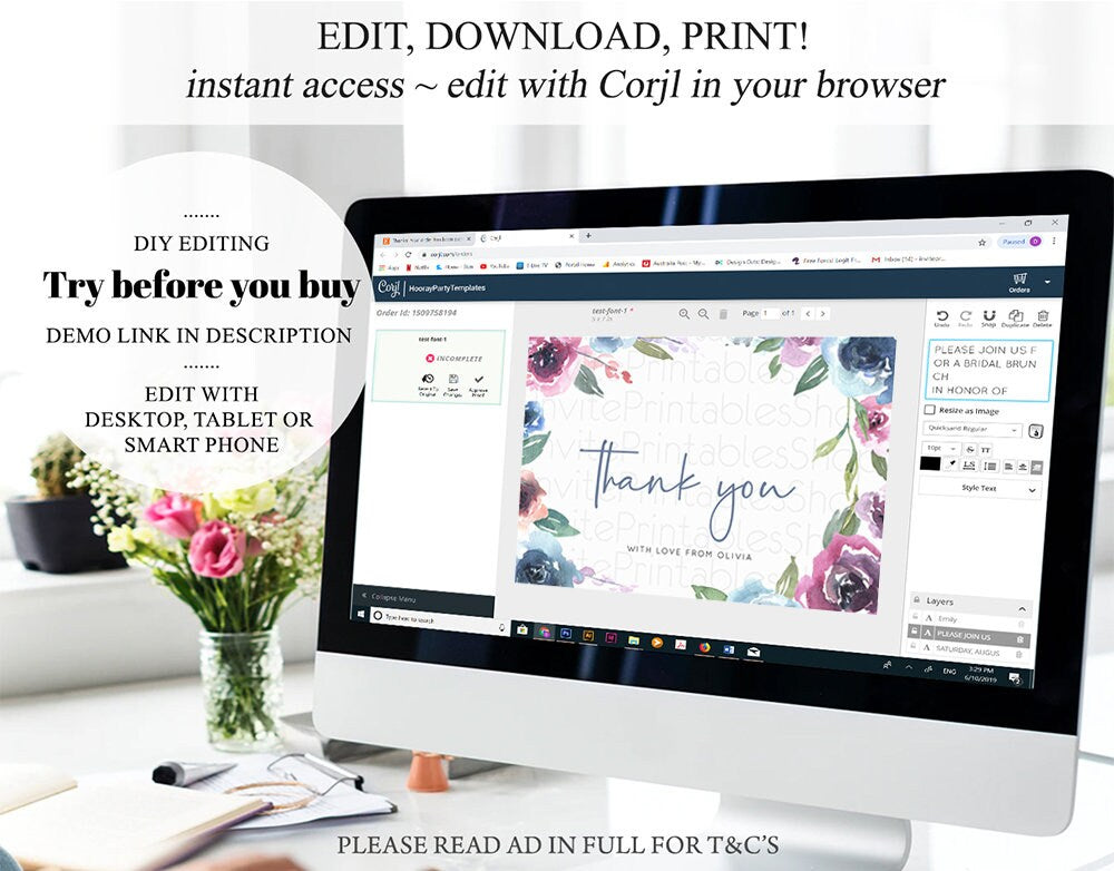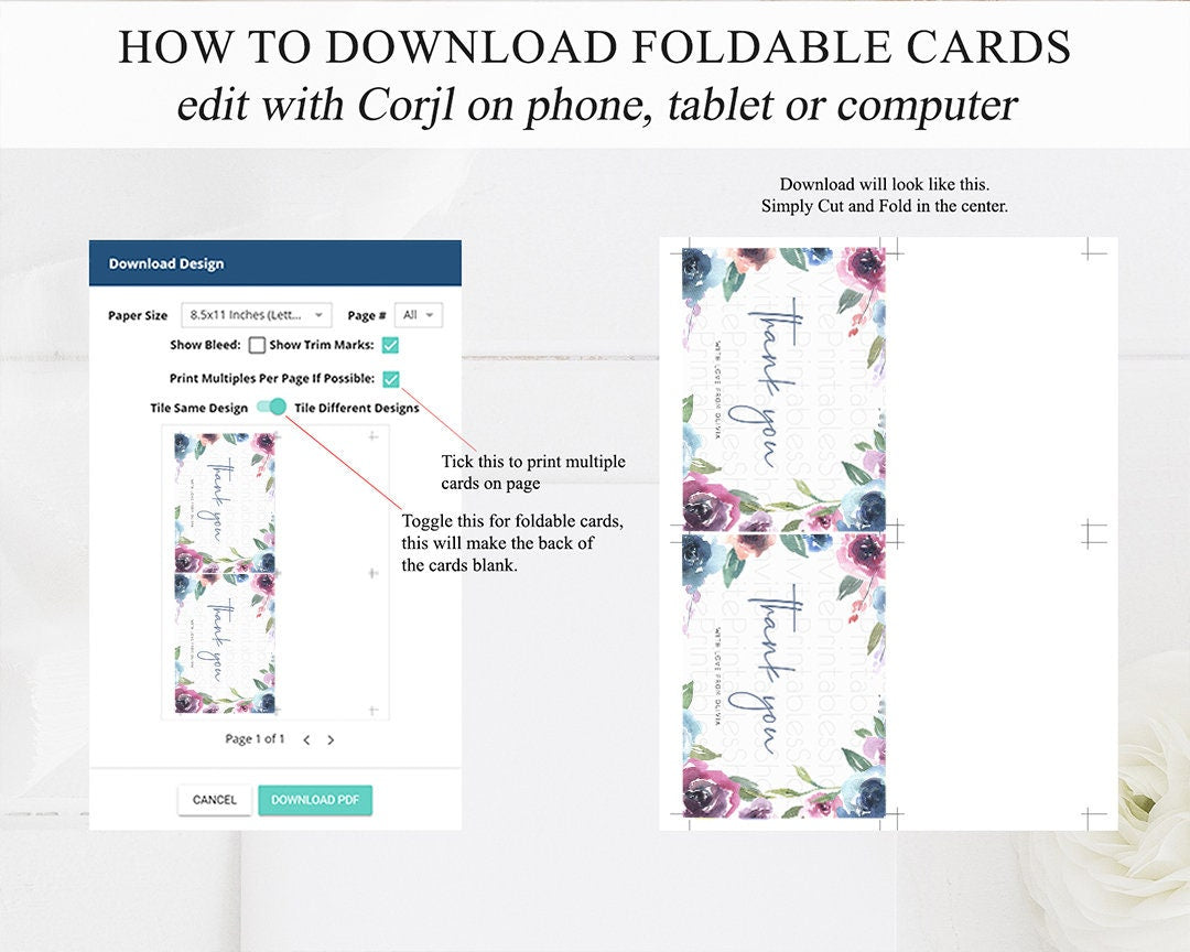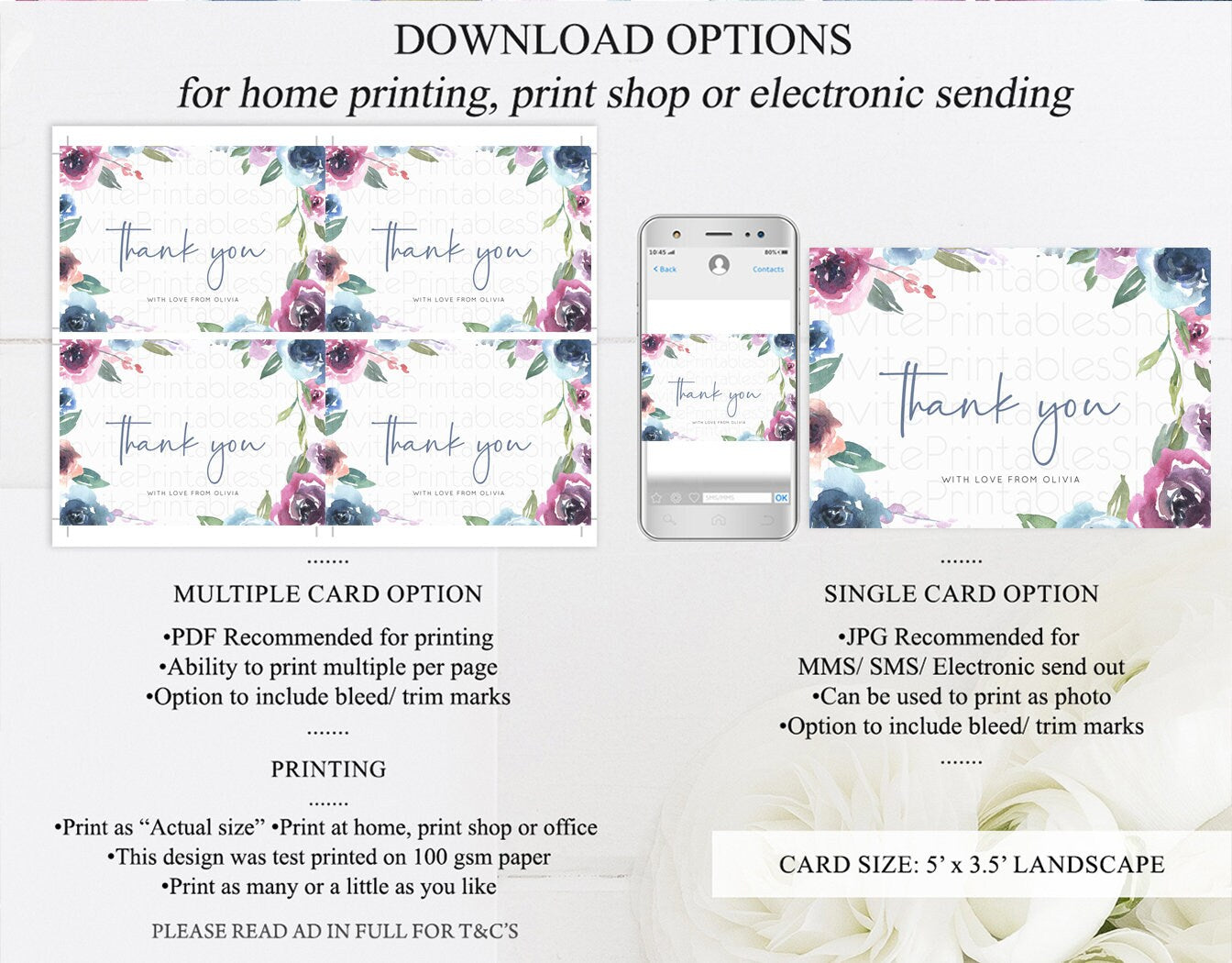 •Try before you buy! • DEMO LINK- https://www.corjl.com/d/2JPAB2 PLEASE READ AD IN FULL!! •Digital file. No physical item will be shipped •Do it yourself Editing. Edit online with Corjl or Edit with your mobile ITEM DETAILS Thank you cards Card size: 5’x3.5’ File type: PDF, JPEG Resolution: 300DPI PDF FILE OPTIONS: •Recommended for printing •Ability to print multiple per page (if size permits) •Option to include bleed/ trim marks JPG FILE OPTIONS: •Recommended for MMS/ SMS/ Electronic send out •Can be used to print as photo •Option to include bleed/ trim marks EDITING • Do it yourself editing • Mobile editing is available • Google chrome is the recommend browser for Corjl. Please download here for FREE: https://www.google.com/chrome/ • Using other browsers may not show all of Corjl's editing features • Editing on a desktop/ laptop computer is recommended to access all of Corjl features • Mobile editing is available, please use a desktop/ laptop computer to access all of Corjl features DOWNLOADS & EXPIRY •Maximum 3 downloads on the same edit •Link expires 30 days after purchase DOWNLOAD NOTICE •Once you have reached your download limits &/ “approve proof” in Corjl. You will not be able to request further downloads on your design. Further download requests are not permitted WHAT IS EDITABLE •Text - colours, fonts, size, move, delete & rotation. •Please see demo link for what you can and can’t do WHAT YOU CAN’T EDIT •Template size •Template orientation •Graphics CAN NOT BE deleted, moved, or changed in colour •Please see demo link for what you can and can’t do HOW TO 1. Choose design template & checkout on Etsy. 2. Email will be sent from Corjl. Follow link to access template 3. Edit, save & print INSTRUCTIONS •Instructions on how to edit your design have been written by Corjl and will be available with your purchase. PRINTING •Colours can vary depending on the monitor, printer & cardstock •Can be printed at home •Home printing will require you to select the high quality print settings, select appropriate paper thickness & click "Actual size" prior to you printing •This design was test printed on 100 gsm paper •Can be printed at local print shop. Please check printing requirements & any printing restrictions prior to purchase PERSONAL USE ONLY. This item cannot be shared, re-sold, or used commercially for profit. REFUND POLICY •We are unable to provide a refund/ exchange on commenced & completed work, instant downloads or self-editing link templates. Please use the demo link to work out if this product is right for you. Copyright © 2018 by InvitePrintablesShop PTY LTD All rights reserved. This file or any portion thereof may not be reproduced or resold without the express written permission of the publisher (including edits to the design). Our files are provided as high-resolution PDFs – the end result is dependent upon the printer and paper used. If using a professional printing company, InvitePrintablesShop are not responsible for their specific printing requirements, paper or colour quality. Any changes required to the template are not included with your purchase – the files come as described in the listing only and cannot be changed. Thank you for visiting Invite Printables Shop:) #abcdef12345