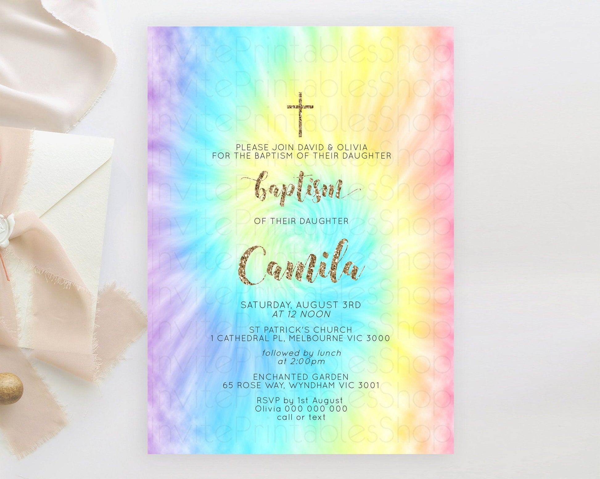 Tie Dye Baptism Invitation Rainbow Baptism 1st Birthday Invitation Pastel Ombre Colorful Christening Invitation Holy Communion D10580