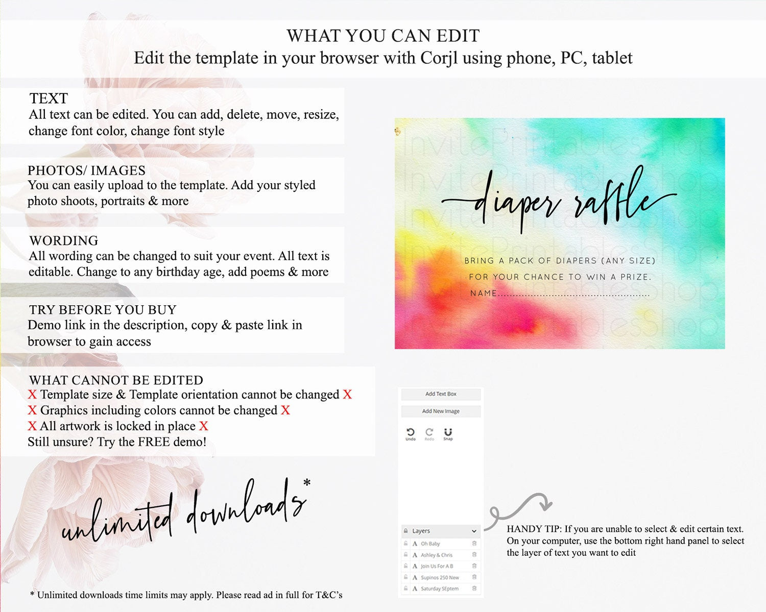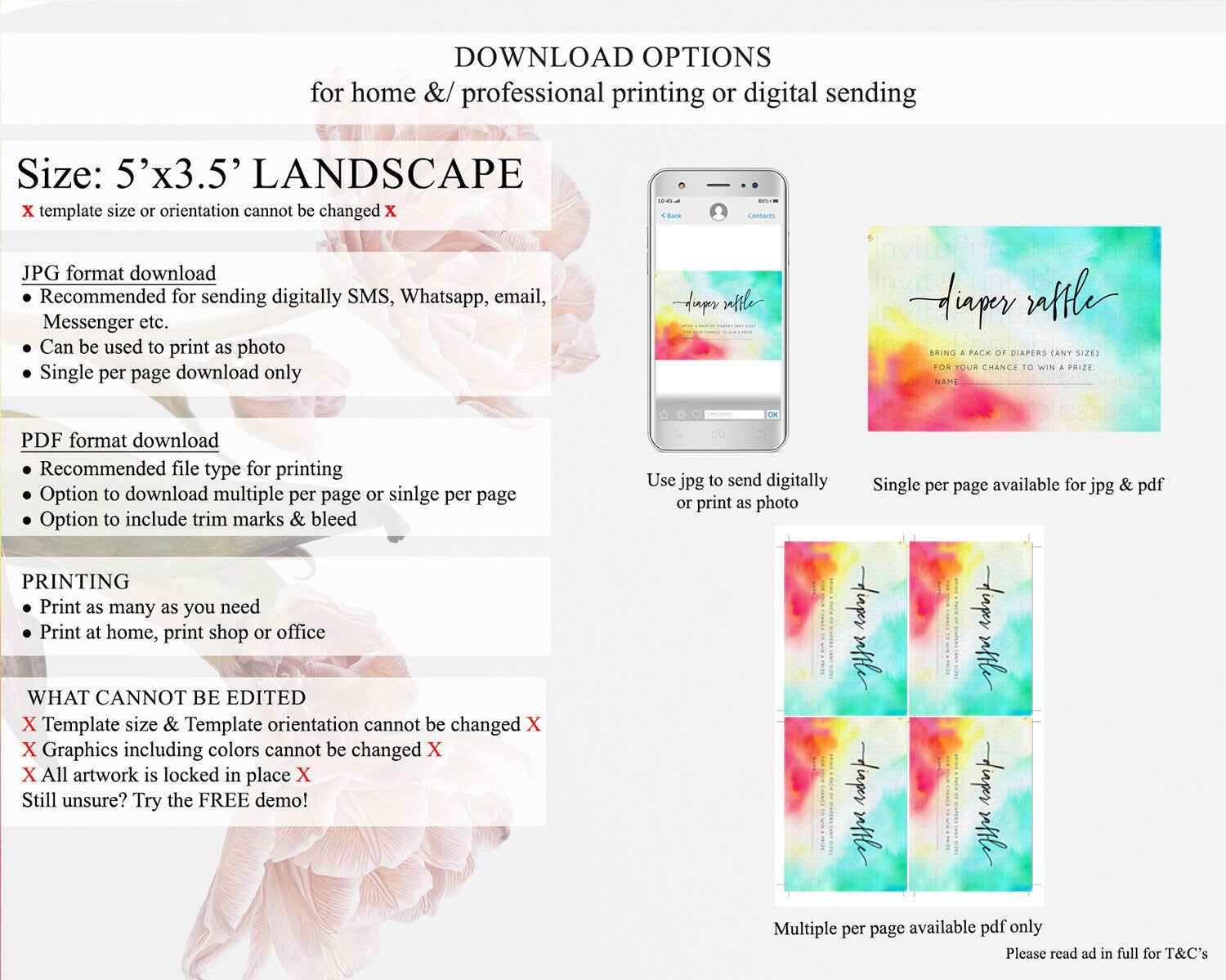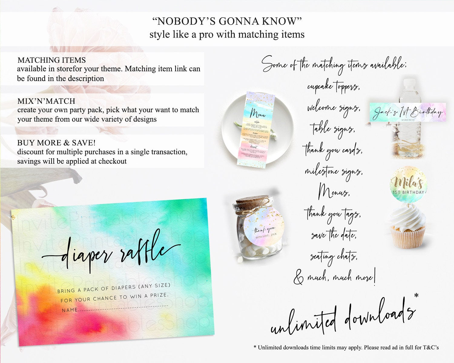 Tie Dye Diaper Raffle Card Rainbow Tie Dye Diaper Raffle Insert Pastel Rainbow Watercolor Diaper Ticket Tie Dye Colors Raffle Game D10462