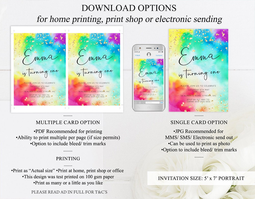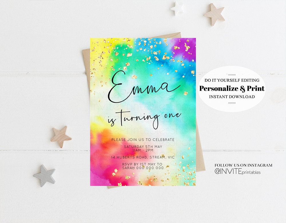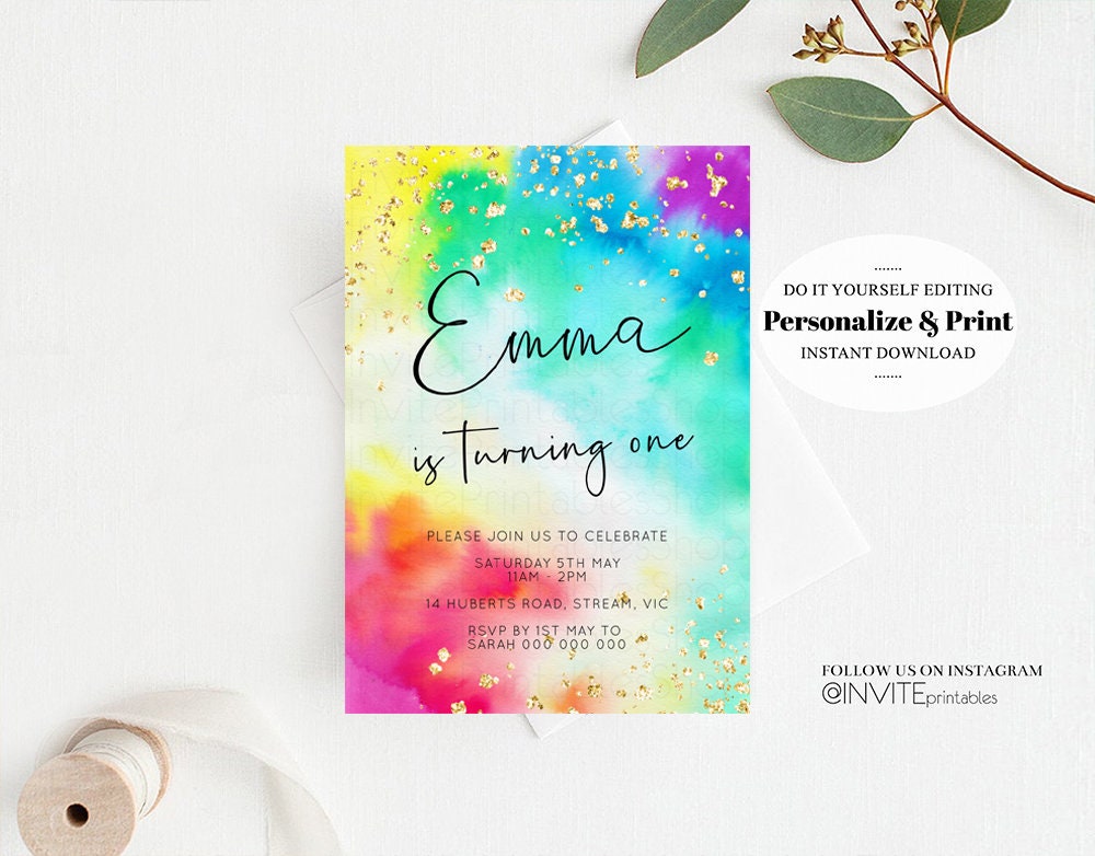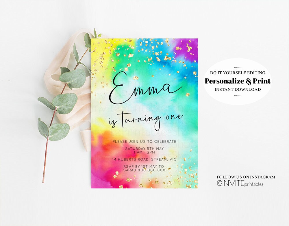 Tie Dye Rainbow Birthday Invitation Ombre Pastel Invitation Colorful Watercolor Splash Gold Glitter Sprinkles Printable Digital Invite 511