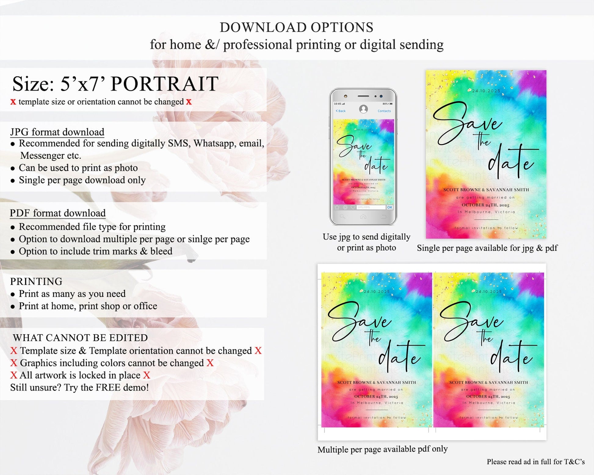 Tie Dye Save The Date Template Rainbow Pastel Ombre Watercolor Party For 1st Birthday Baptism Baby Shower Bridal Shower Wedding D10462