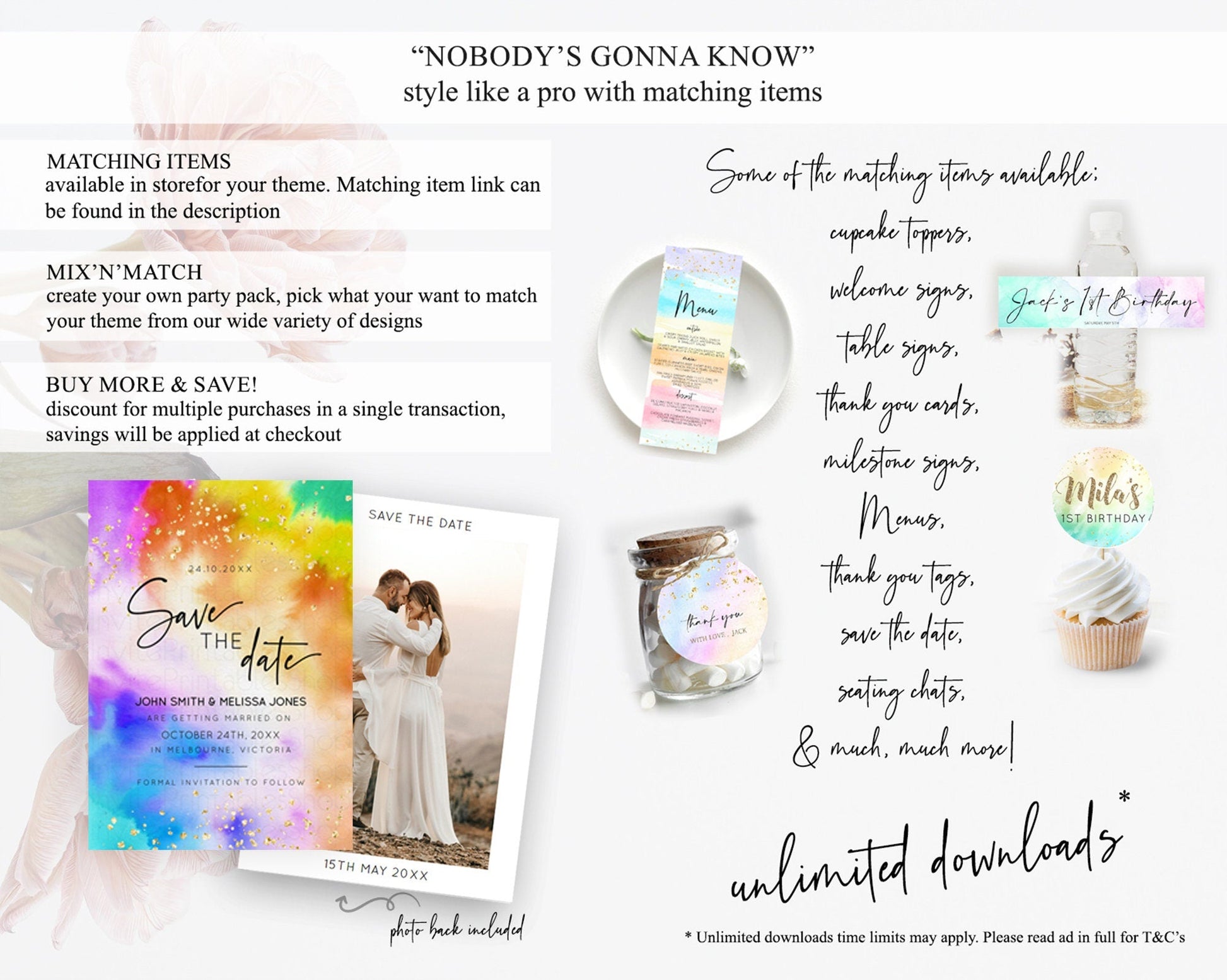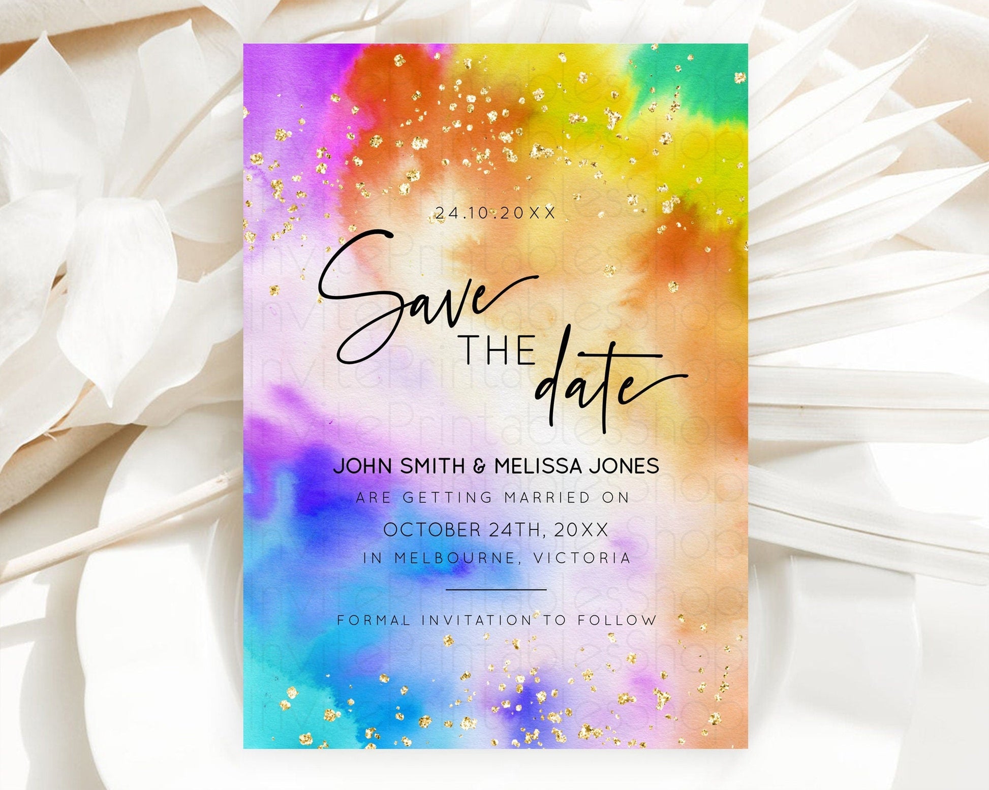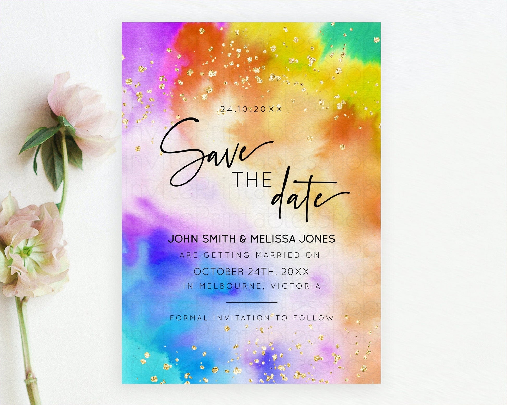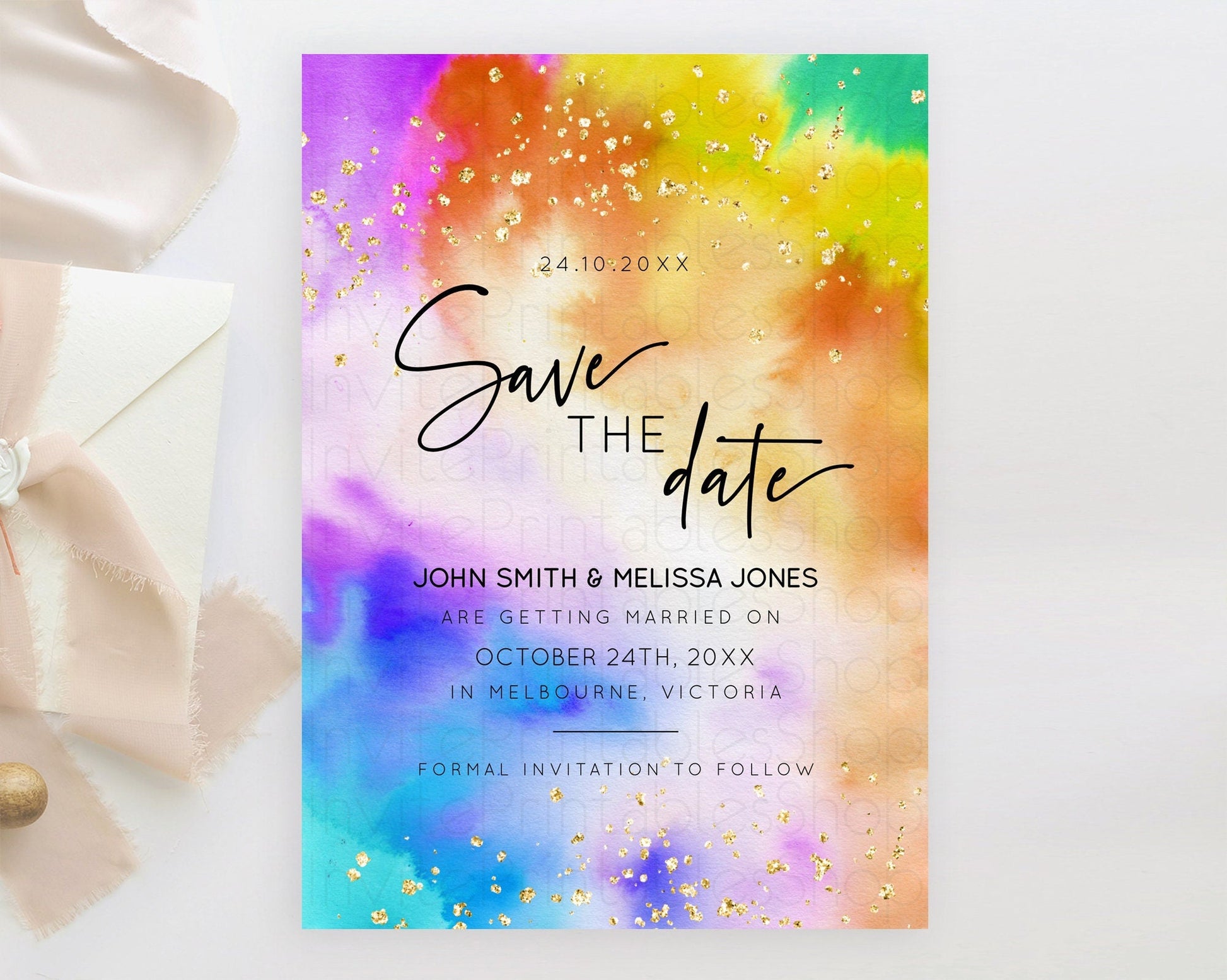 Tie Dye Save The Date Template Rainbow Pastel Ombre Watercolor Party For 1st Birthday Baptism Baby Shower Bridal Shower Wedding D10530