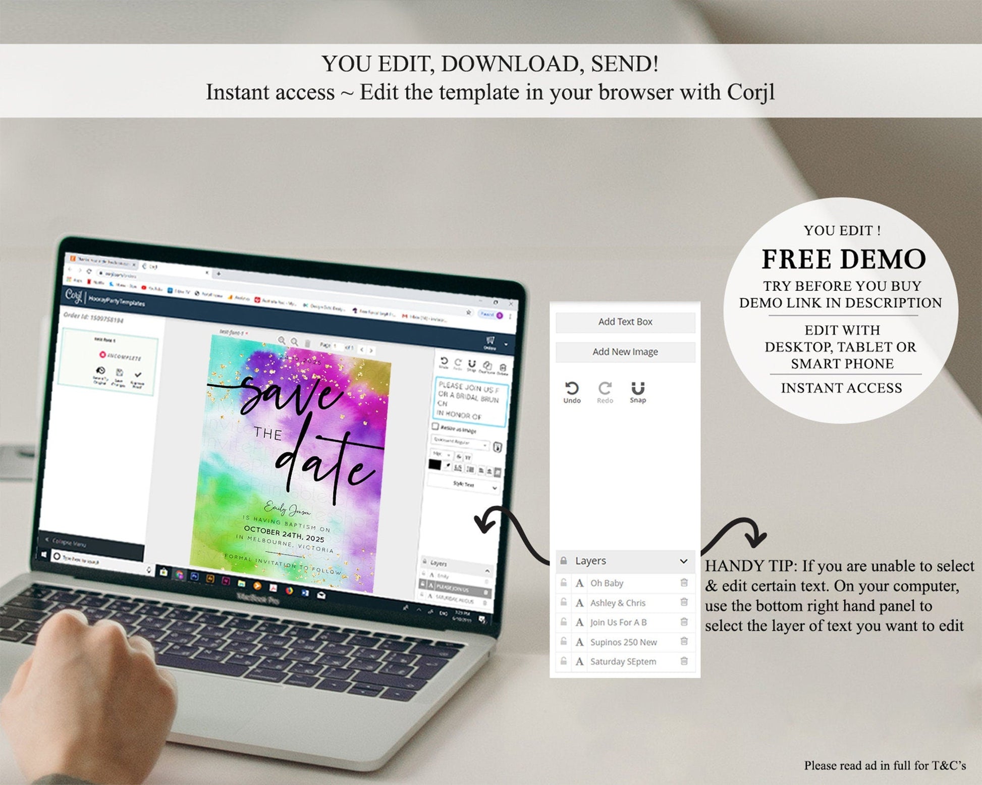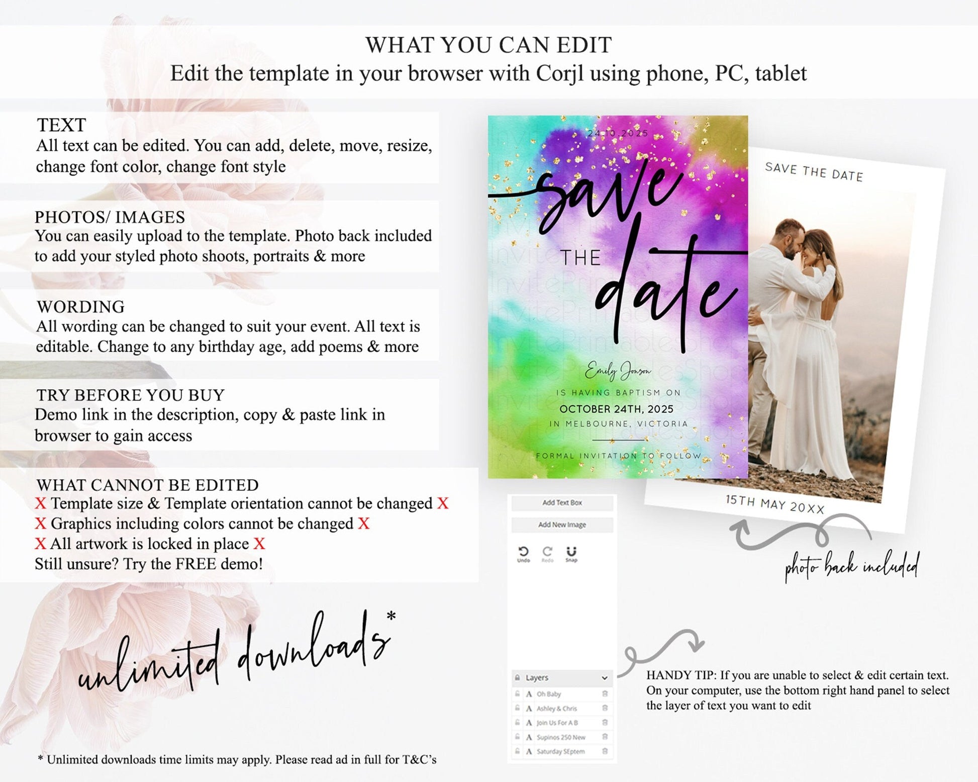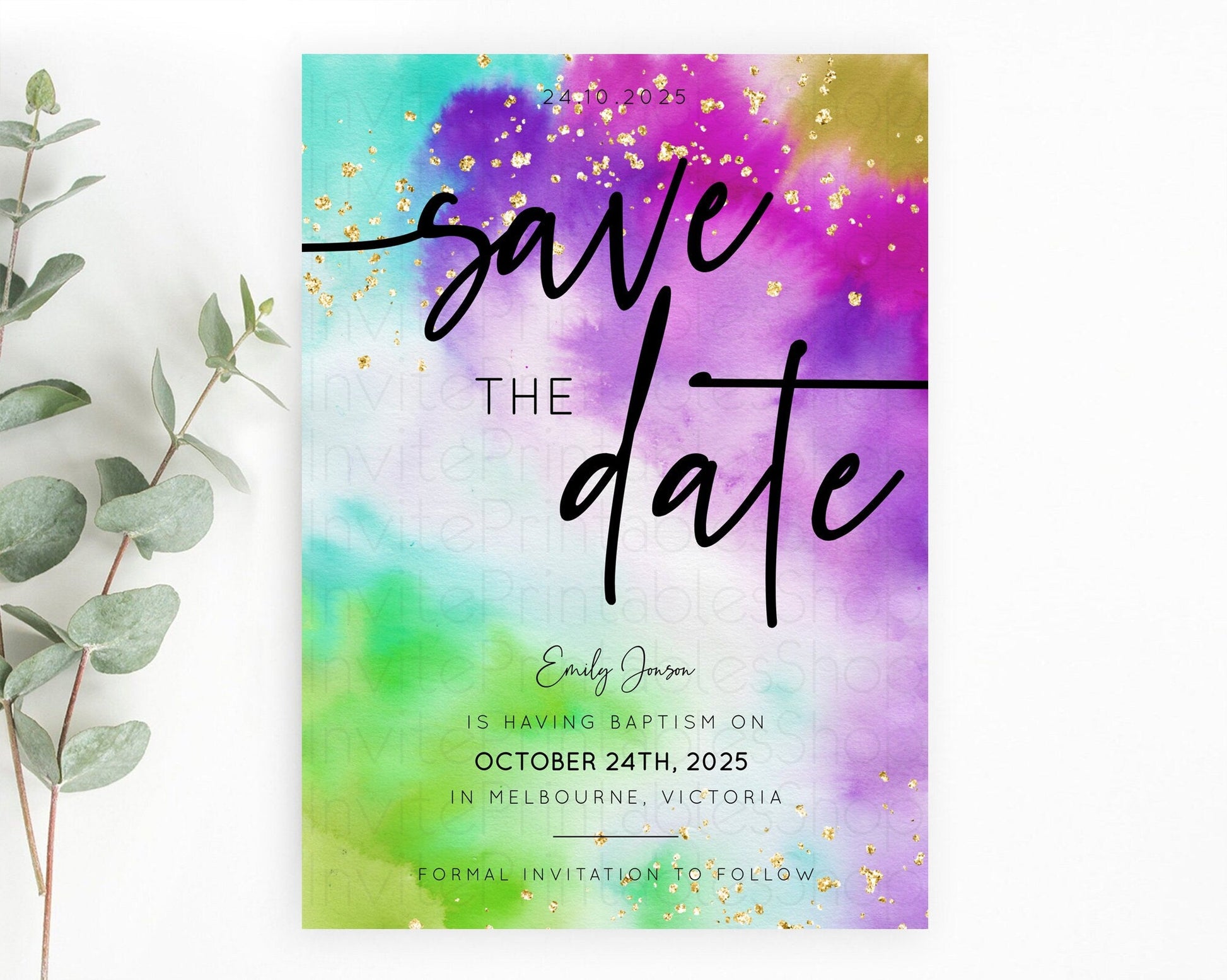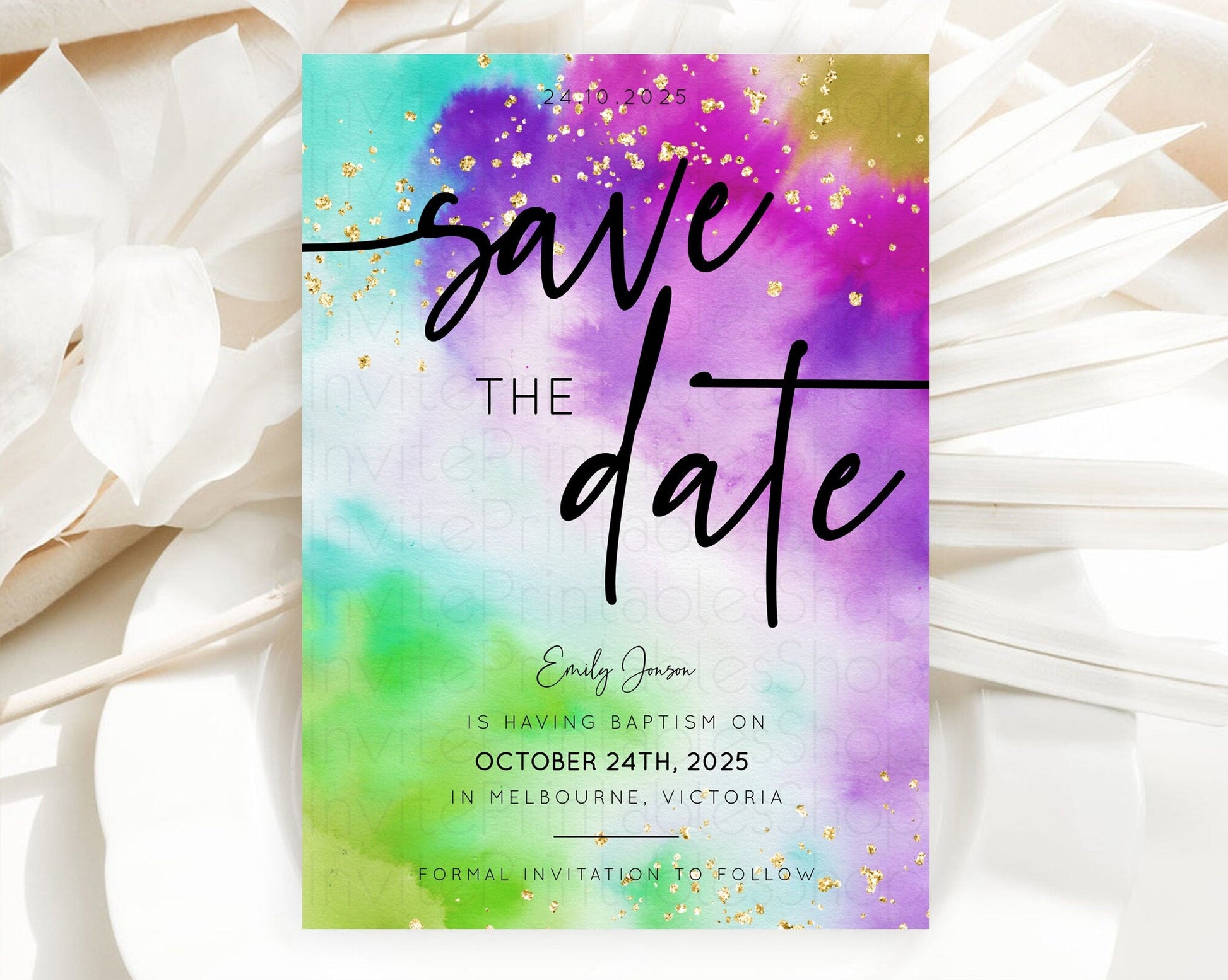 Tie Dye Save The Date Template Rainbow Pastel Ombre Watercolor Party For 1st Birthday Baptism Baby Shower Bridal Shower Wedding D10536