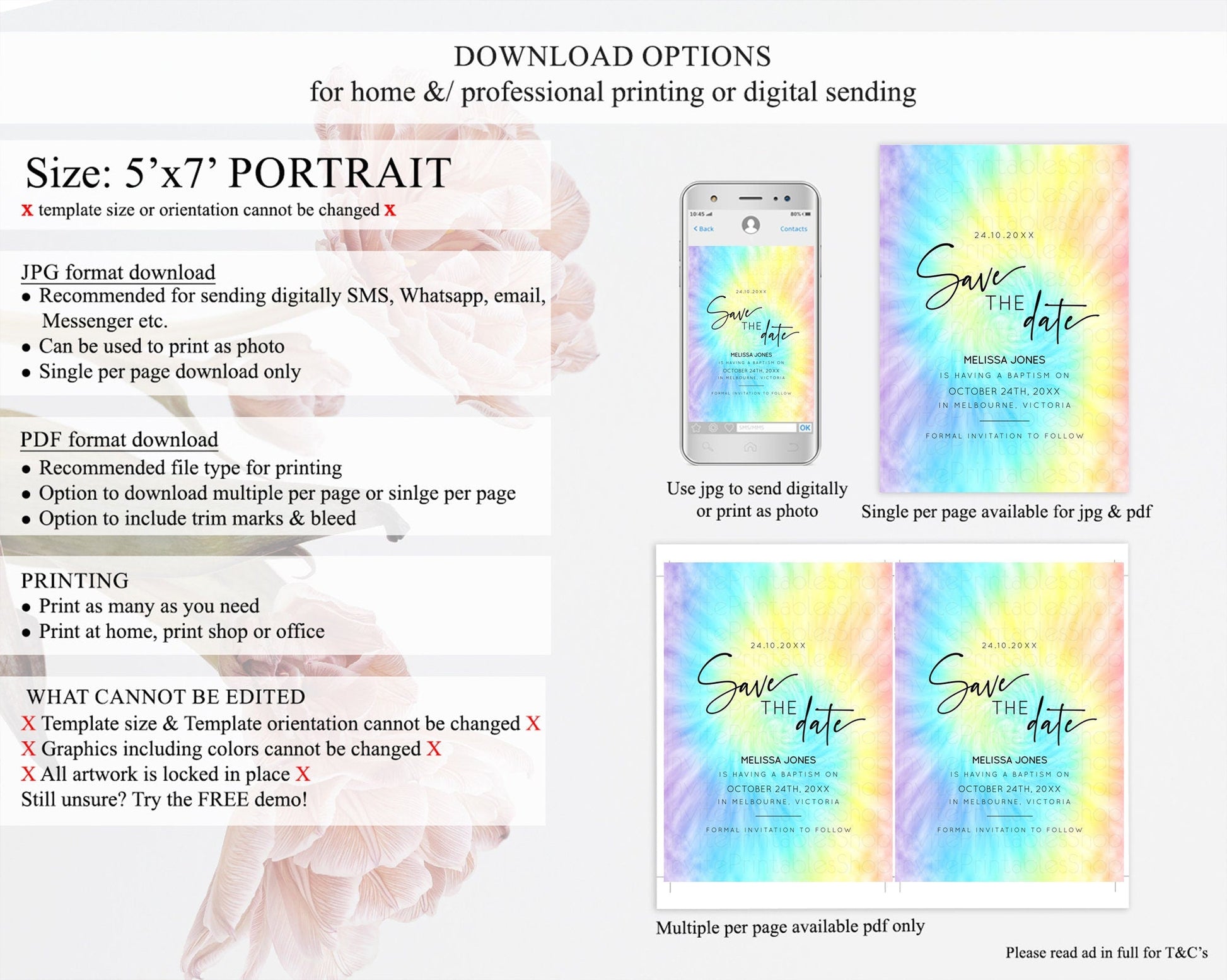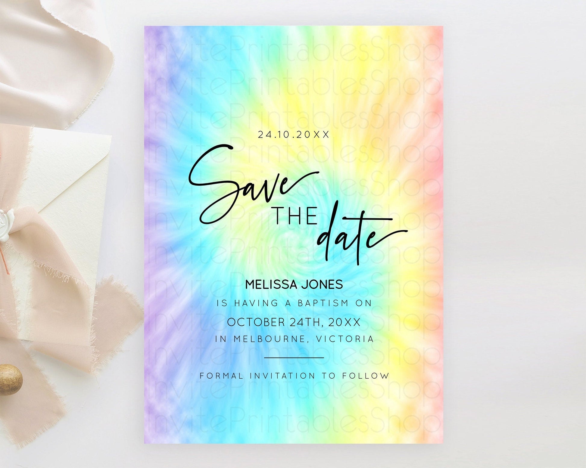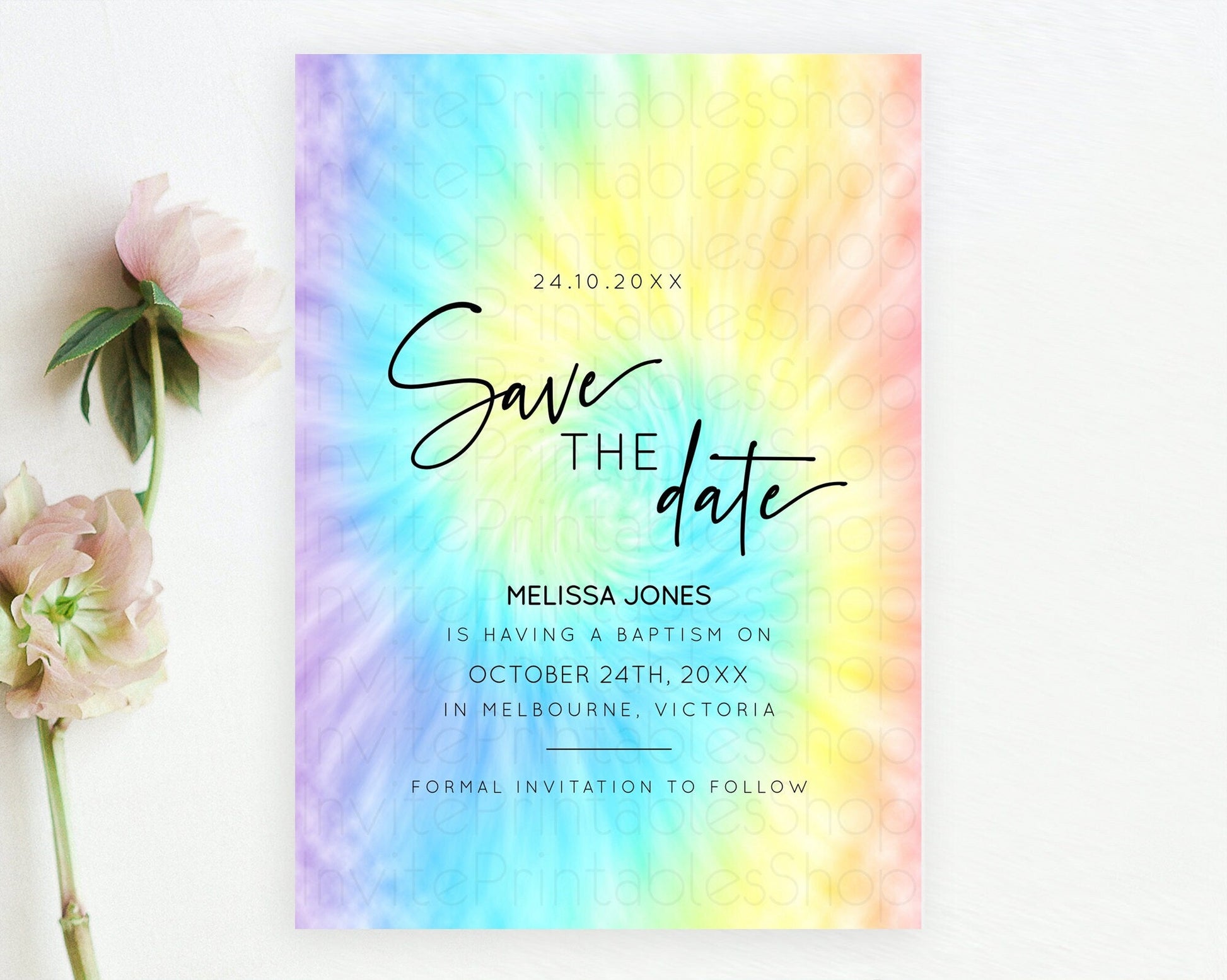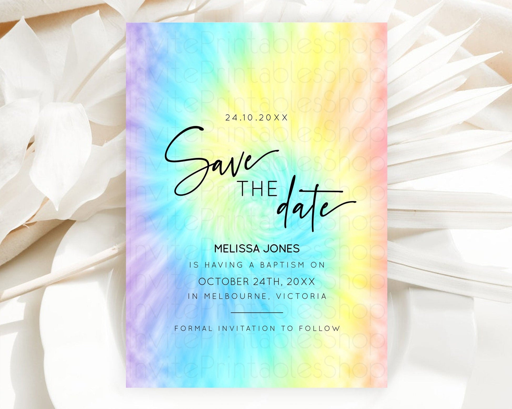 Tie Dye Save The Date Template Rainbow Pastel Ombre Watercolor Party For 1st Birthday Baptism Baby Shower Bridal Shower Wedding D10578