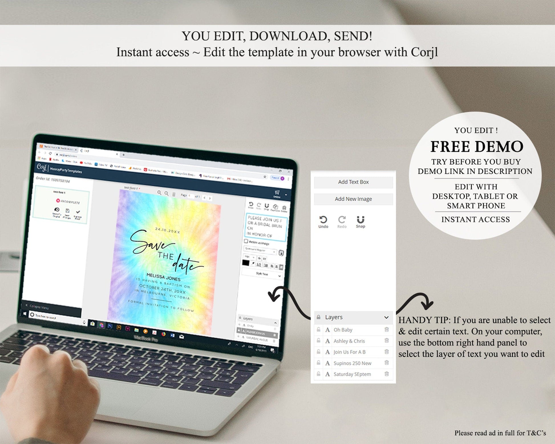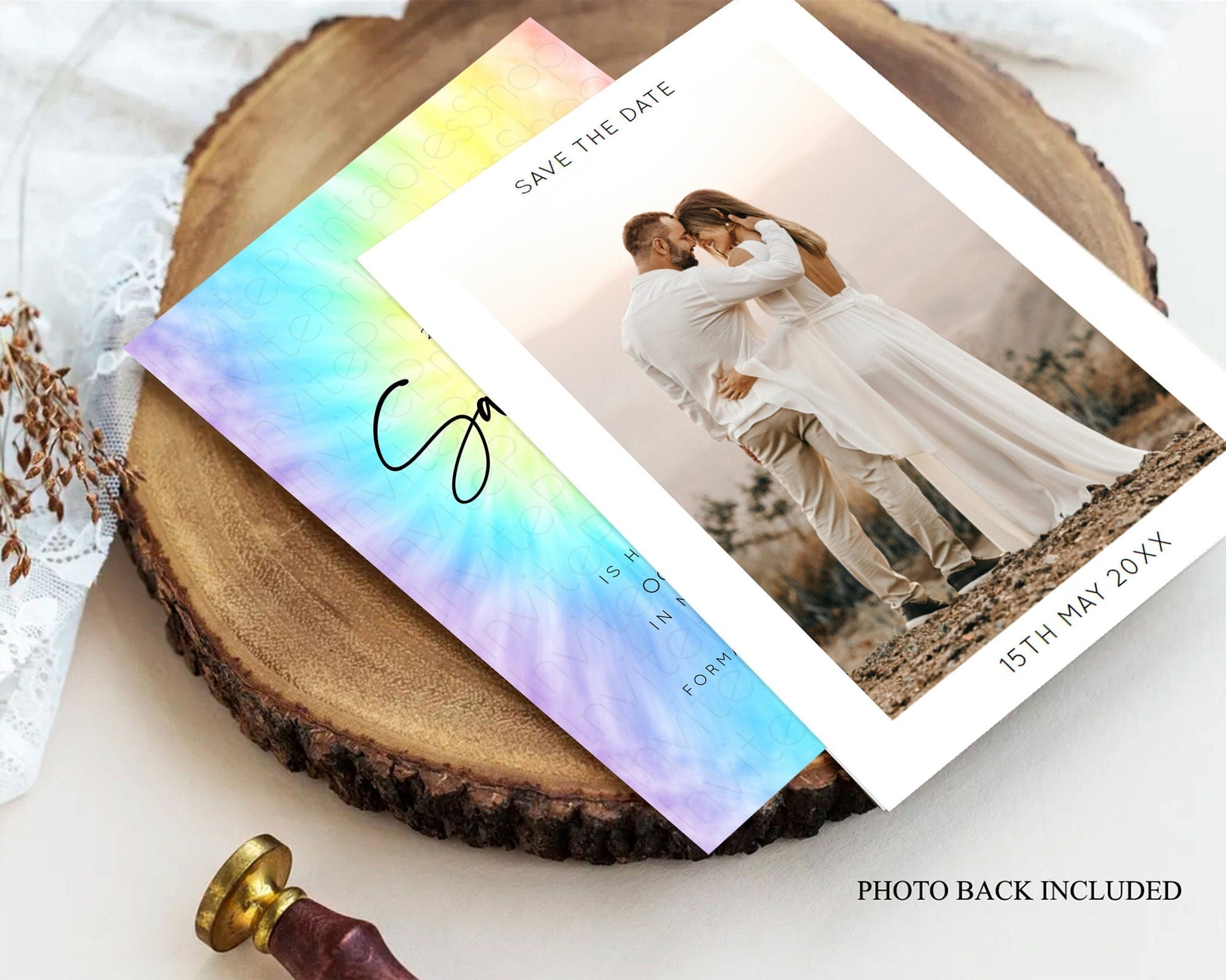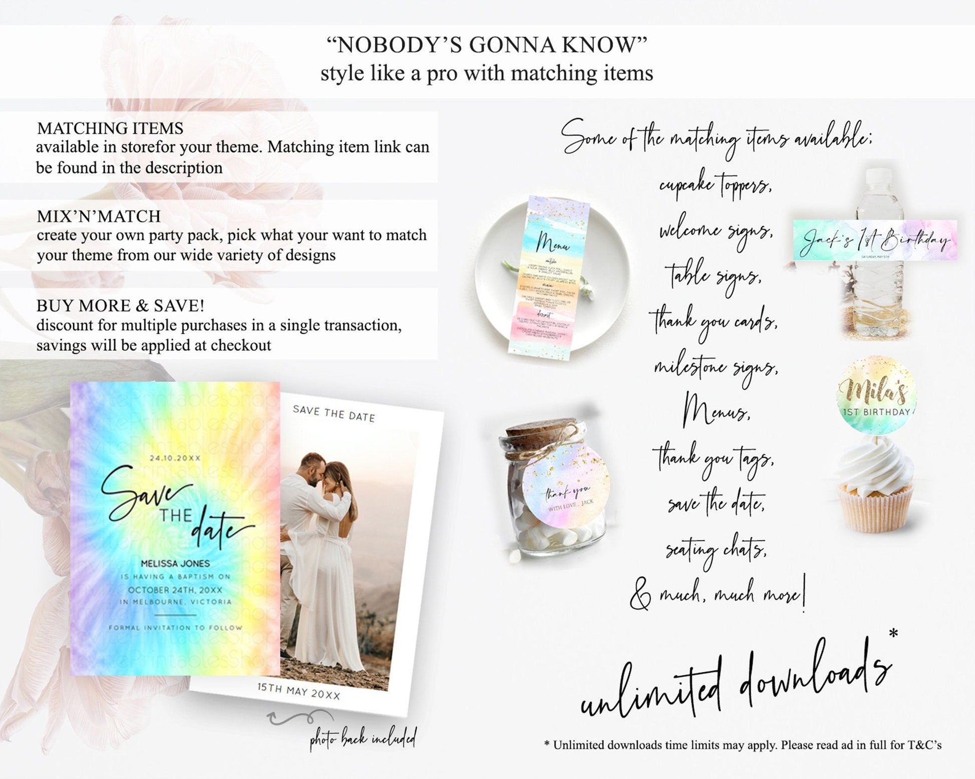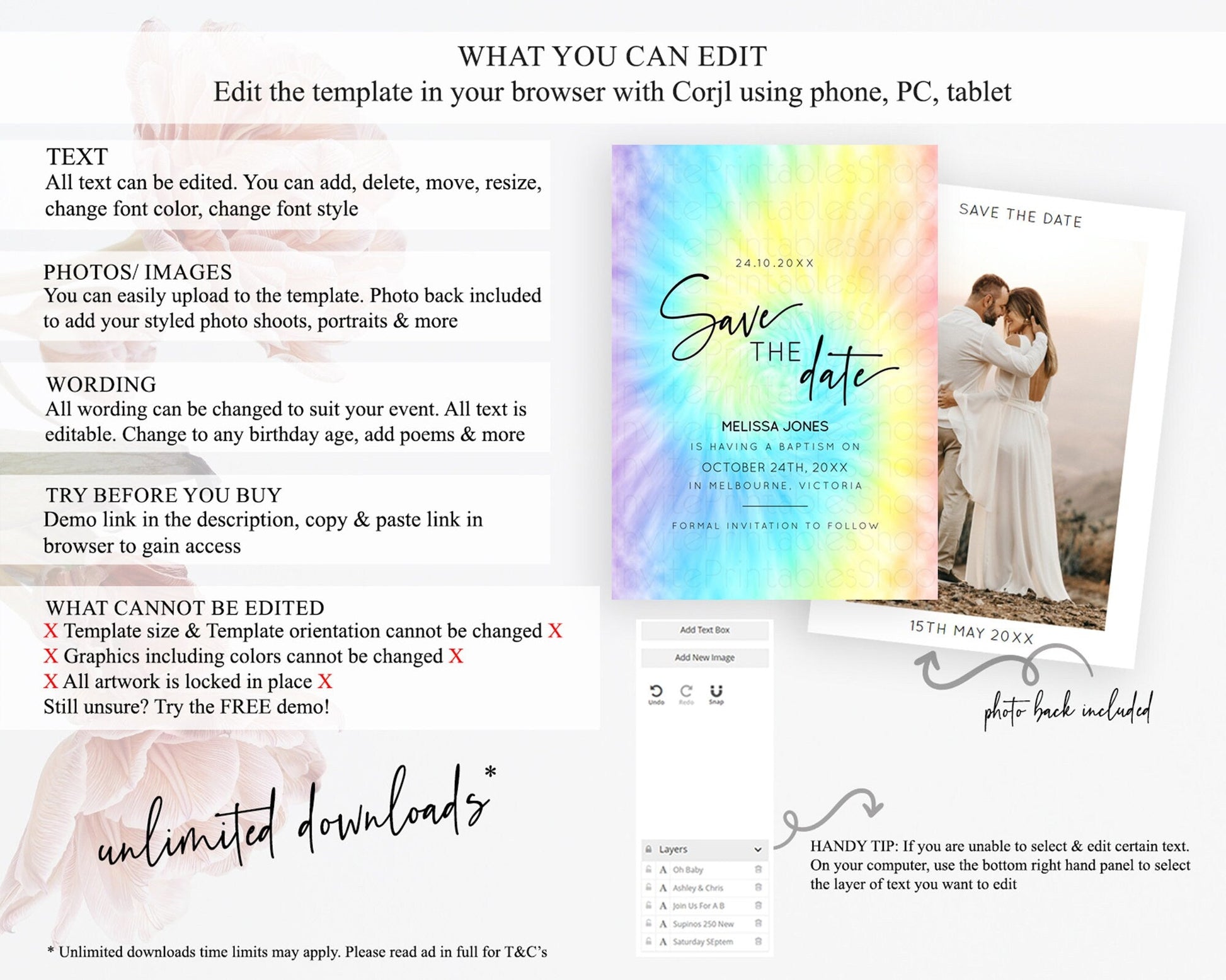 Tie Dye Save The Date Template Rainbow Pastel Ombre Watercolor Party For 1st Birthday Baptism Baby Shower Bridal Shower Wedding D10578