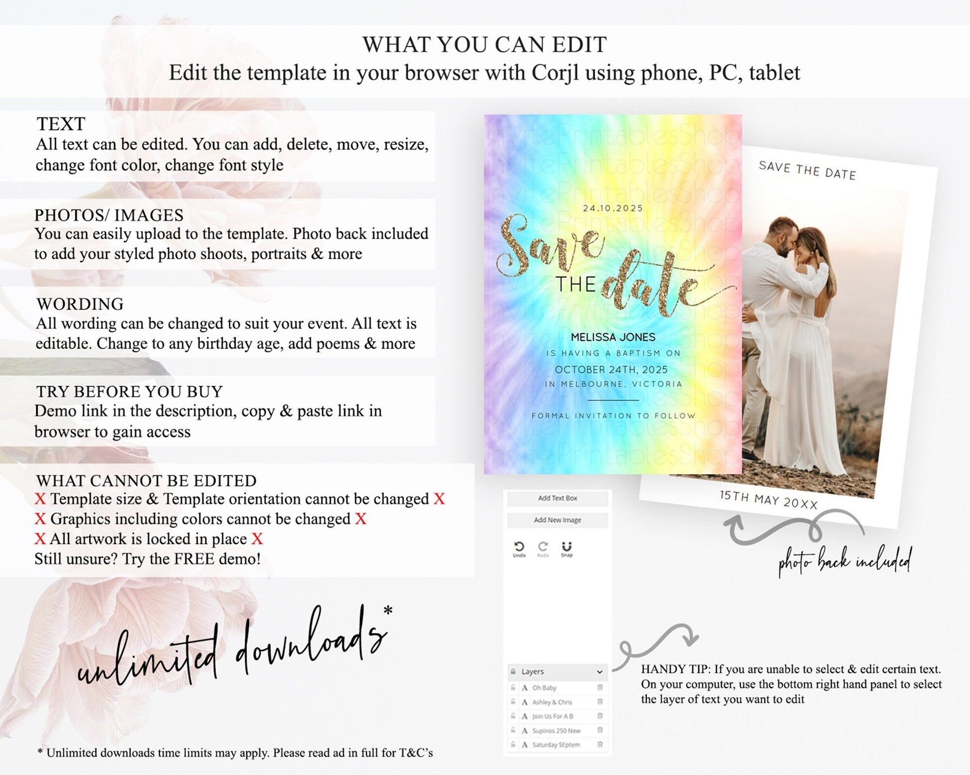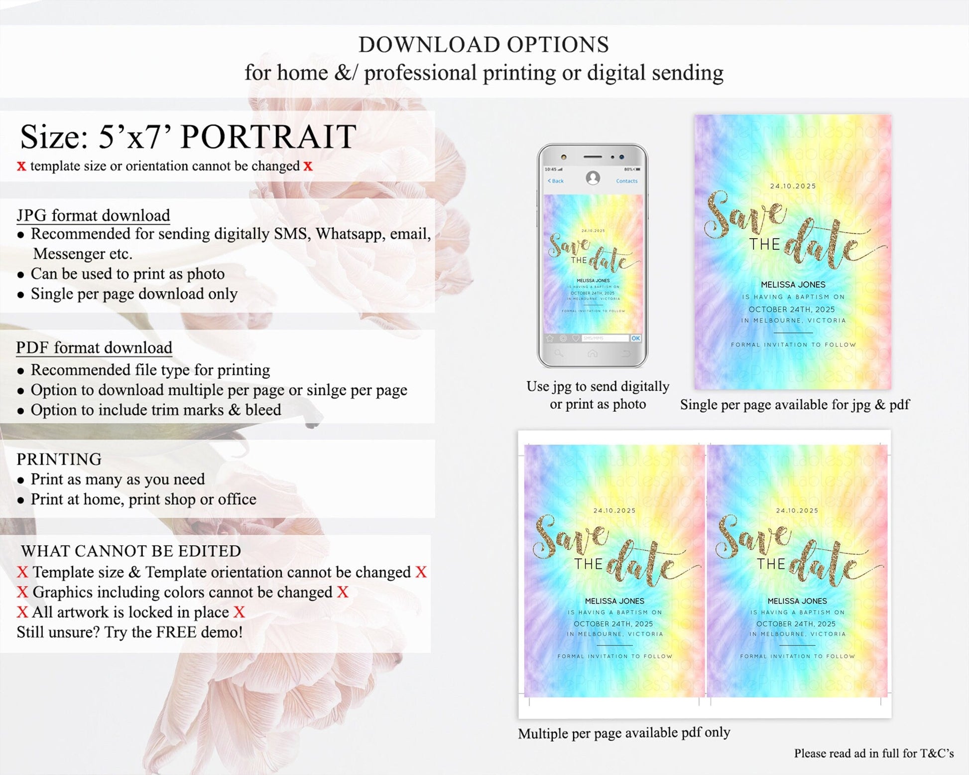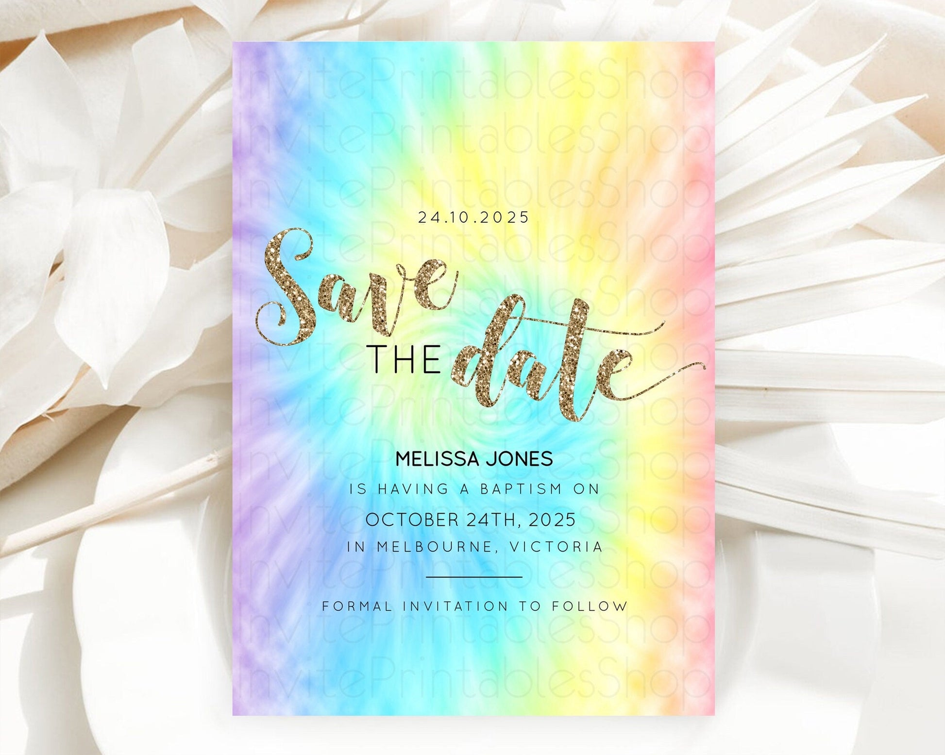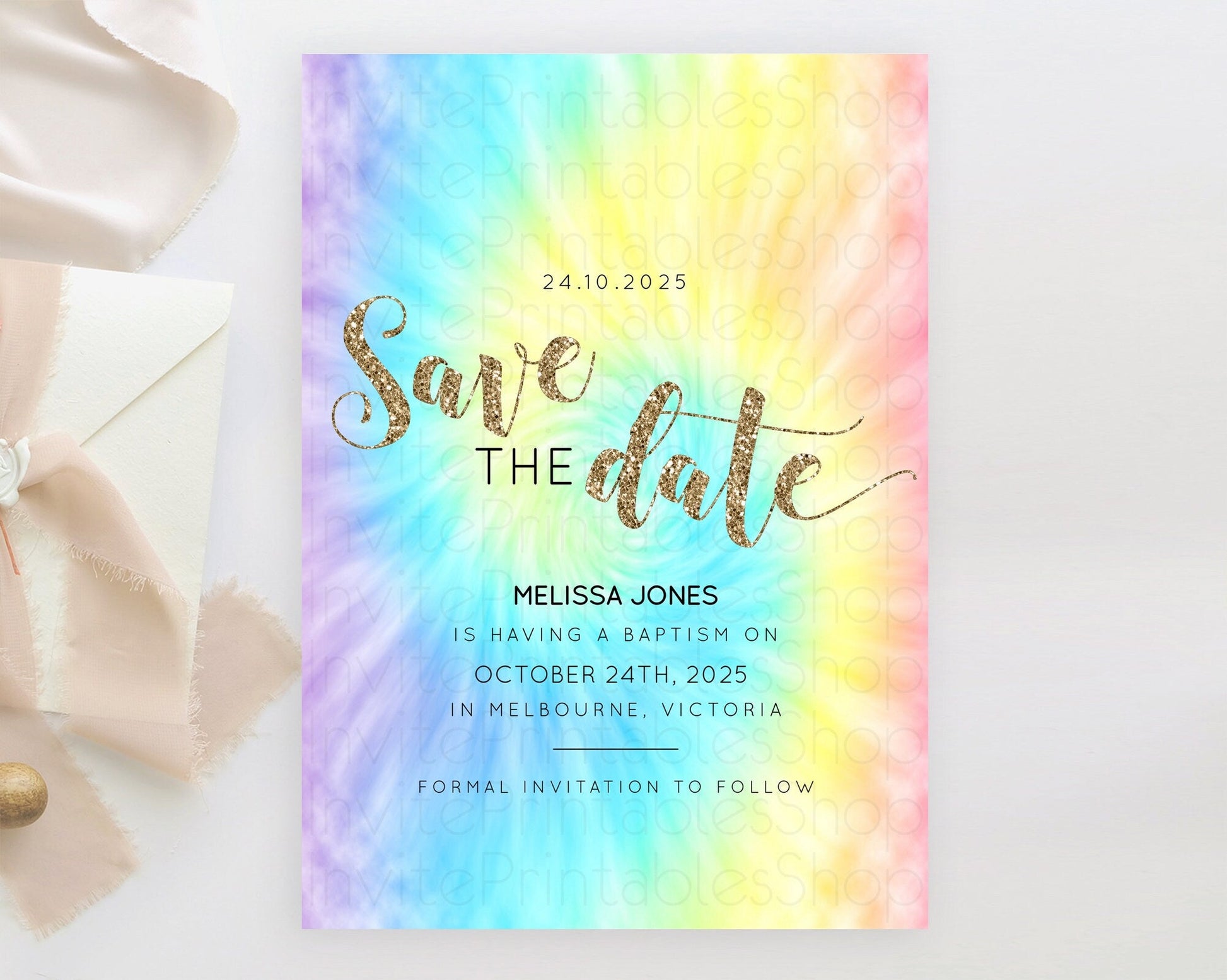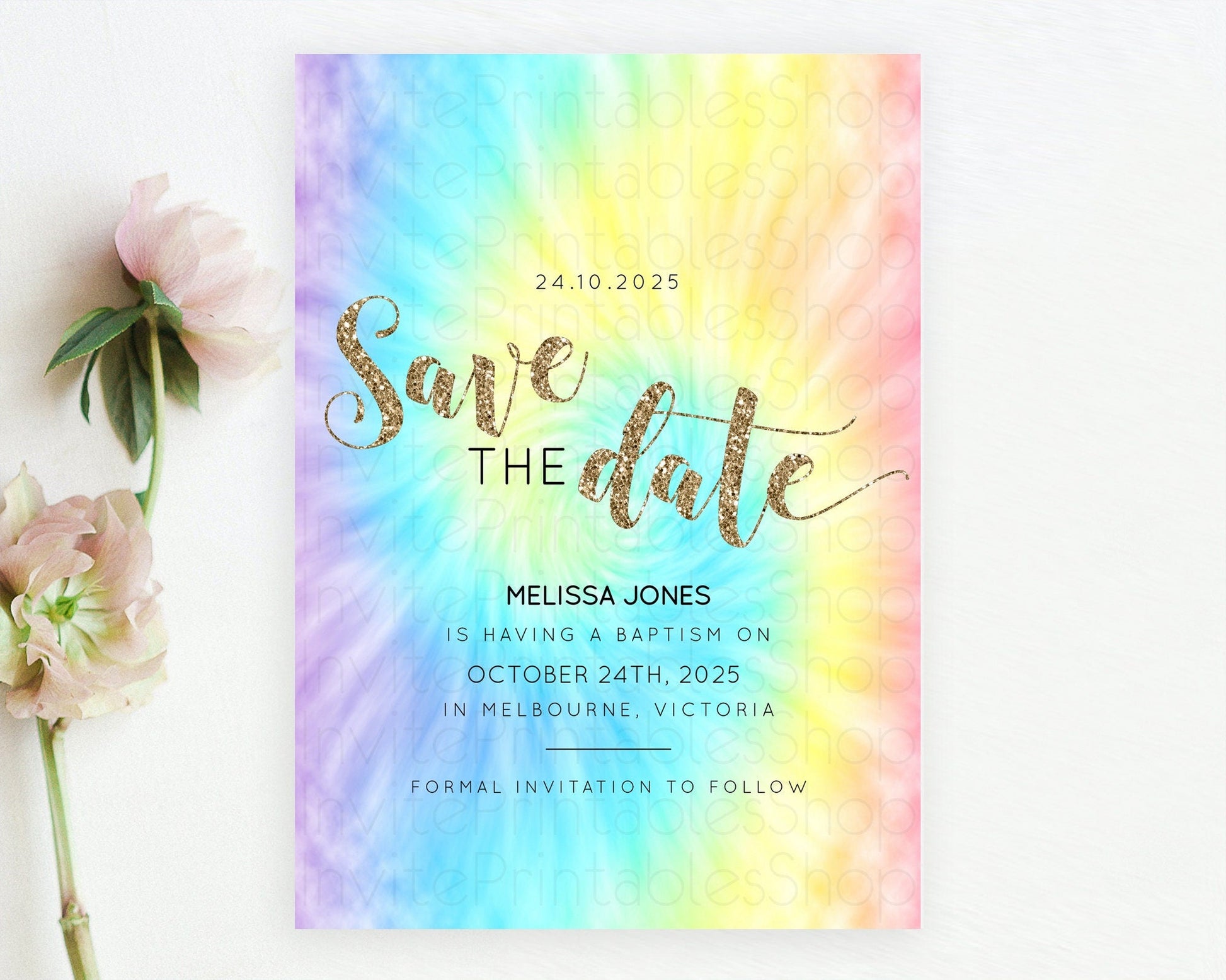 Tie Dye Save The Date Template Rainbow Pastel Ombre Watercolor Party For 1st Birthday Baptism Baby Shower Bridal Shower Wedding D10580