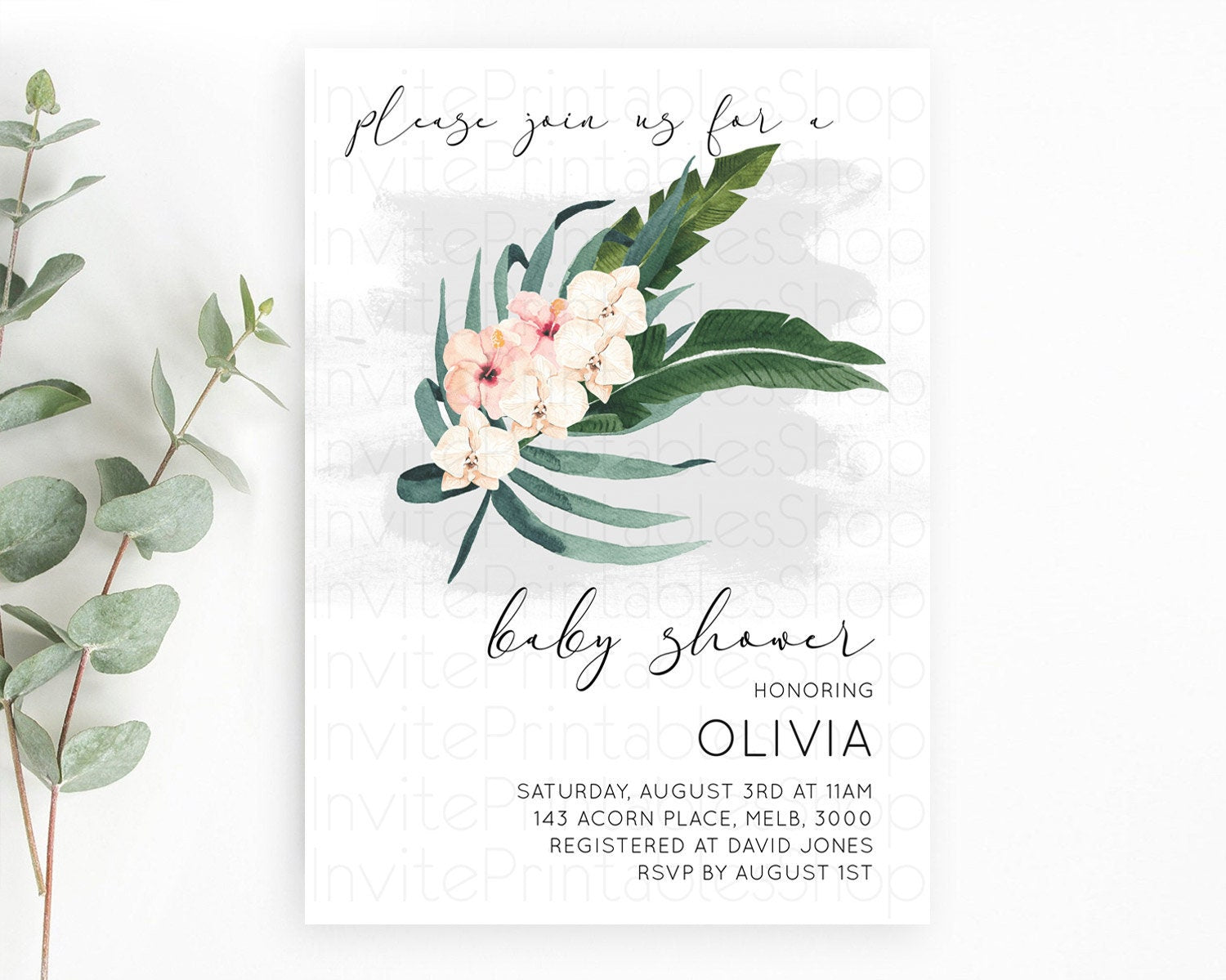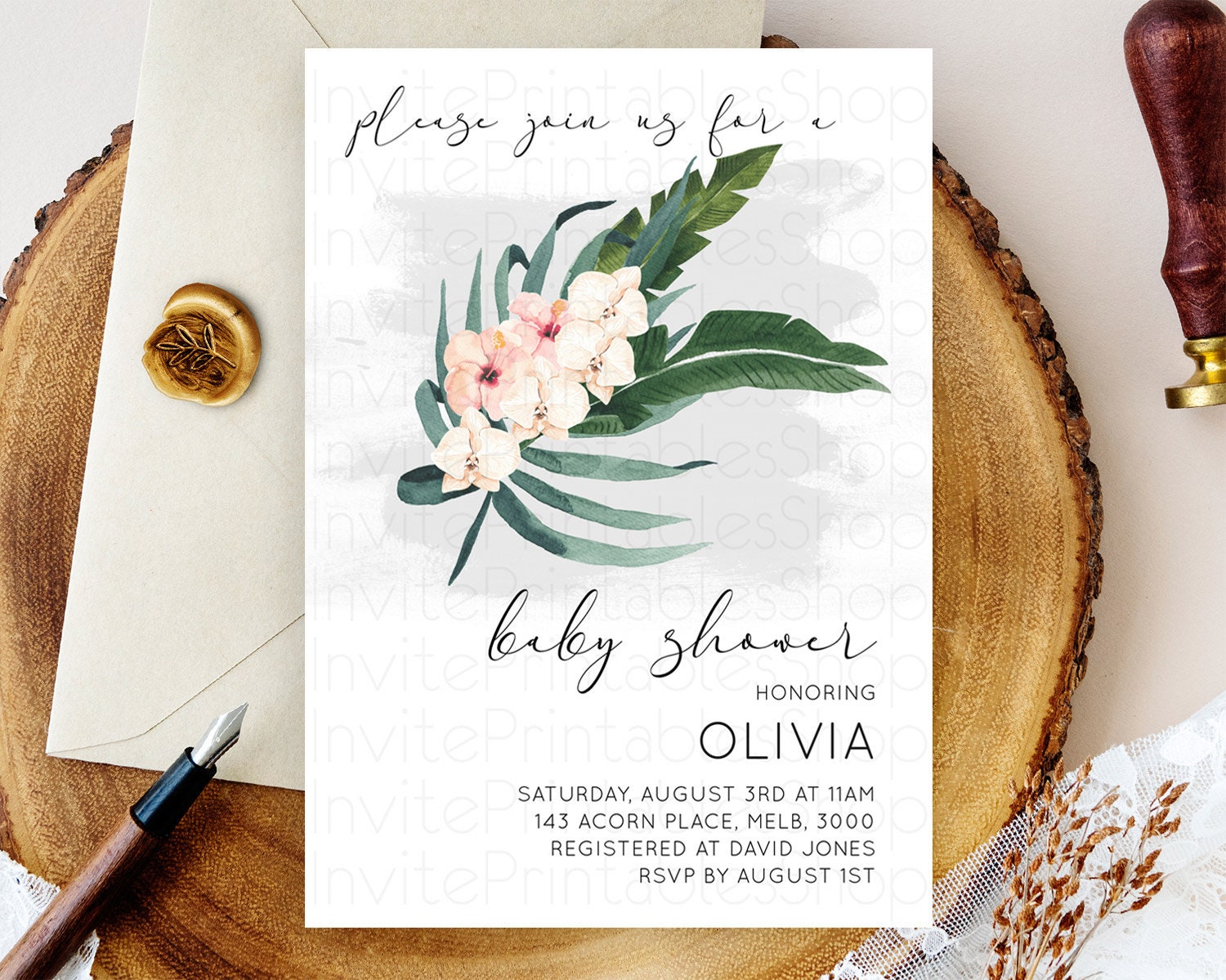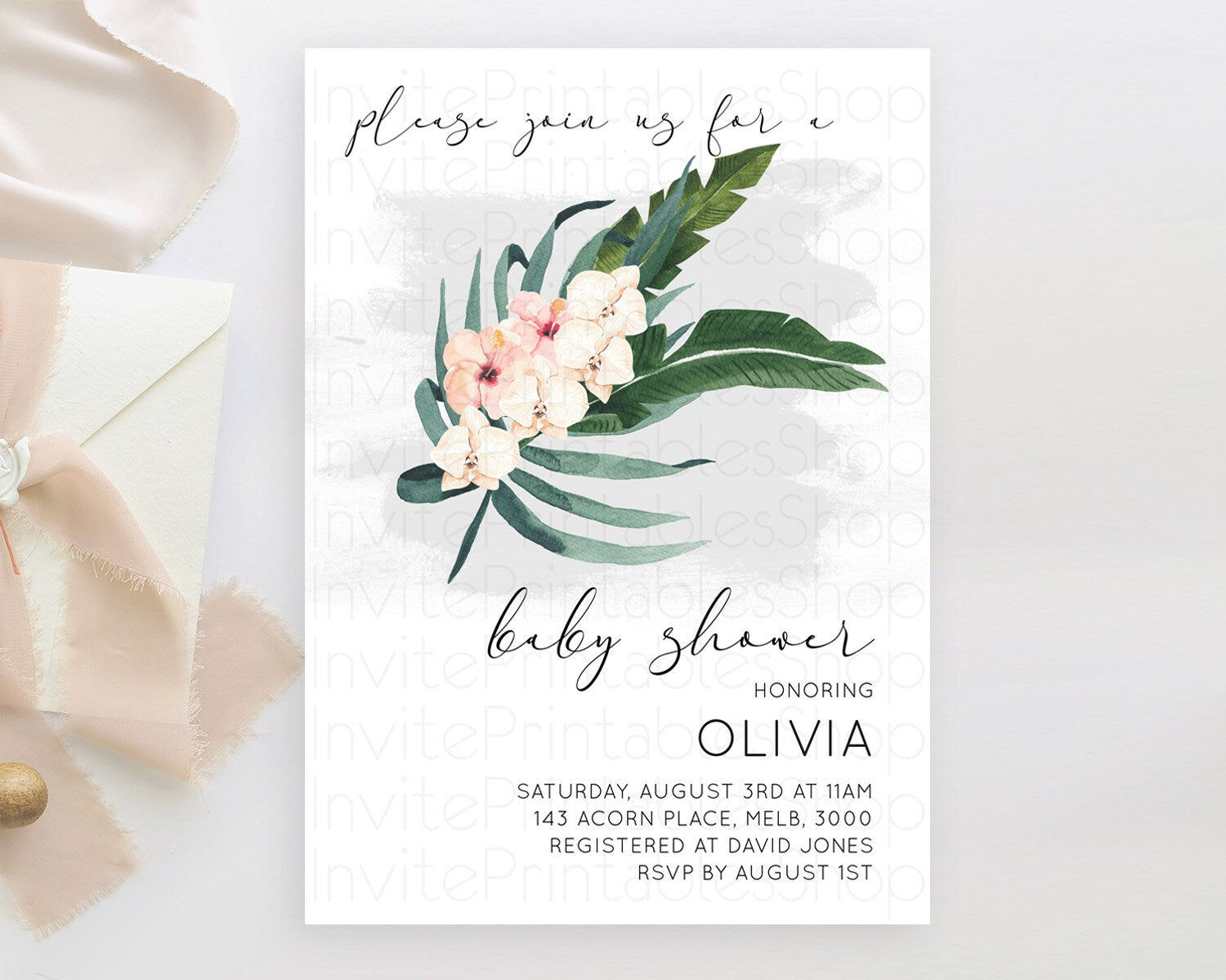 Tropical baby Shower Invitation Tropical Floral Baby Shower Invitation Palm Leaf Fern Invitation Frangipani White Orchid Invitation D11011