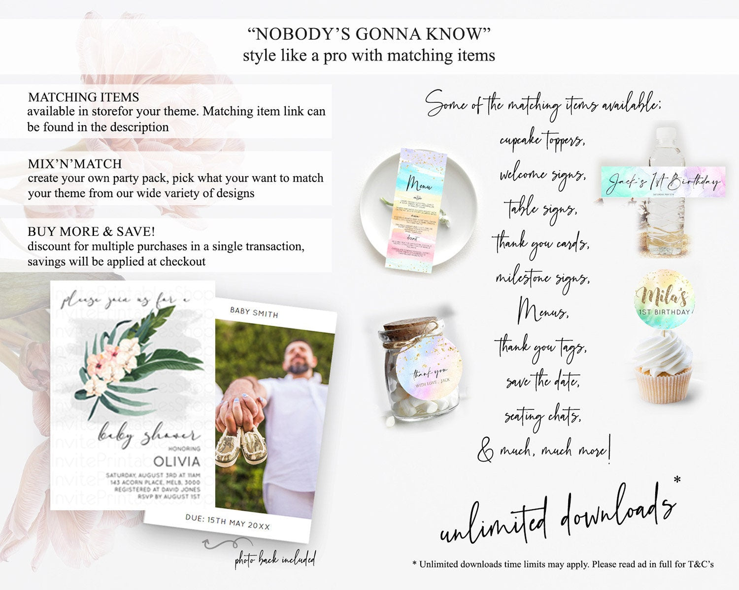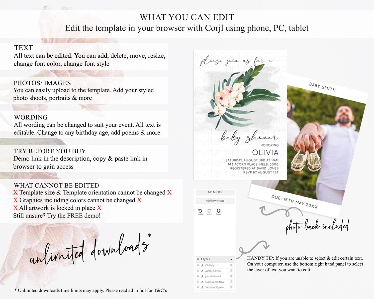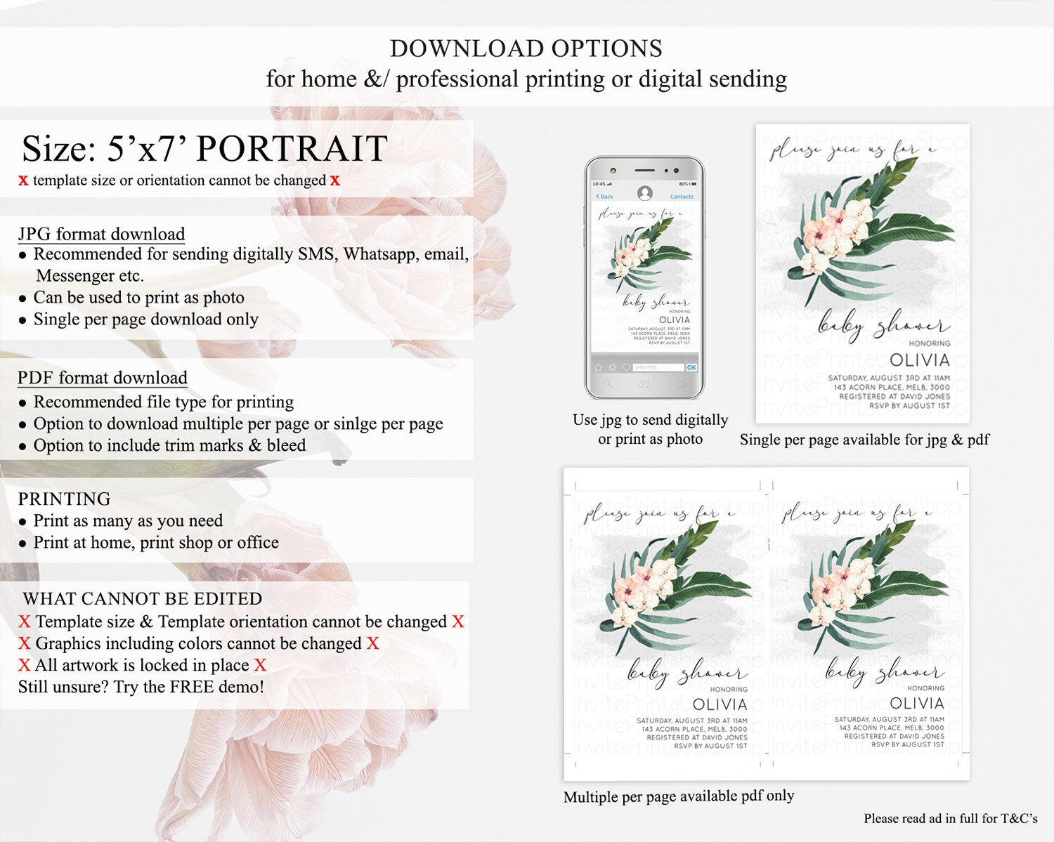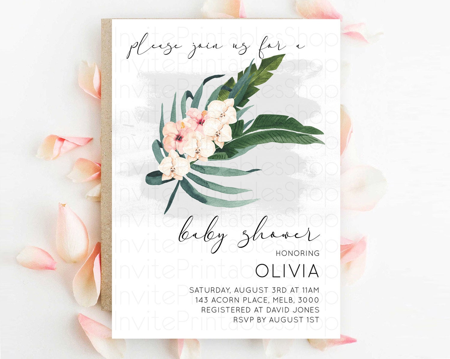 Tropical baby Shower Invitation Tropical Floral Baby Shower Invitation Palm Leaf Fern Invitation Frangipani White Orchid Invitation D11011