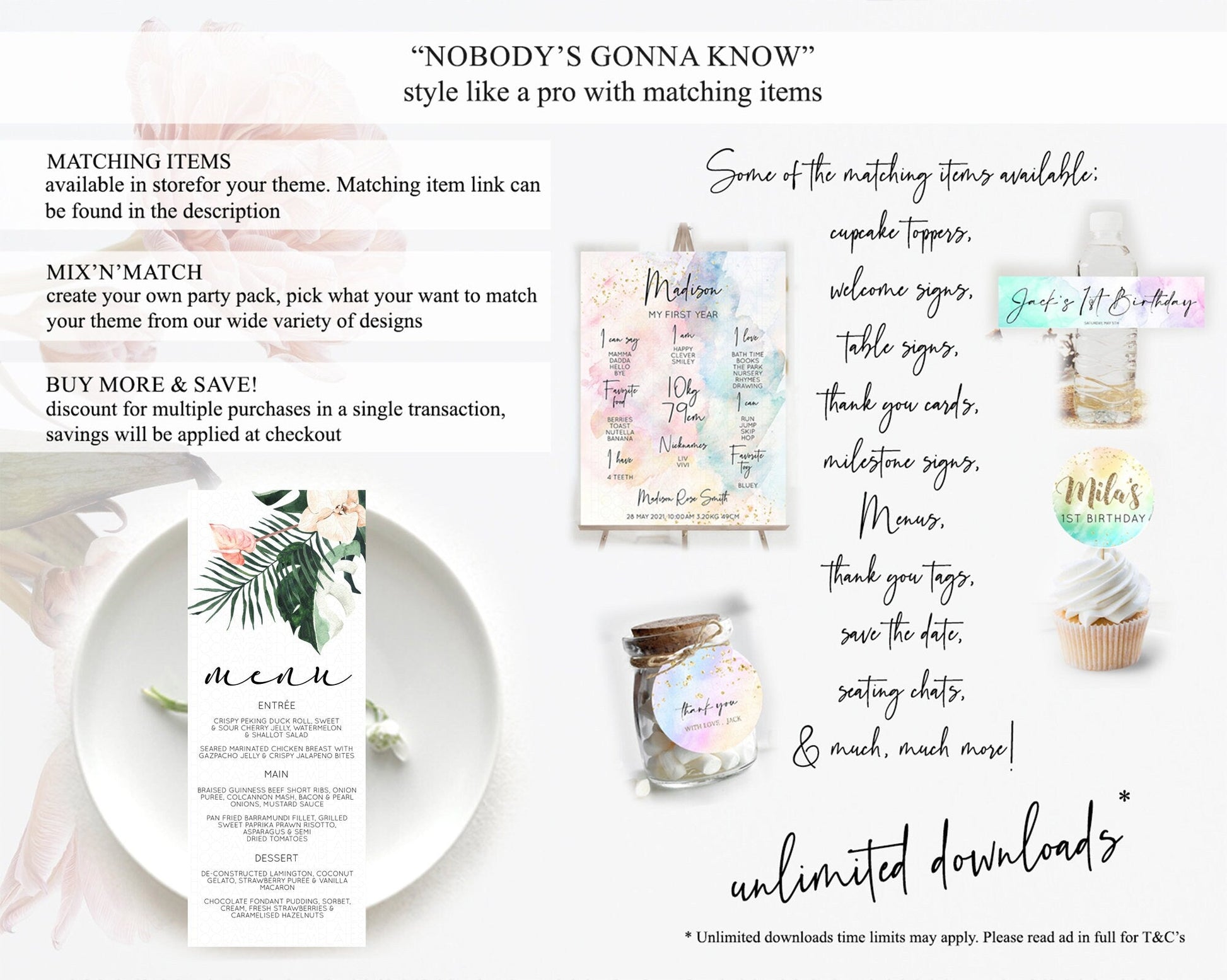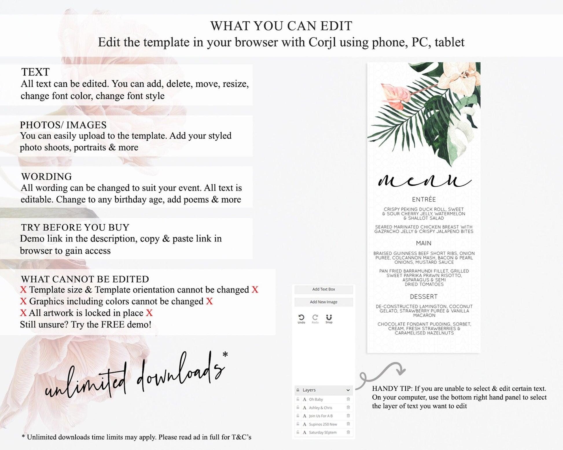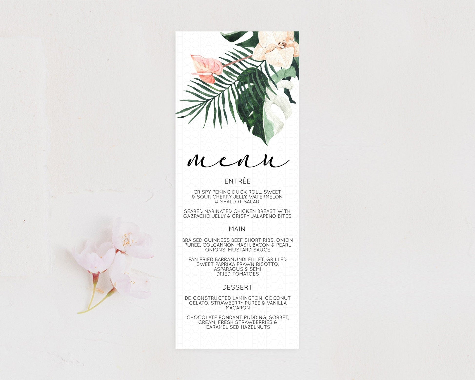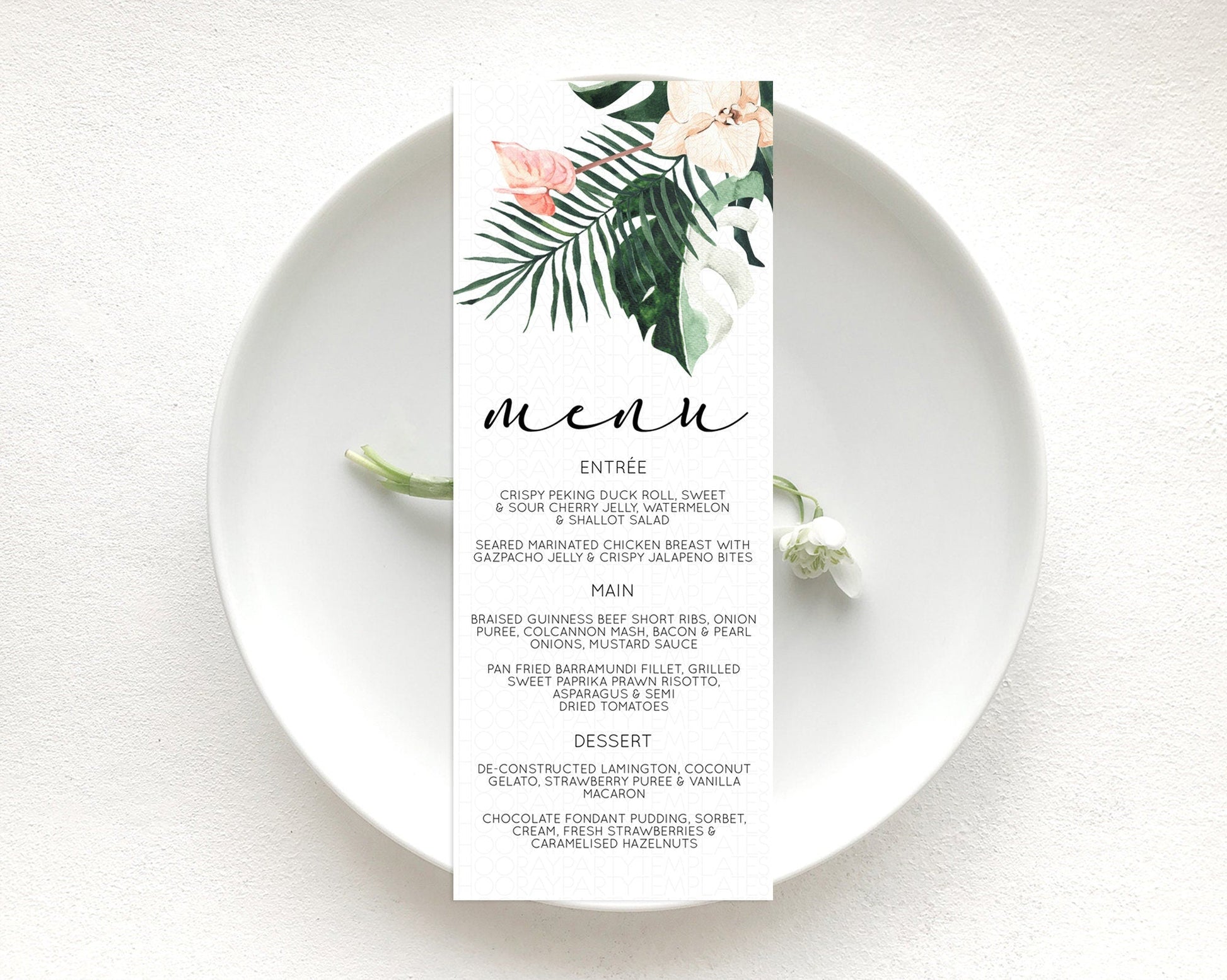 Tropical Menu Template Tropical Menu Palm Leaf Fern Table Decor Frangipani Floral White Orchid Dinner Dessert Menu Party Food Menu D11016