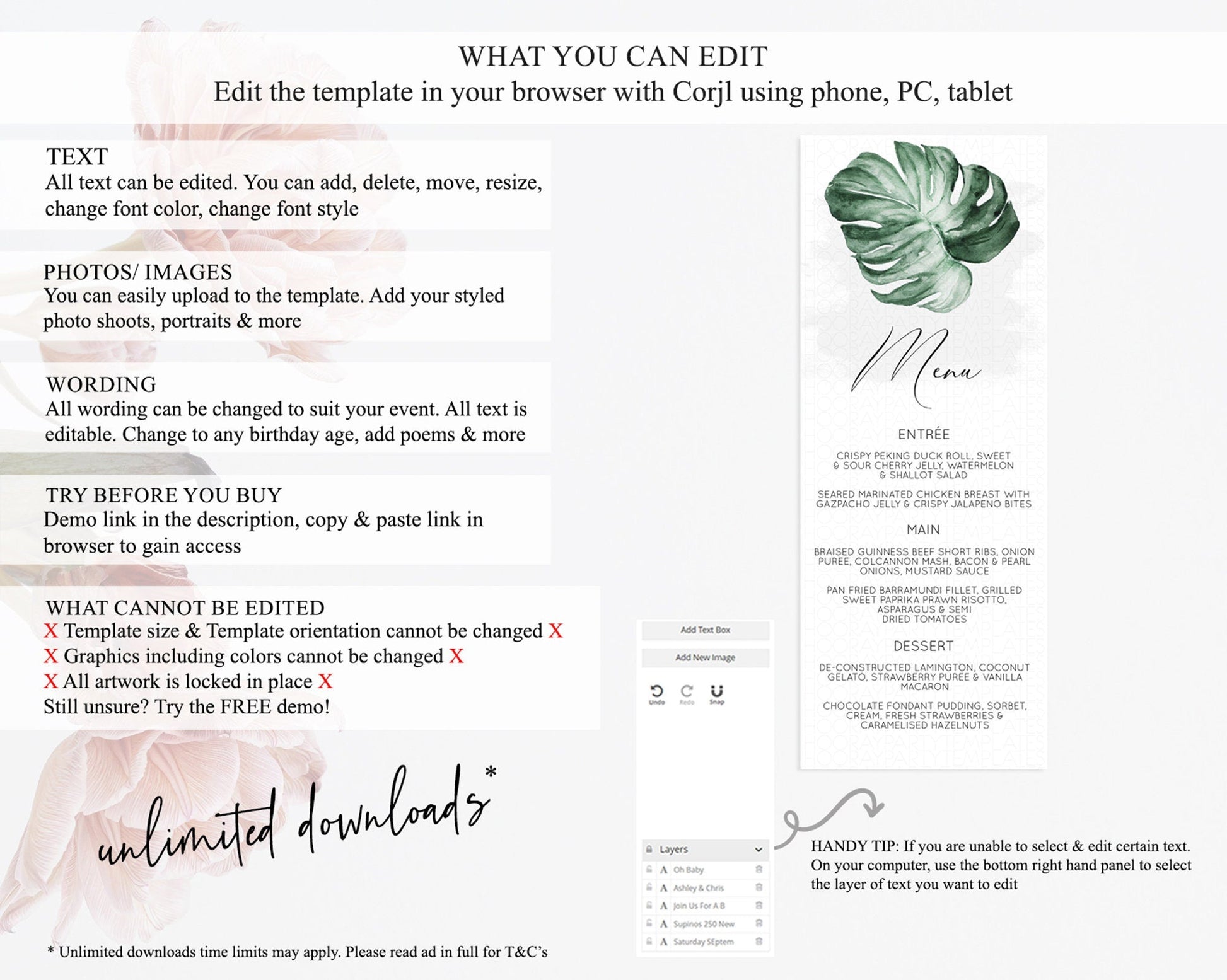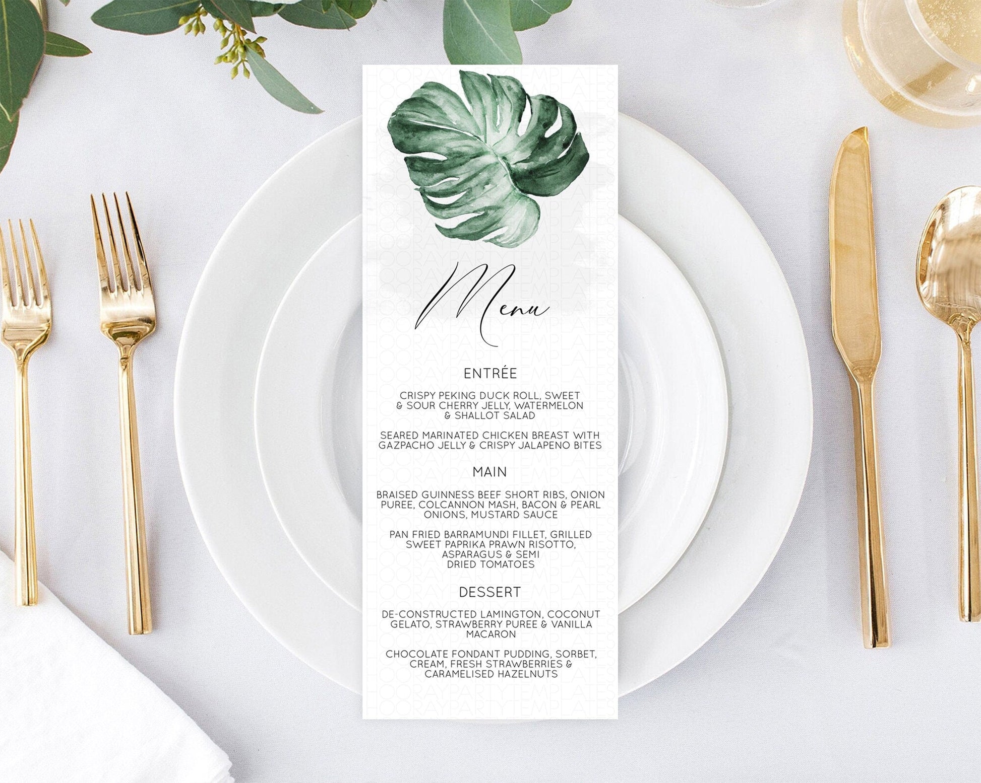 Tropical Menu Template Tropical Menu Palm Leaf Fern Table Decor Frangipani Floral White Orchid Dinner Dessert Menu Party Food Menu D11041