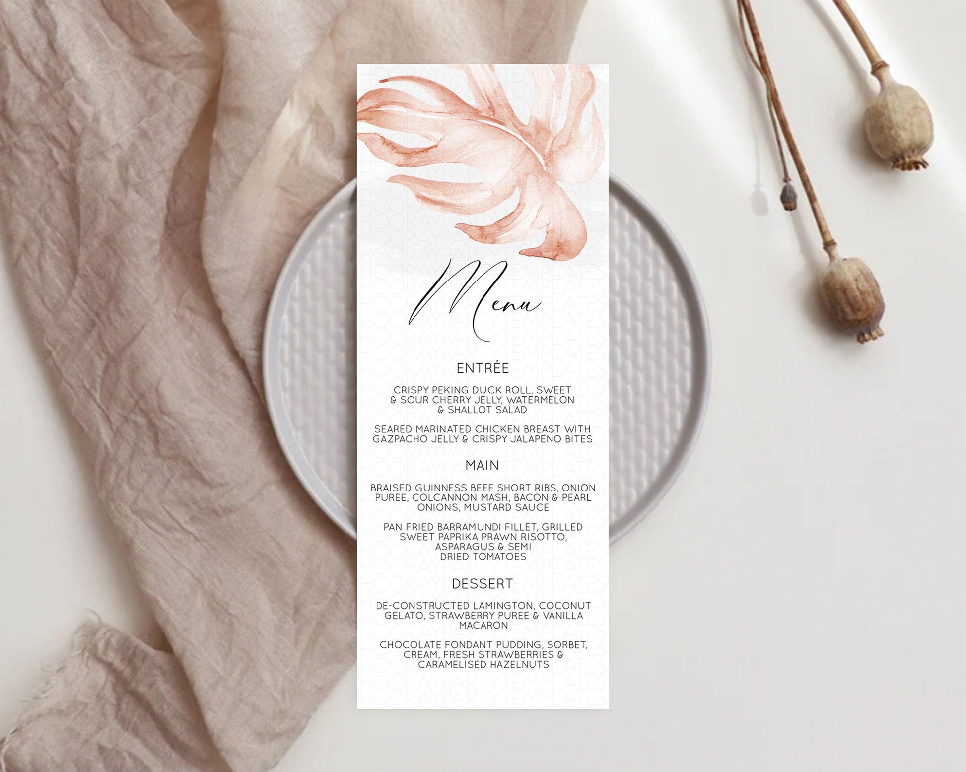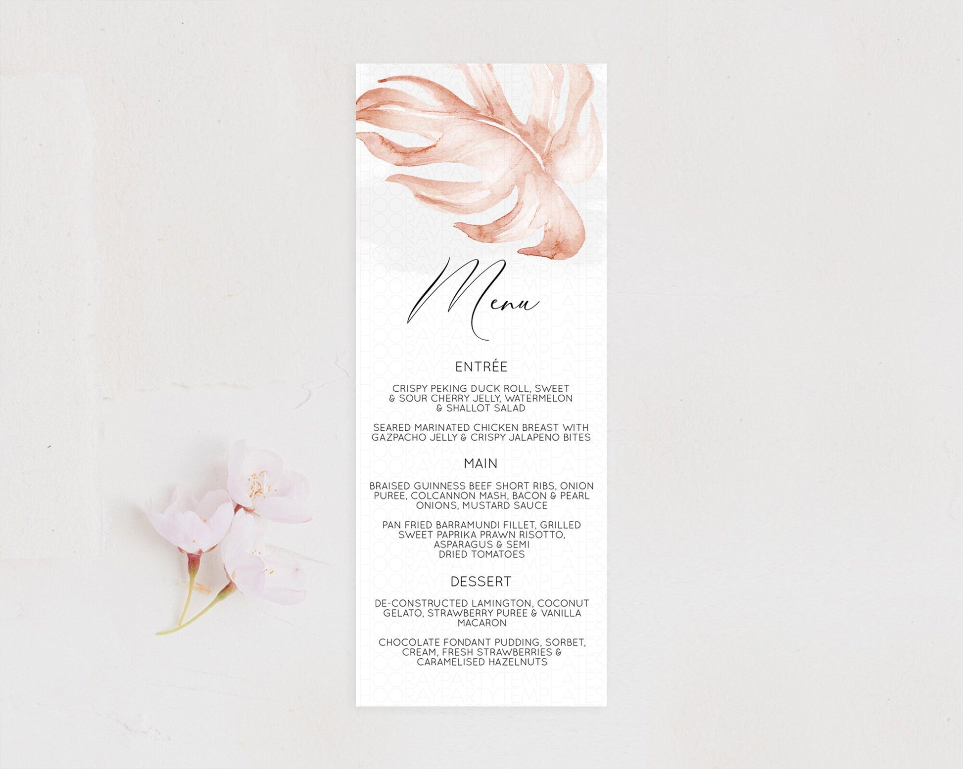 Tropical Menu Template Tropical Menu Palm Leaf Fern Table Decor Frangipani Floral White Orchid Dinner Dessert Menu Party Food Menu D11044
