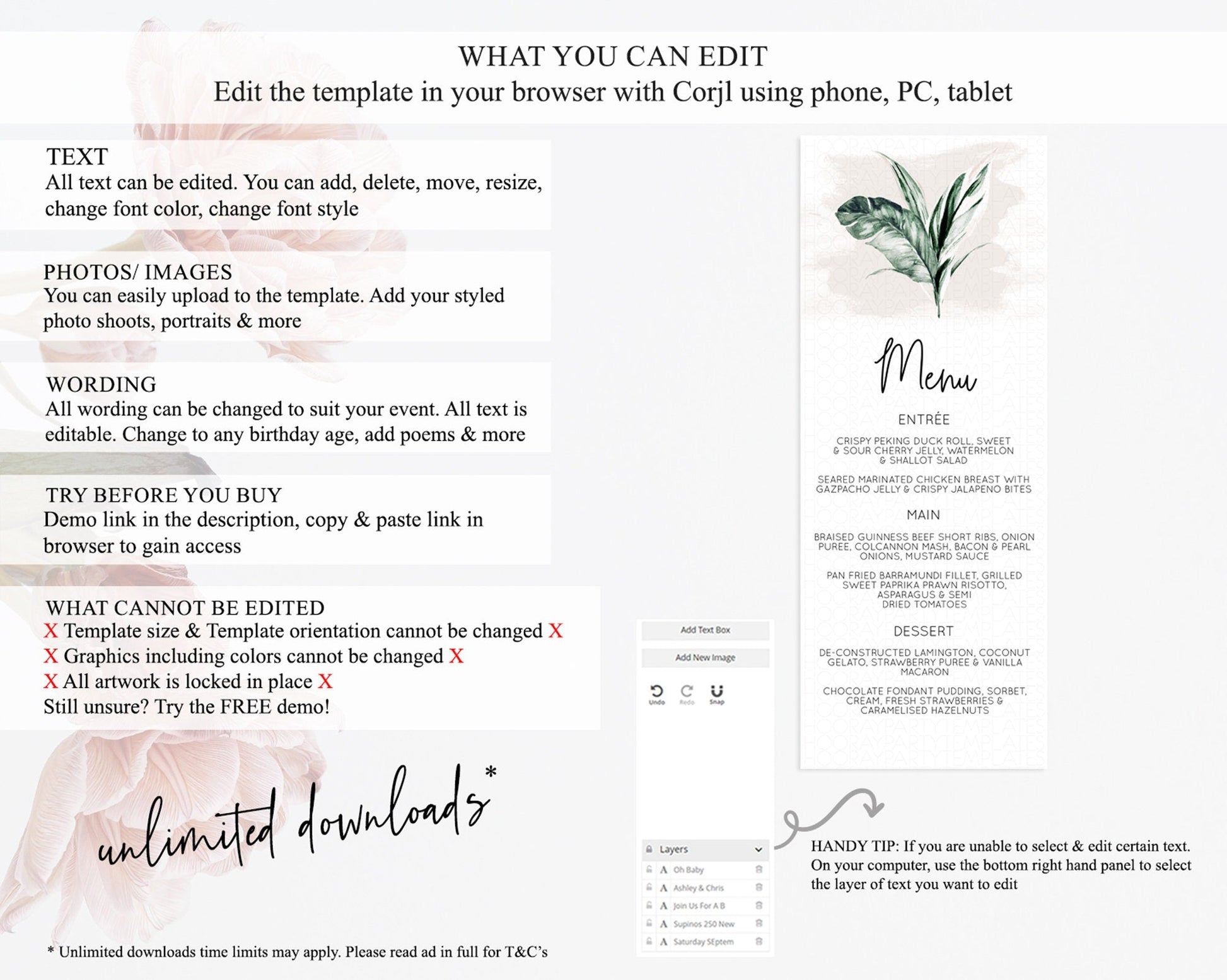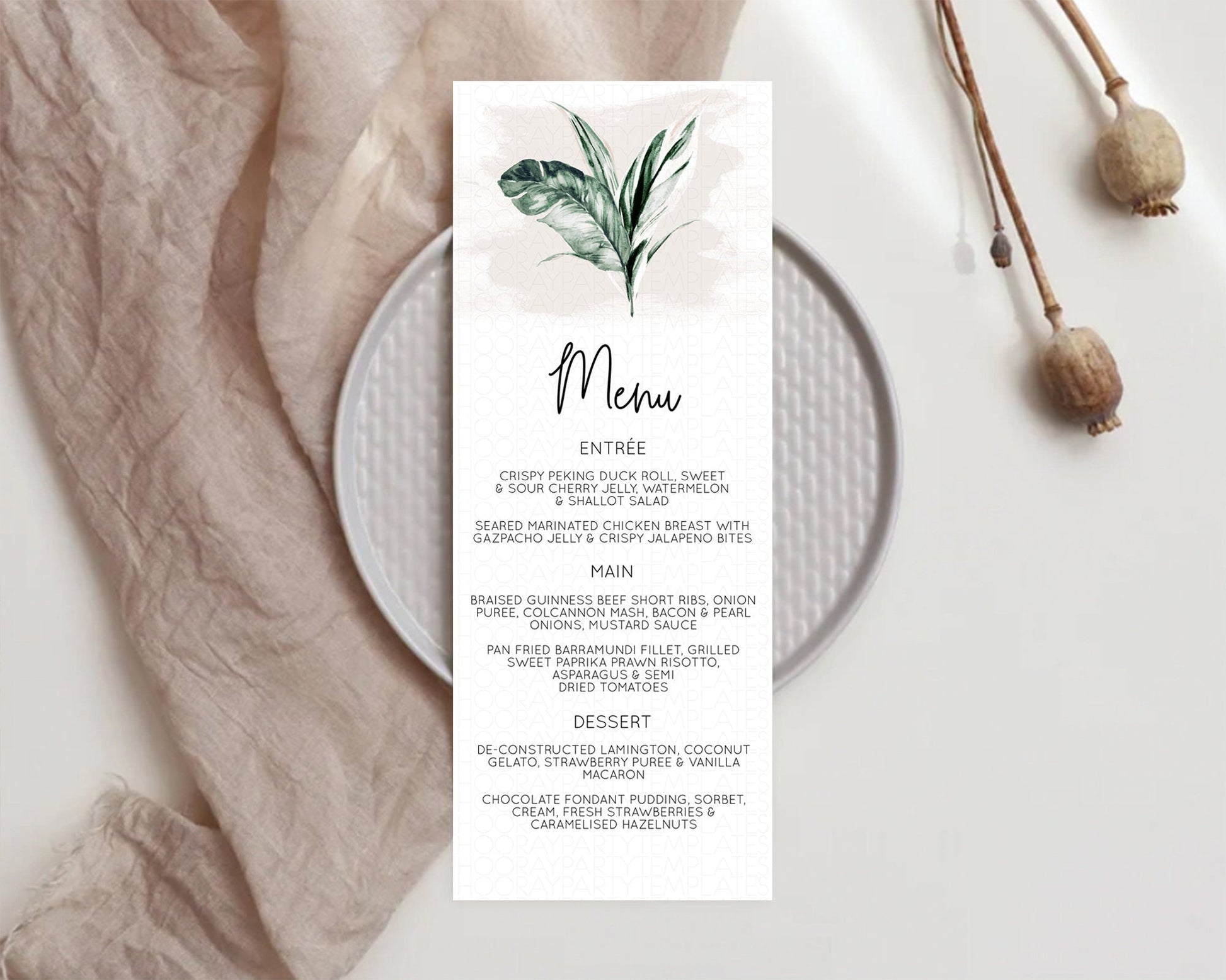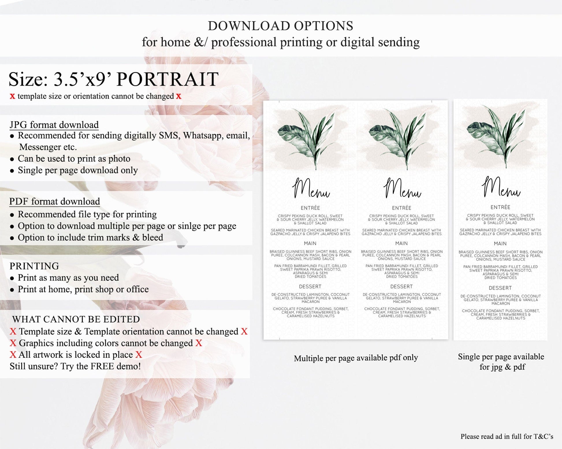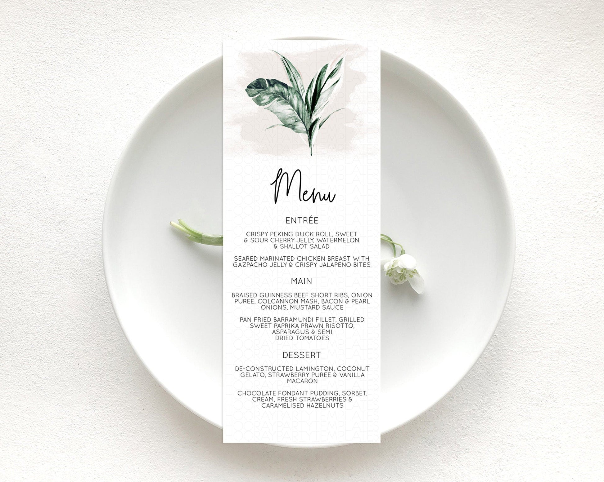 Tropical Menu Template Tropical Menu Palm Leaf Fern Table Decor Frangipani Floral White Orchid Dinner Dessert Menu Party Food Menu D11051