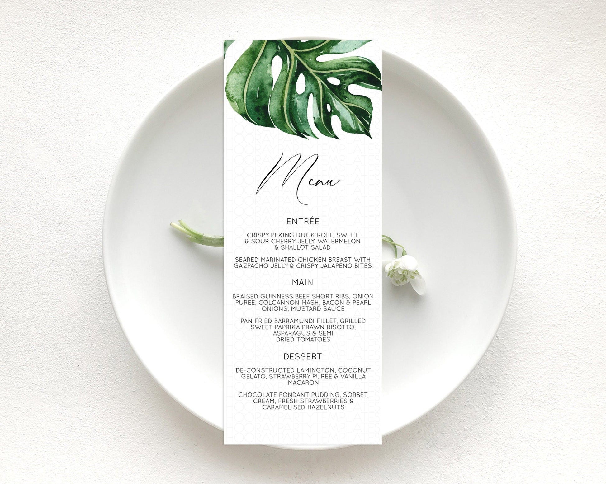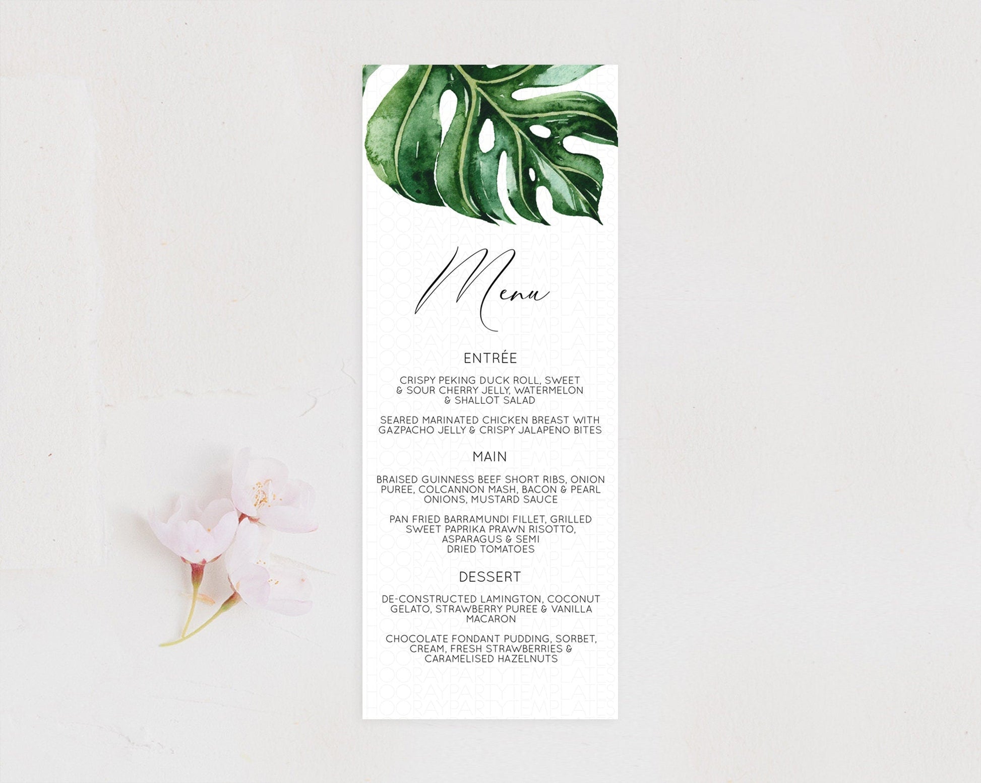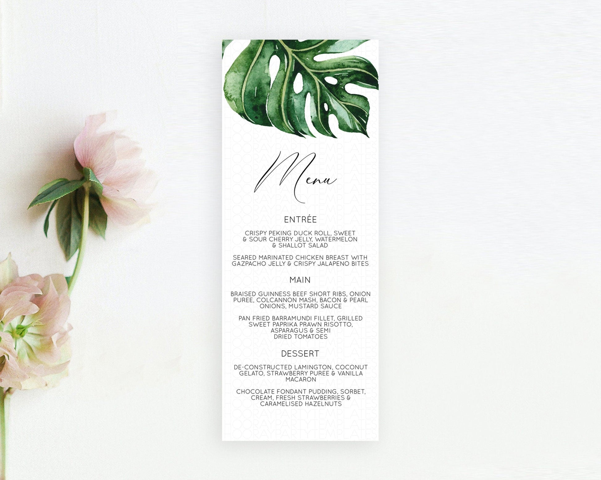 Tropical Menu Template Tropical Menu Palm Leaf Fern Table Decor Frangipani Floral White Orchid Dinner Dessert Menu Party Food Menu D11056