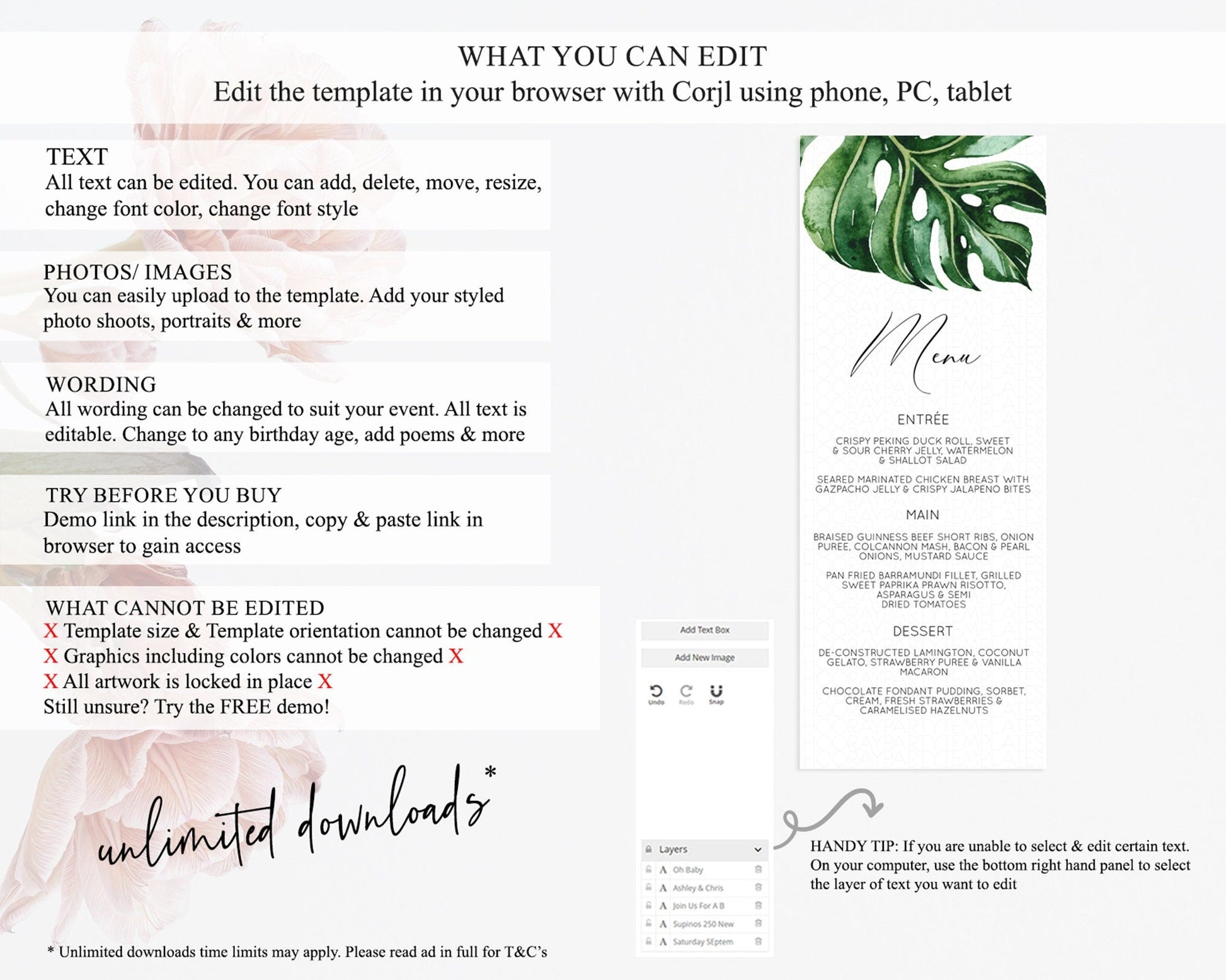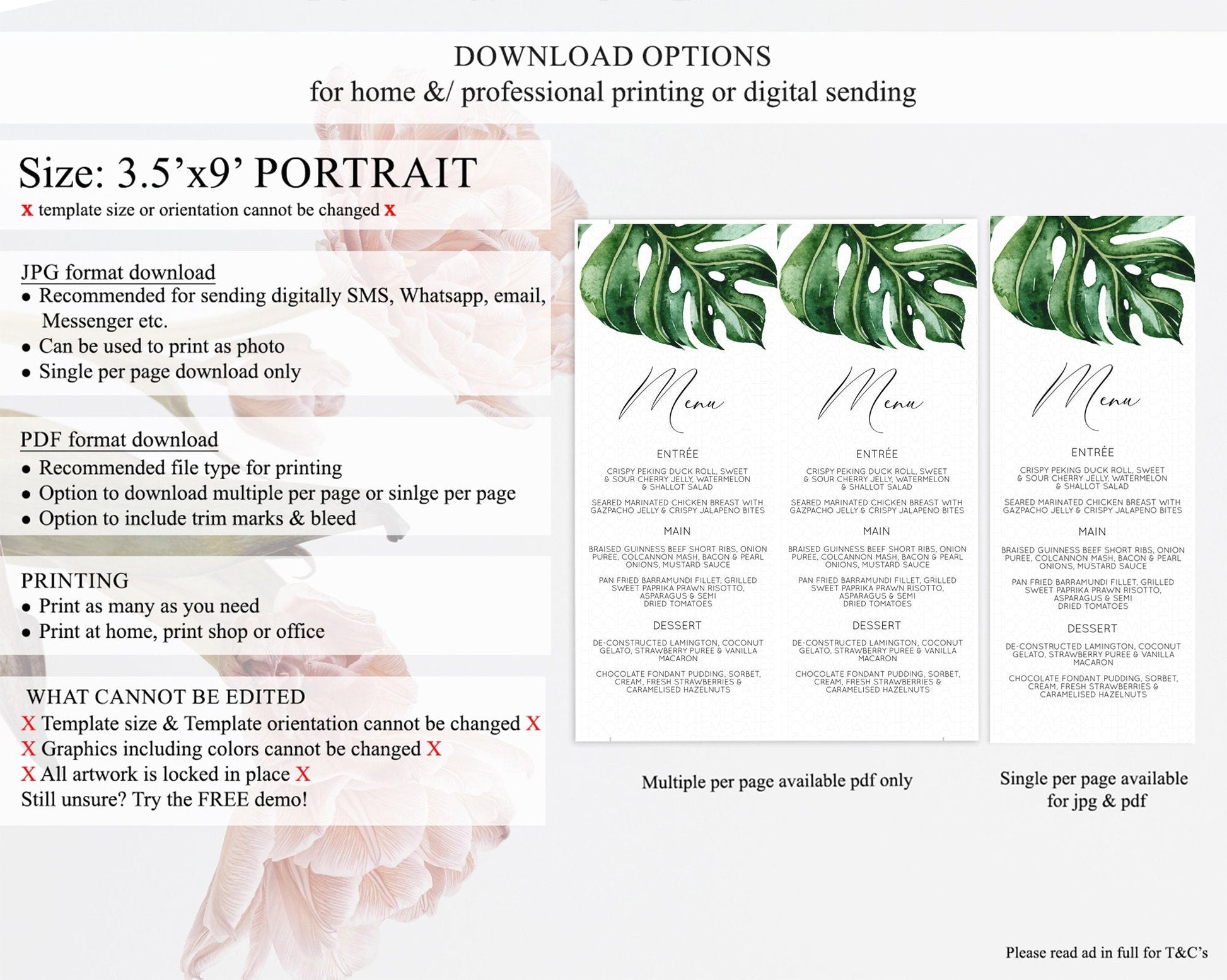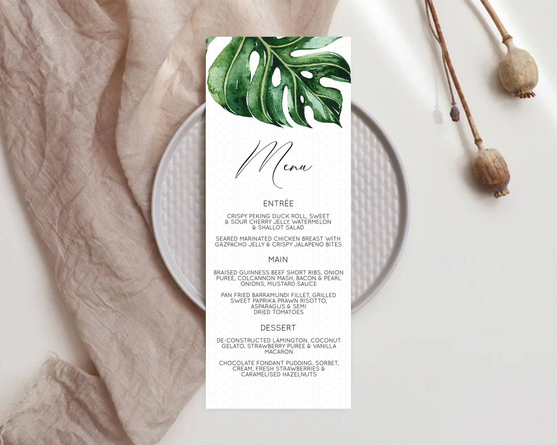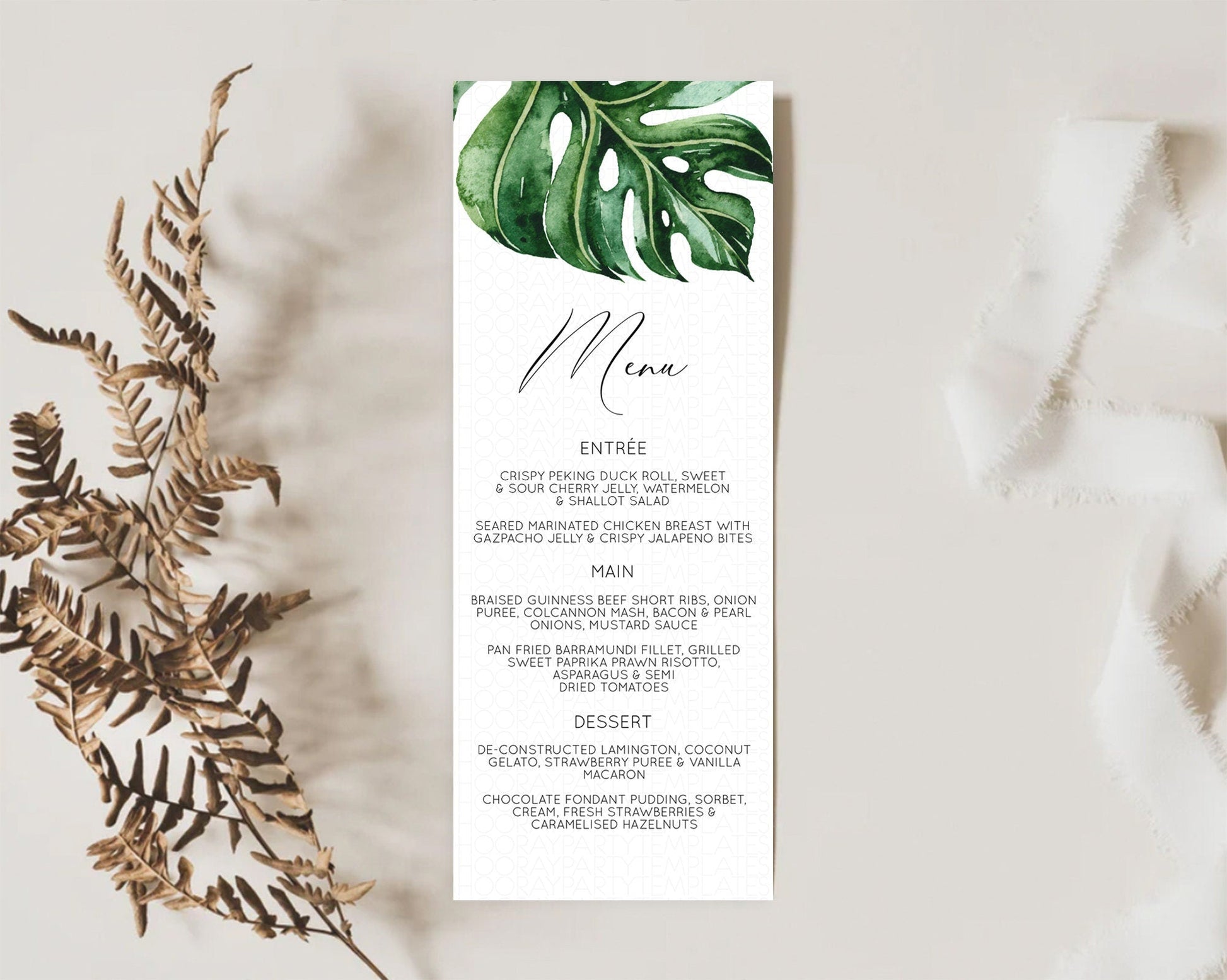 Tropical Menu Template Tropical Menu Palm Leaf Fern Table Decor Frangipani Floral White Orchid Dinner Dessert Menu Party Food Menu D11056