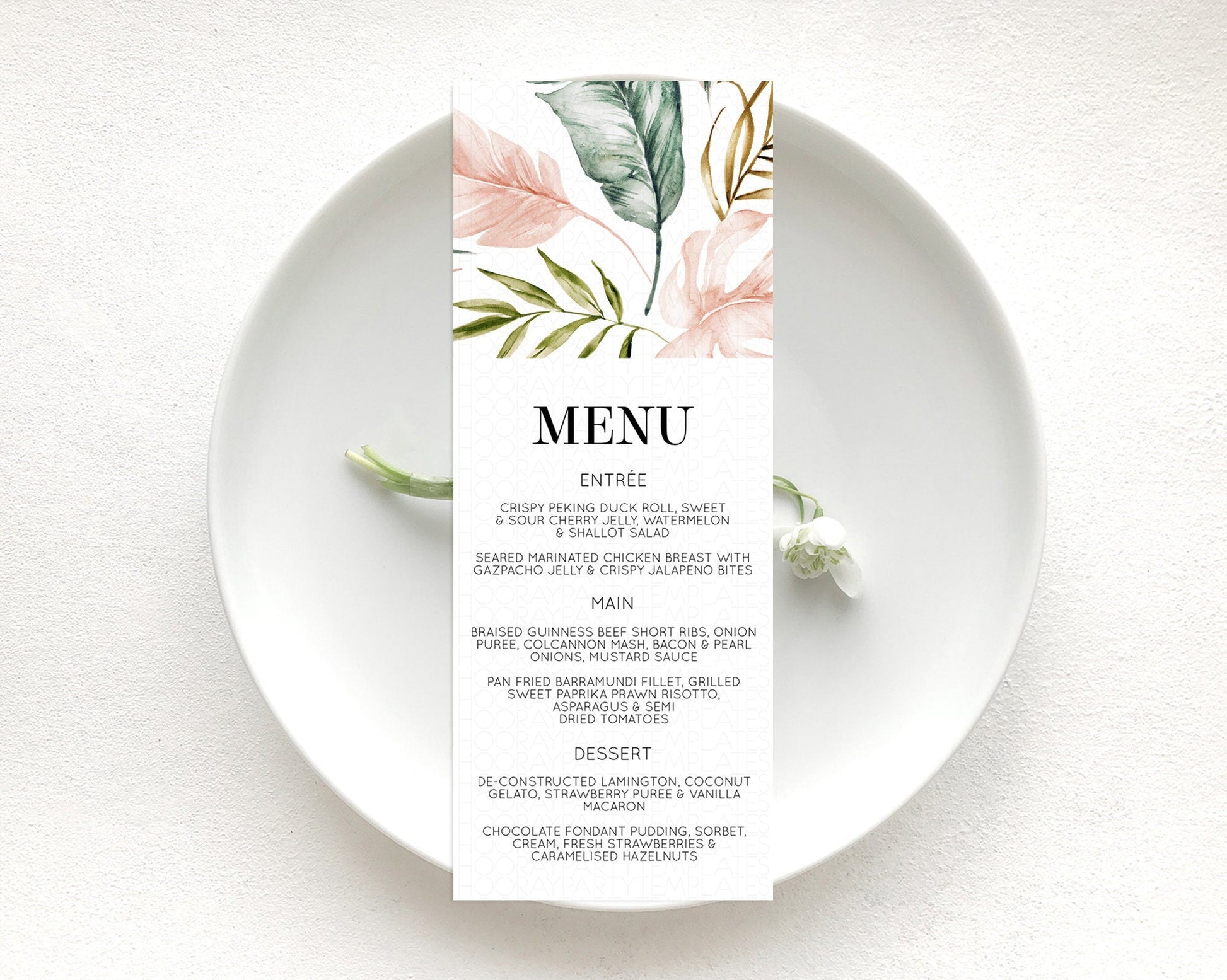 Tropical Menu Template Tropical Menu Palm Leaf Fern Table Decor Frangipani Floral White Orchid Dinner Dessert Menu Party Food Menu D11064