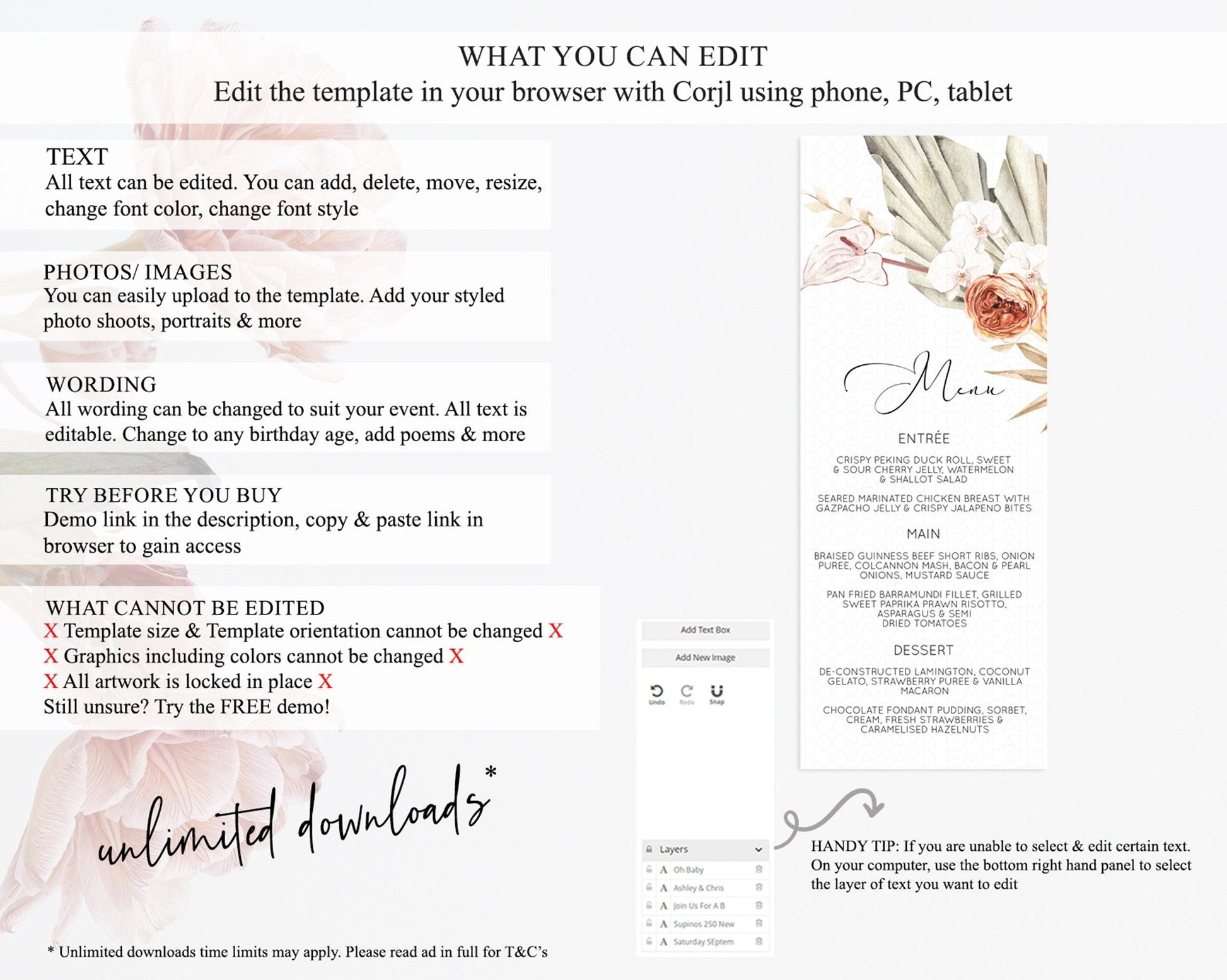 • Template size & orientation cannot be changed. Please use the demo link to confirm this product suits your needs.