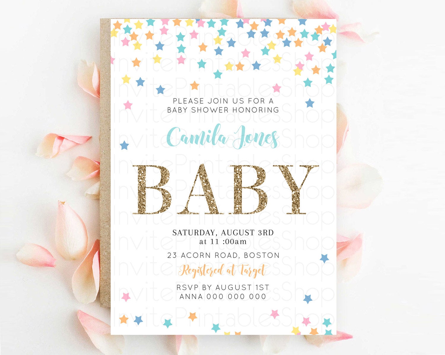 Twinkle Star Baby Shower Invitation Pastel Baby Shower Invitation Rainbow Confetti & Colorful Stars Pink, Blue, Green, Yellow, Orange D10298