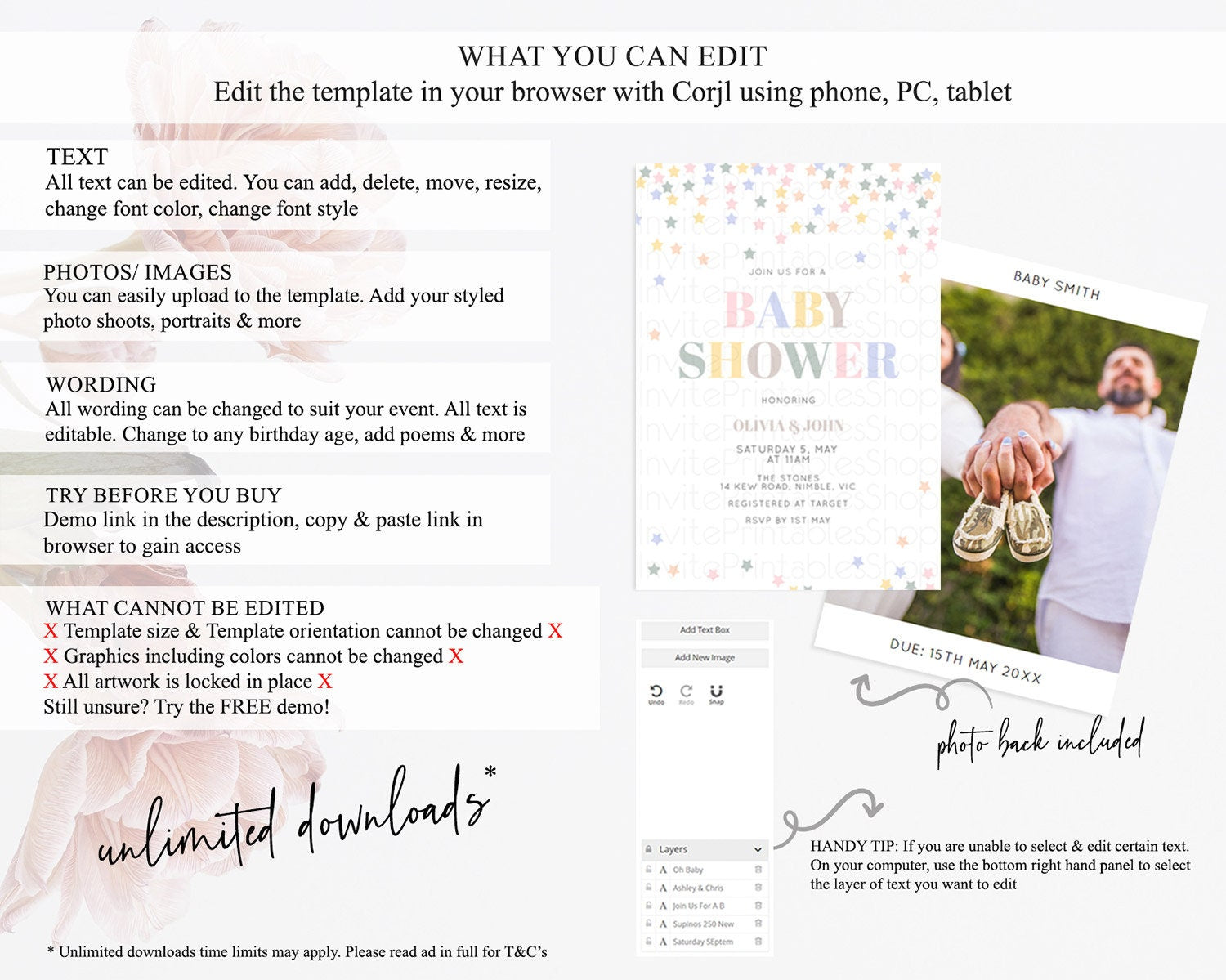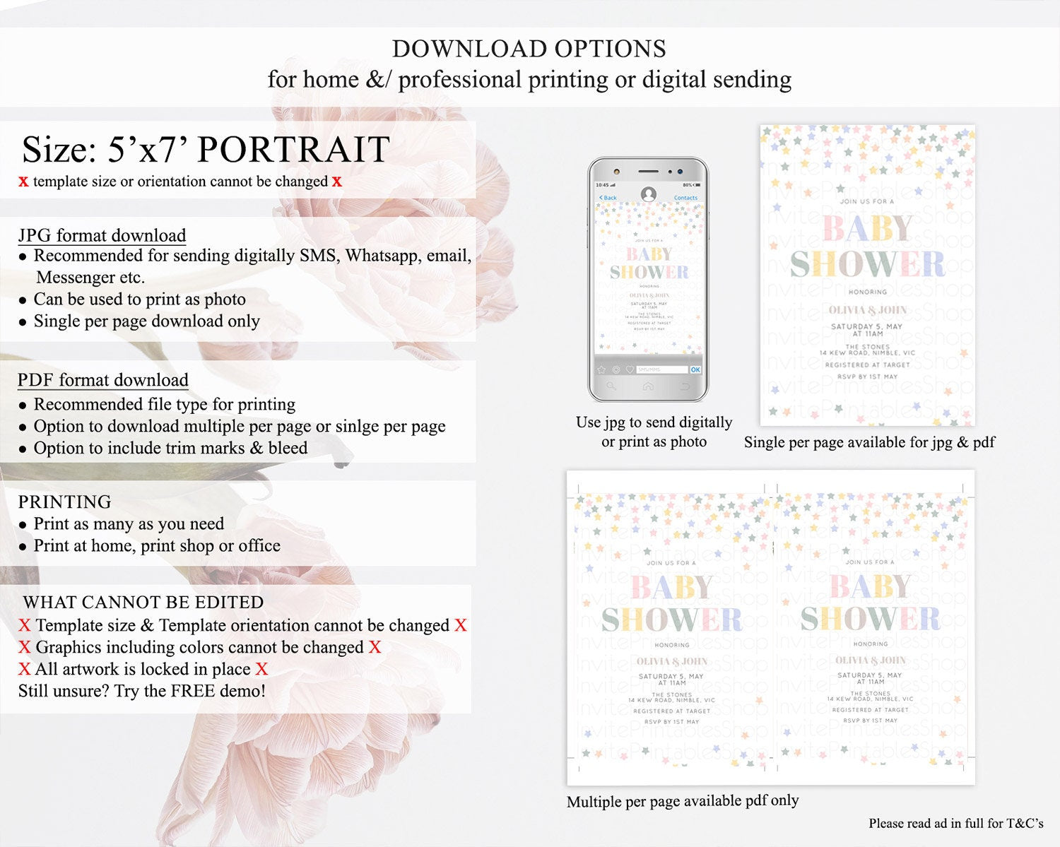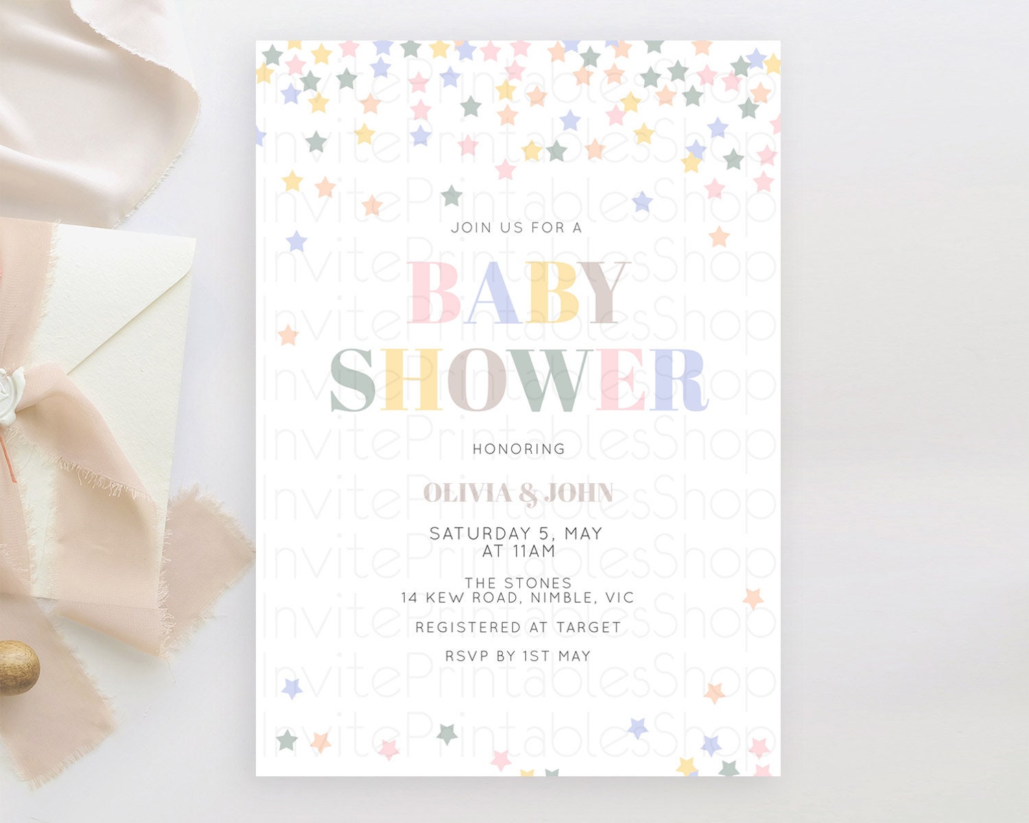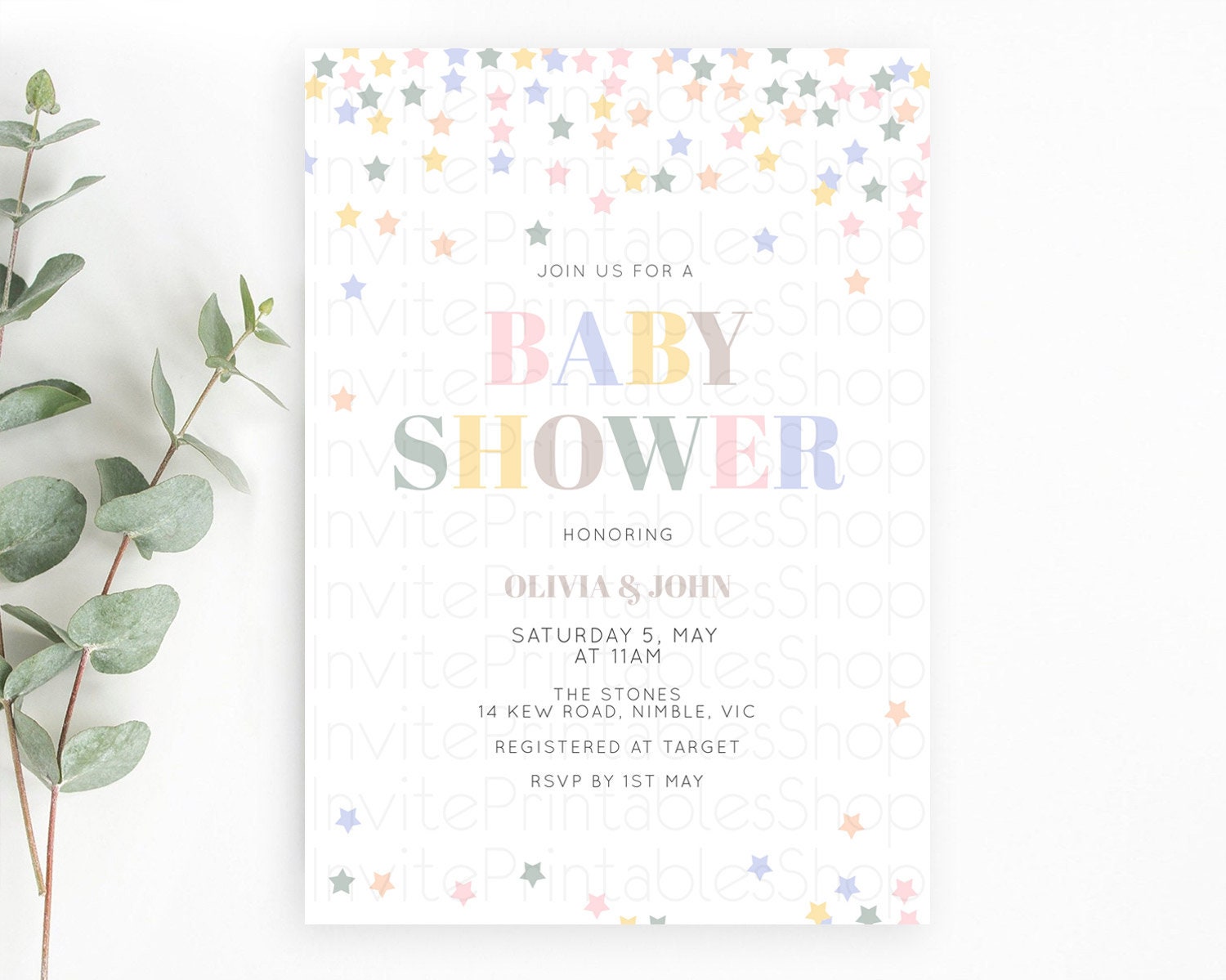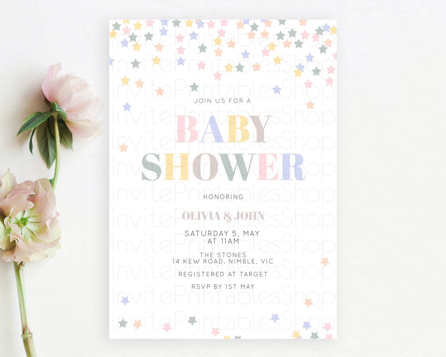 Twinkle Star Baby Shower Invitation, Pastel Rainbow Confetti Stars Twinkle Little Star, Soft Blue, Green, Pink, and Yellow, Sprinkles D10795