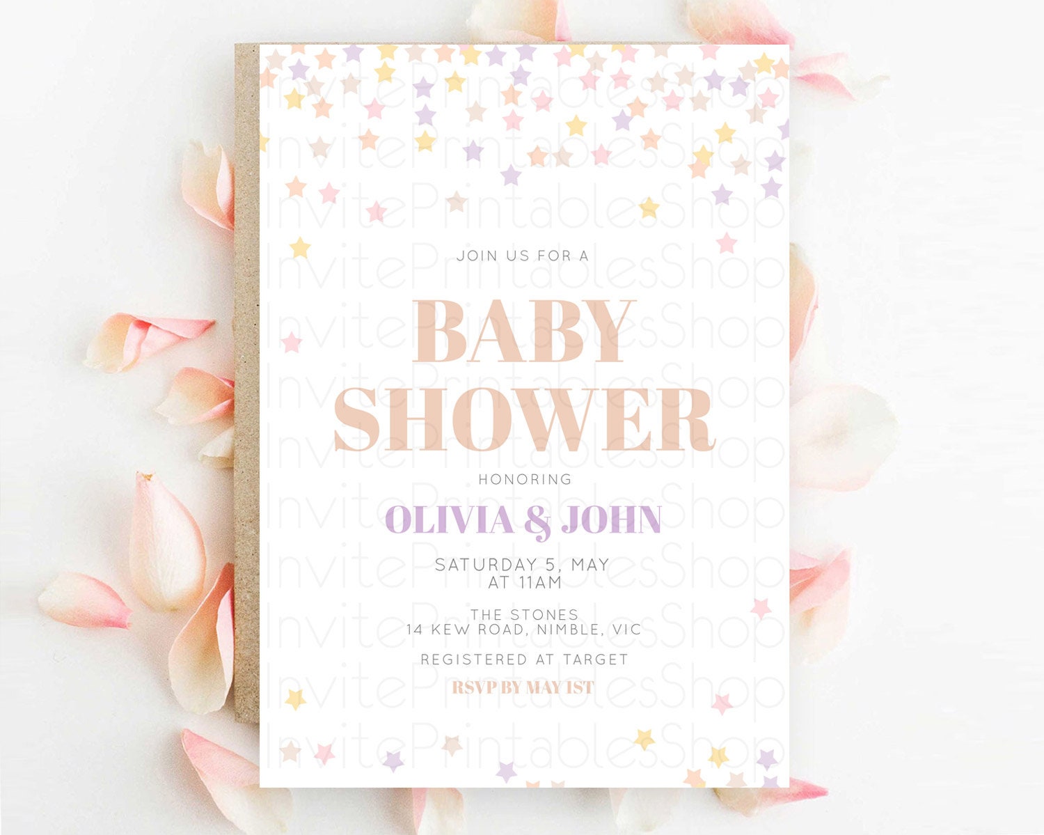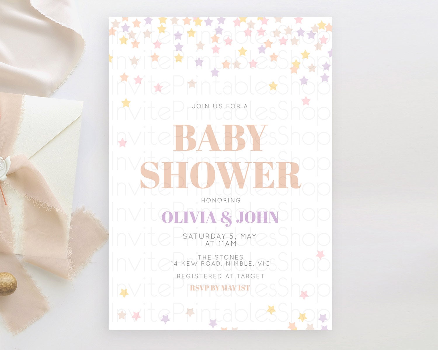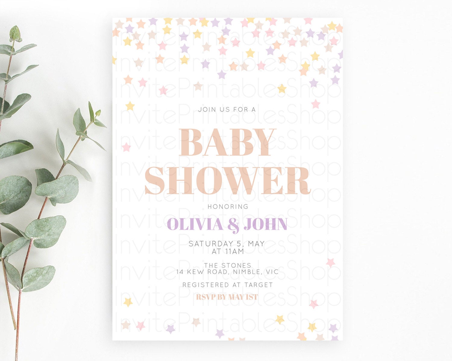 Twinkle Star Baby Shower Invitation, Star Invitation, Soft Pastel Orange and Purple Confetti Stars Twinkle Theme for Gender Reveal D10810