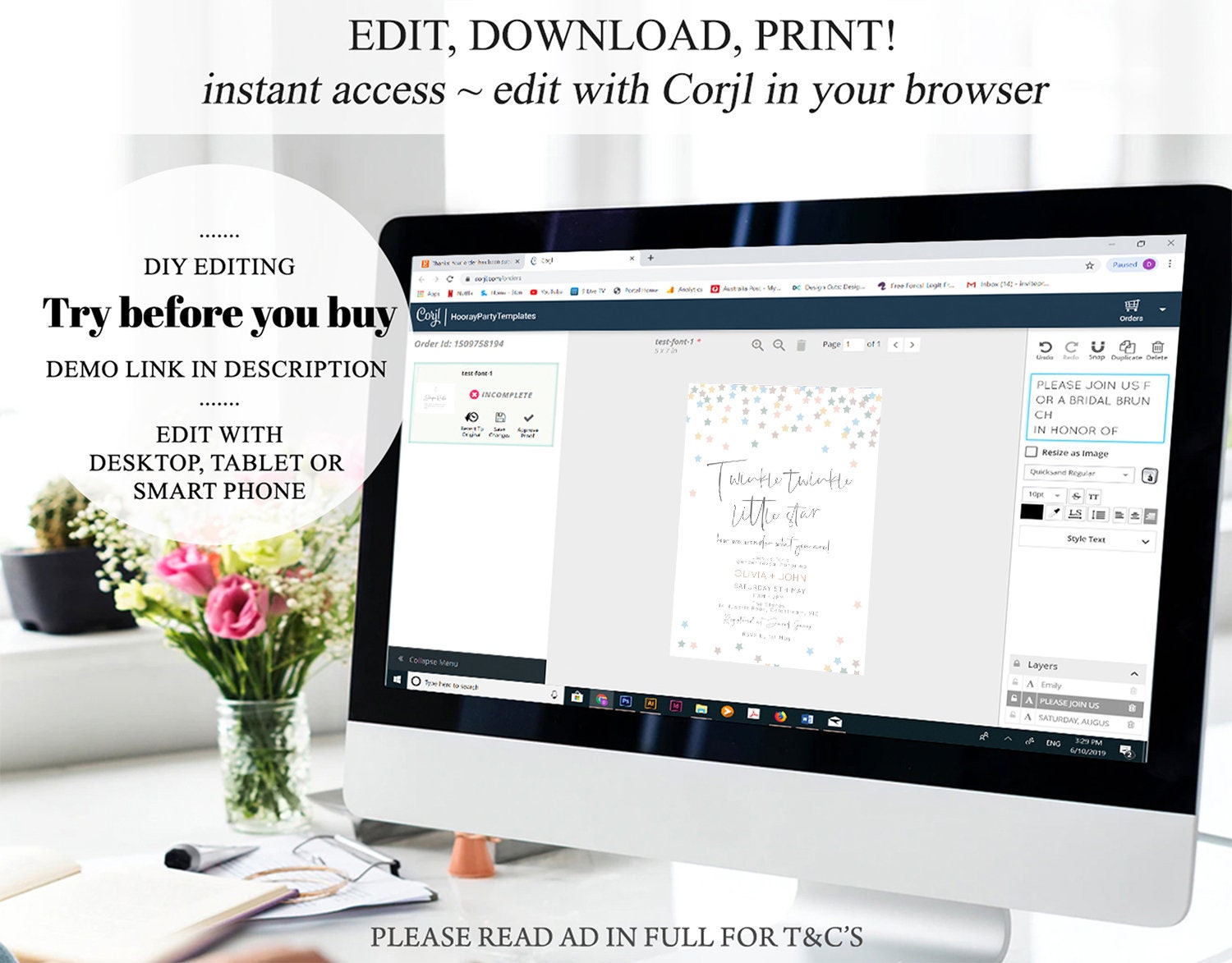 •Try before you buy! • DEMO LINK- https://www.corjl.com/d/379CNK PLEASE READ AD IN FULL!! •Digital file. No physical item will be shipped •Do it yourself Editing. Edit online with Corjl or Edit with your mobile ITEM DETAILS Invitation size: 5’x7’ File type: PDF, JPEG Resolution: 300DPI PDF FILE OPTIONS: •Recommended for printing •Ability to print multiple per page (if size permits) •Option to include bleed/ trim marks JPG FILE OPTIONS: •Recommended for MMS/ SMS/ Electronic send out •Can be used to print as photo •Option to include bleed/ trim marks EDITING • Do it yourself editing • Mobile editing is available • Google chrome is the recommend browser for Corjl. Please download here for FREE: https://www.google.com/chrome/ • Using other browsers may not show all of Corjl's editing features • Editing on a desktop/ laptop computer is recommended to access all of Corjl features • Mobile editing is available, please use a desktop/ laptop computer to access all of Corjl features DOWNLOADS & EXPIRY •Maximum 3 downloads on the same edit •Link expires 30 days after purchase DOWNLOAD NOTICE •Once you have reached your download limits &/ “approve proof” in Corjl. You will not be able to request further downloads on your design. Further download requests are not permitted WHAT IS EDITABLE •Text - colours, fonts, size, move, delete & rotation. •Please see demo link for what you can and can’t do WHAT YOU CAN’T EDIT •Template size •Template orientation •Graphics CAN NOT BE deleted, moved, or changed in colour •Please see demo link for what you can and can’t do HOW TO 1. Choose design template & checkout on Etsy. 2. Email will be sent from Corjl. Follow link to access template 3. Edit, save & print INSTRUCTIONS •Instructions on how to edit your design have been written by Corjl and will be available with your purchase. PRINTING •Colours can vary depending on the monitor, printer & cardstock •Can be printed at home •Home printing will require you to select the high quality print settings, select appropriate paper thickness & click "Actual size" prior to you printing •This design was test printed on 100 gsm paper •Can be printed at local print shop. Please check printing requirements & any printing restrictions prior to purchase PERSONAL USE ONLY. This item cannot be shared, re-sold, or used commercially for profit. REFUND POLICY •We are unable to provide a refund/ exchange on commenced & completed work, instant downloads or self-editing link templates. Please use the demo link to work out if this product is right for you. Copyright © 2018 by InvitePrintablesShop PTY LTD All rights reserved. This file or any portion thereof may not be reproduced or resold without the express written permission of the publisher (including edits to the design). Our files are provided as high-resolution PDFs – the end result is dependent upon the printer and paper used. If using a professional printing company, InvitePrintablesShop are not responsible for their specific printing requirements, paper or colour quality. Any changes required to the template are not included with your purchase – the files come as described in the listing only and cannot be changed. Thank you for visiting Invite Printables Shop:)