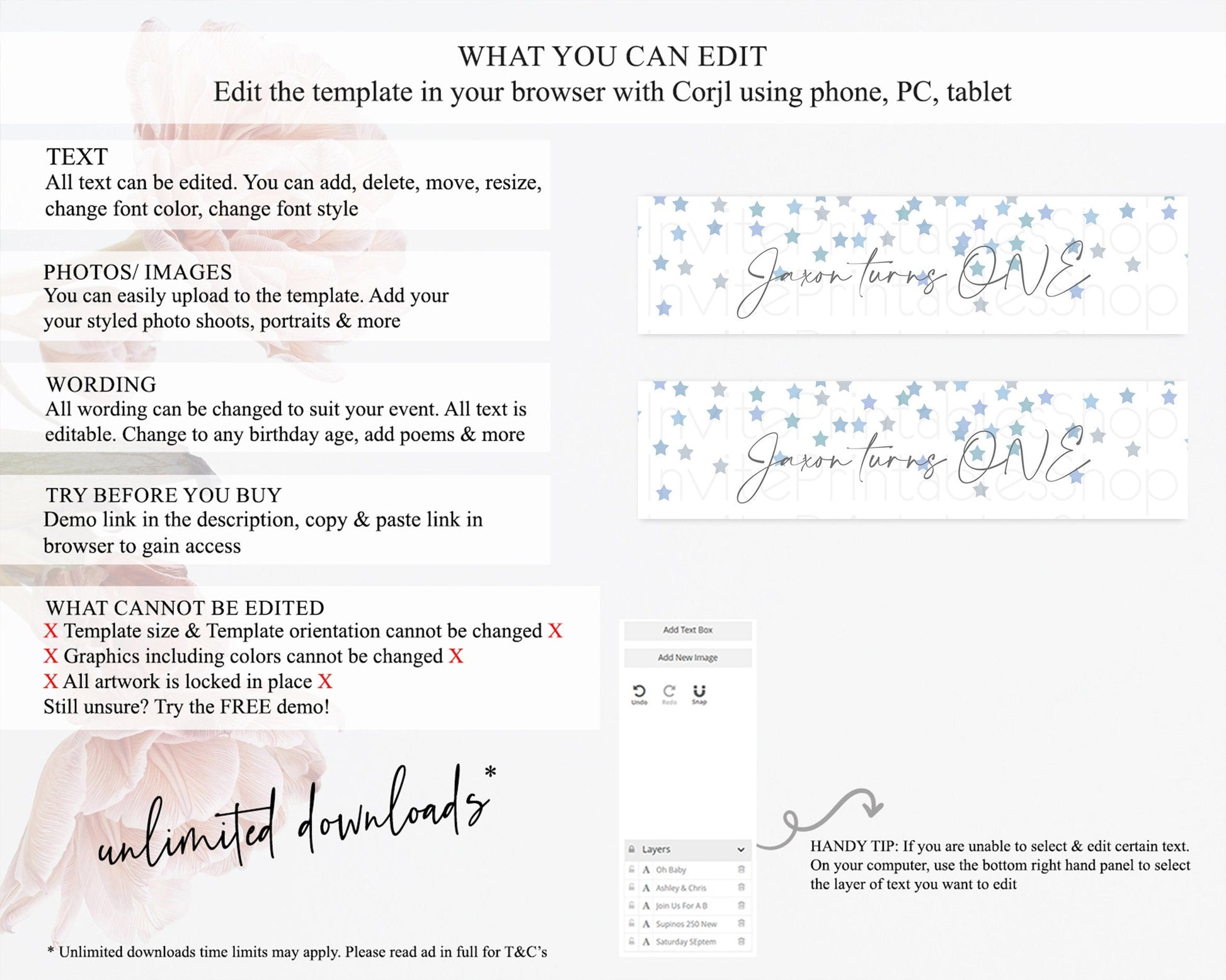 • After purchase, Corjl emails your editing link. Allow up to 15 minutes for delivery.