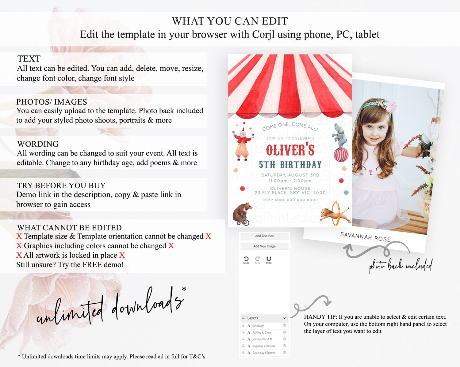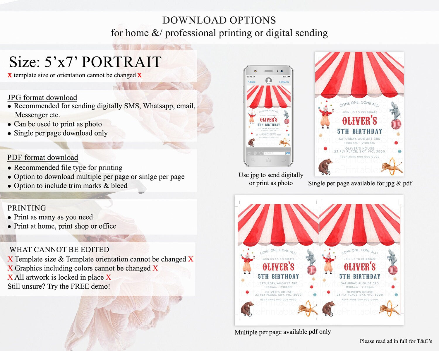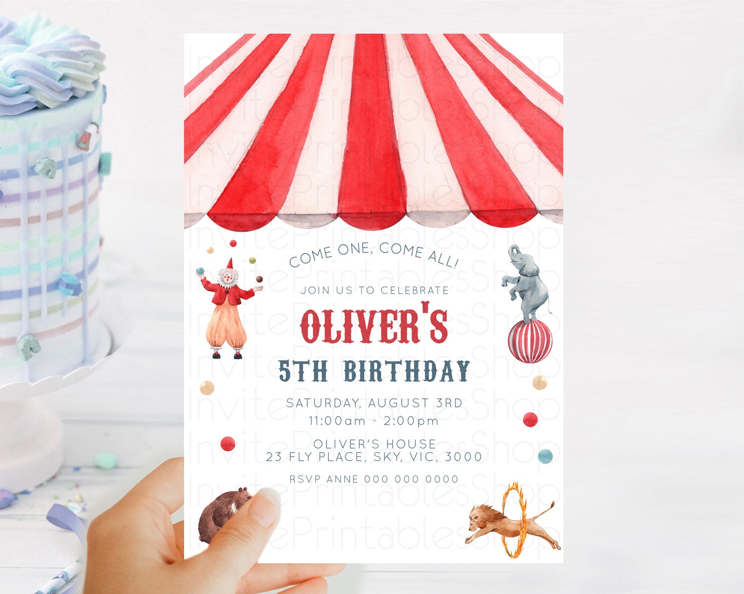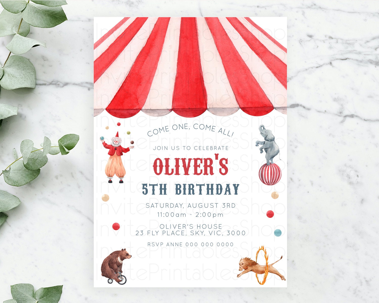 Vintage Circus Birthday Invitation | Carnival Fun | Clown, Lion, Elephant | Circus Tent Design D10533