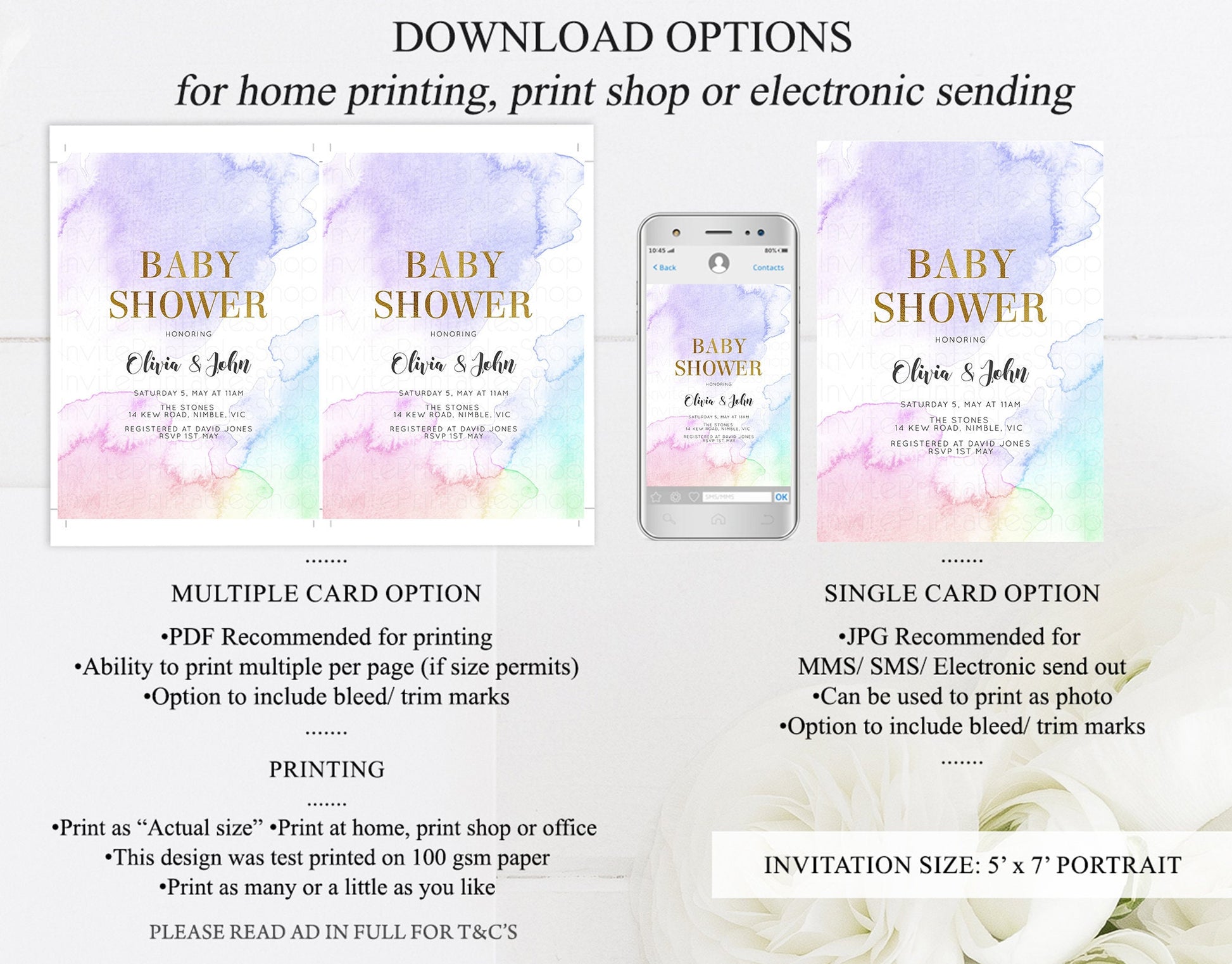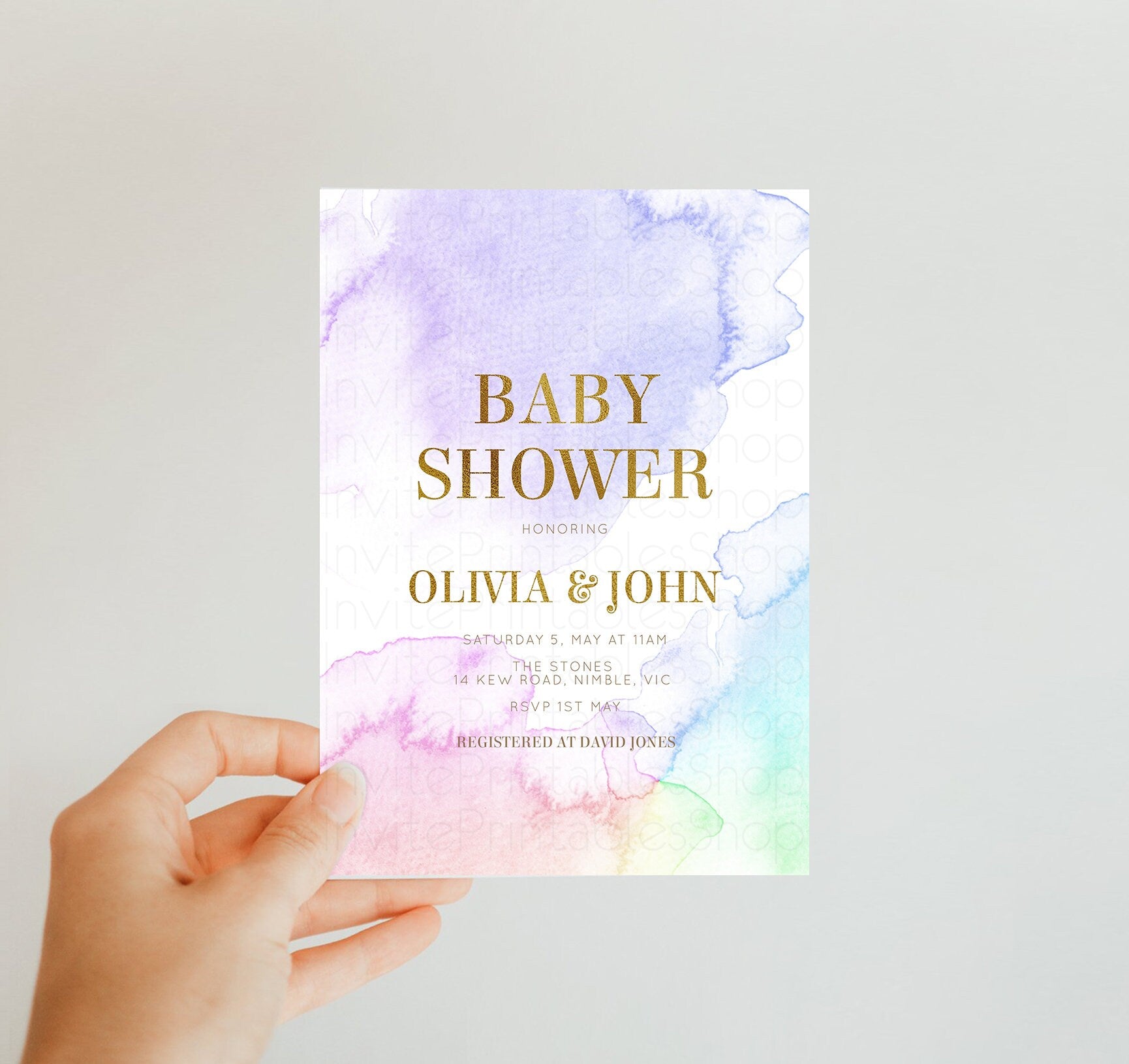Watercolor Baby Shower Invitation Gold Glitter Splash Ink Pastel Rainbow Colorful Blue Pink Purple Gender Neutral Editable Invite Template