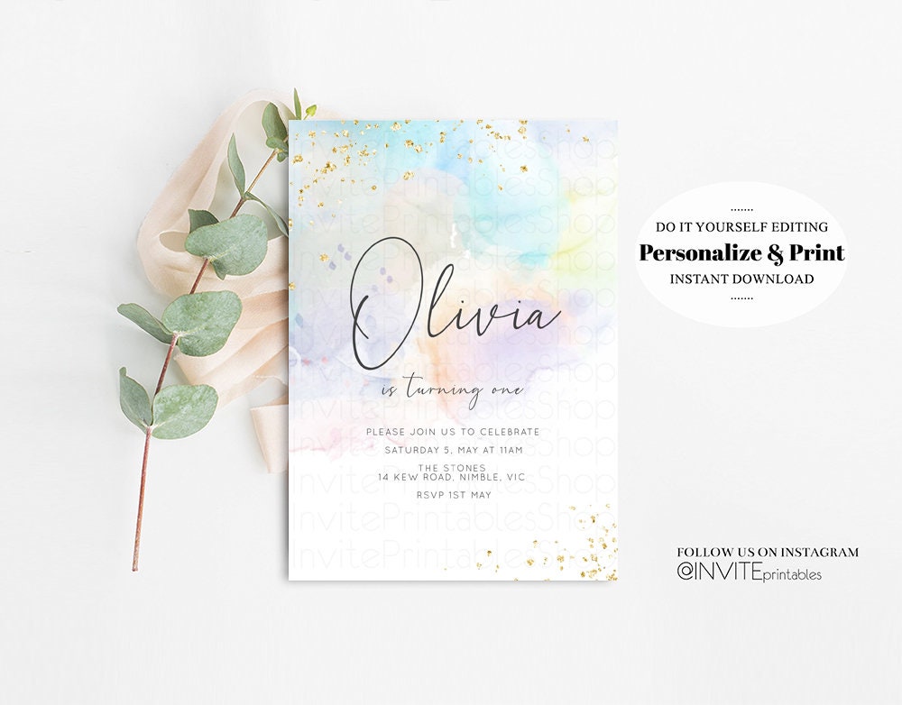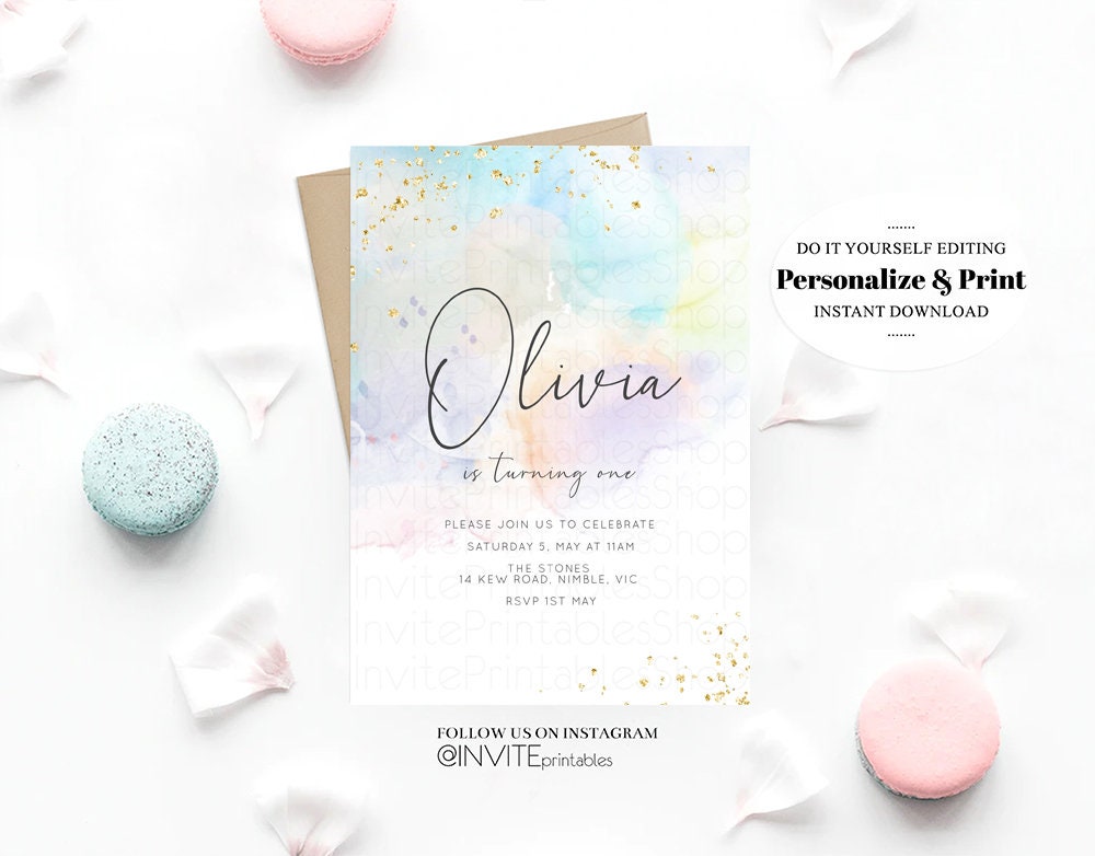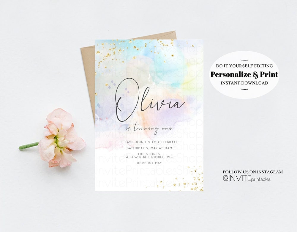 Watercolor Birthday Invitation Colorful Pastel Rainbow Splash Ombre Ink Paint Purple Blue Yellow Modern Simple Custom Printable 136