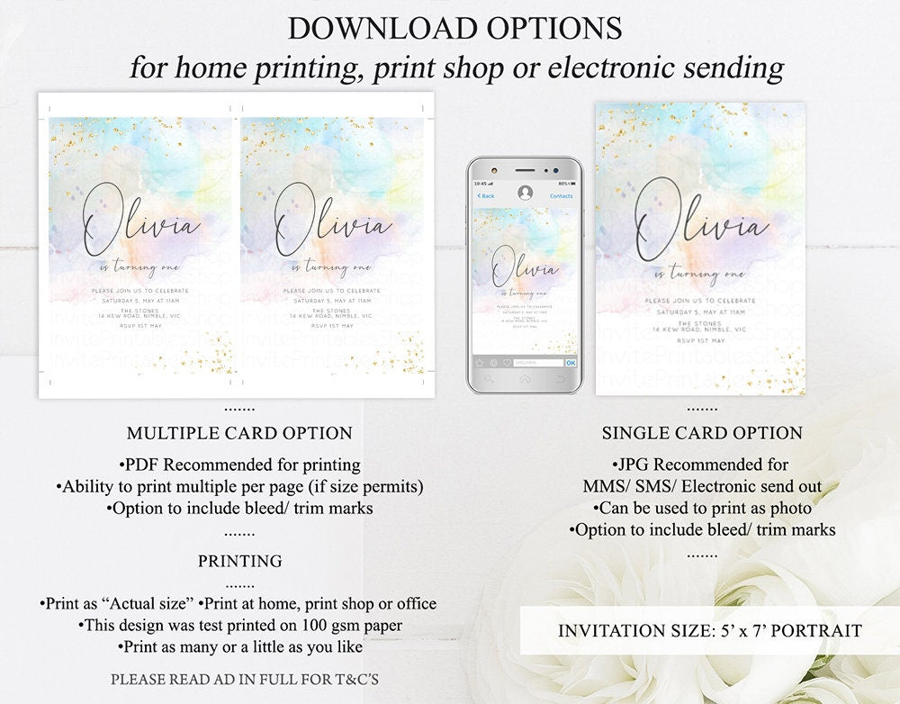 •Try before you buy! • DEMO LINK- https://www.corjl.com/d/1O6LHO Matching items: https://etsy.me/323gON8 PLEASE READ AD IN FULL!! •Digital file. No physical item will be shipped •Do it yourself Editing. Edit online with Corjl or Edit with your mobile ITEM DETAILS Invitation size: 5’x7’ File type: PDF, JPEG Resolution: 300DPI PDF FILE OPTIONS: •Recommended for printing •Ability to print multiple per page (if size permits) •Option to include bleed/ trim marks JPG FILE OPTIONS: •Recommended for MMS/ SMS/ Electronic send out •Can be used to print as photo •Option to include bleed/ trim marks EDITING • Do it yourself editing • Mobile editing is available • Google chrome is the recommend browser for Corjl. Please download here for FREE: https://www.google.com/chrome/ • Using other browsers may not show all of Corjl's editing features • Editing on a desktop/ laptop computer is recommended to access all of Corjl features • Mobile editing is available, please use a desktop/ laptop computer to access all of Corjl features DOWNLOADS & EXPIRY •Maximum 3 downloads on the same edit •Link expires 30 days after purchase DOWNLOAD NOTICE •Once you have reached your download limits &/ “approve proof” in Corjl. You will not be able to request further downloads on your design. Further download requests are not permitted WHAT IS EDITABLE •Text - colours, fonts, size, move, delete & rotation. •Please see demo link for what you can and can’t do WHAT YOU CAN’T EDIT •Template size •Template orientation •Graphics CAN NOT BE deleted, moved, or changed in colour •Please see demo link for what you can and can’t do HOW TO 1. Choose design template & checkout on Etsy. 2. Email will be sent from Corjl. Follow link to access template 3. Edit, save & print INSTRUCTIONS •Instructions on how to edit your design have been written by Corjl and will be available with your purchase. PRINTING •Colours can vary depending on the monitor, printer & cardstock •Can be printed at home •Home printing will require you to select the high quality print settings, select appropriate paper thickness & click "Actual size" prior to you printing •This design was test printed on 100 gsm paper •Can be printed at local print shop. Please check printing requirements & any printing restrictions prior to purchase PERSONAL USE ONLY. This item cannot be shared, re-sold, or used commercially for profit. REFUND POLICY •We are unable to provide a refund/ exchange on commenced & completed work, instant downloads or self-editing link templates. Please use the demo link to work out if this product is right for you. Copyright © 2018 by InvitePrintablesShop PTY LTD All rights reserved. This file or any portion thereof may not be reproduced or resold without the express written permission of the publisher (including edits to the design). Our files are provided as high-resolution PDFs – the end result is dependent upon the printer and paper used. If using a professional printing company, InvitePrintablesShop are not responsible for their specific printing requirements, paper or colour quality. Any changes required to the template are not included with your purchase – the files come as described in the listing only and cannot be changed. Thank you for visiting Invite Printables Shop:)