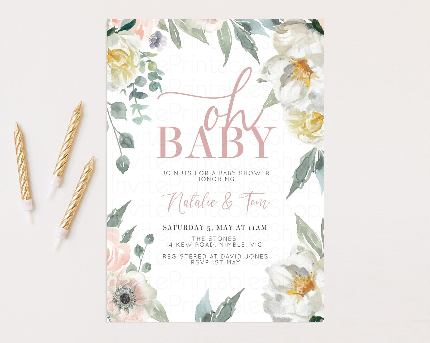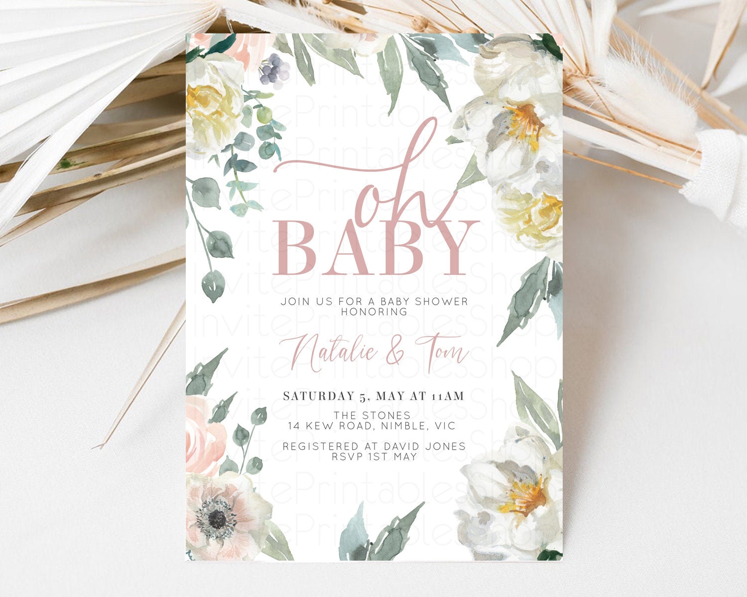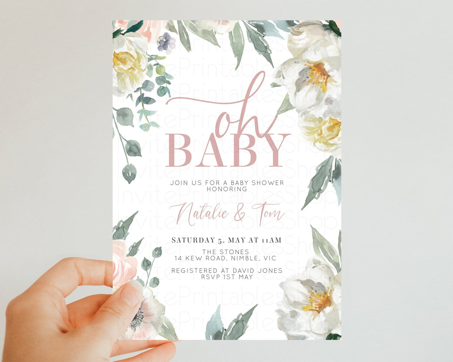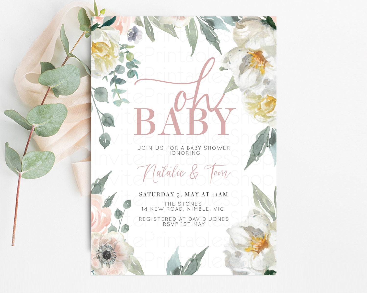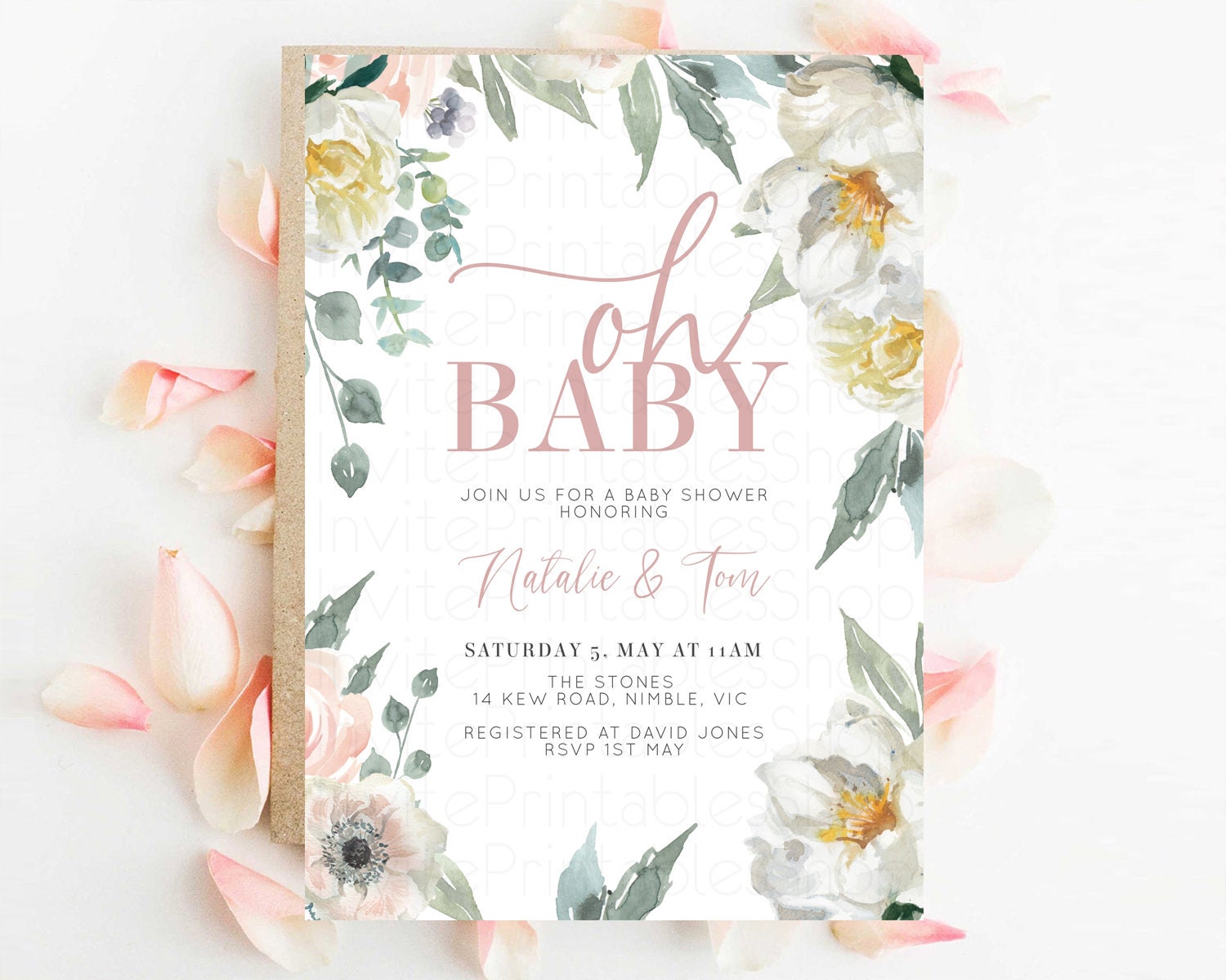 White Florals Baby Shower Invitation Secret Garden Whimsical Enchanted Fairytale Forest Wreath Watercolor Spring Flowers Invite W108