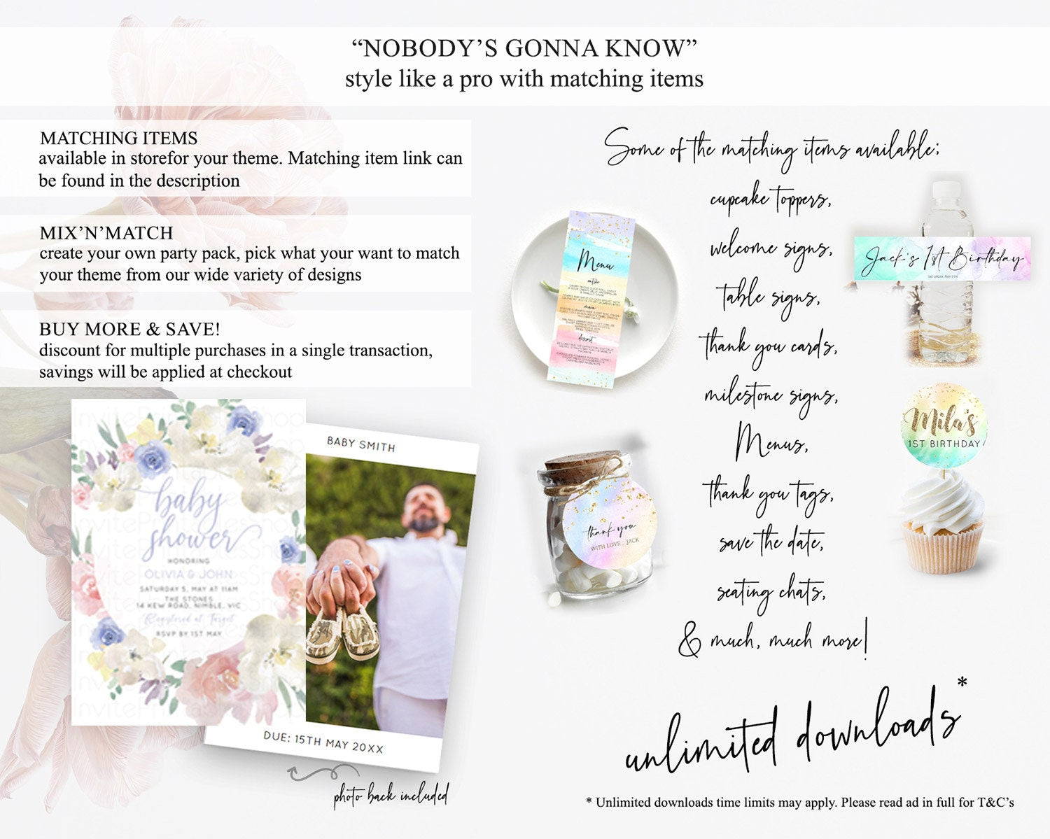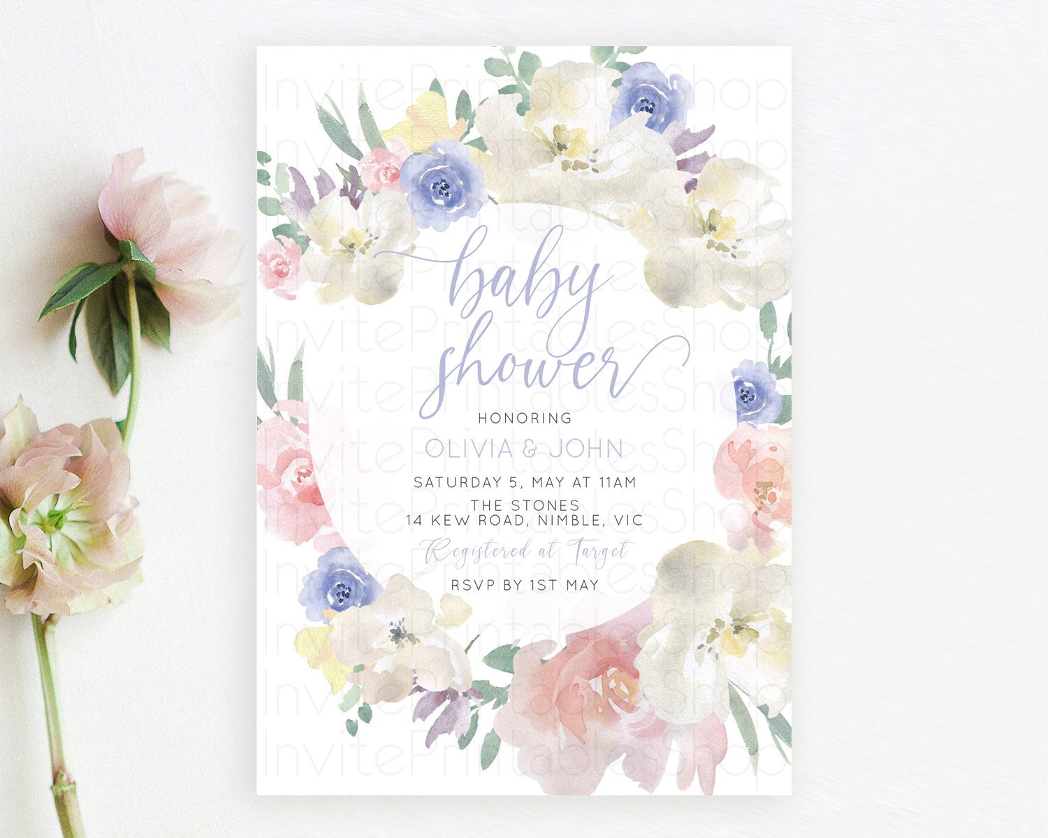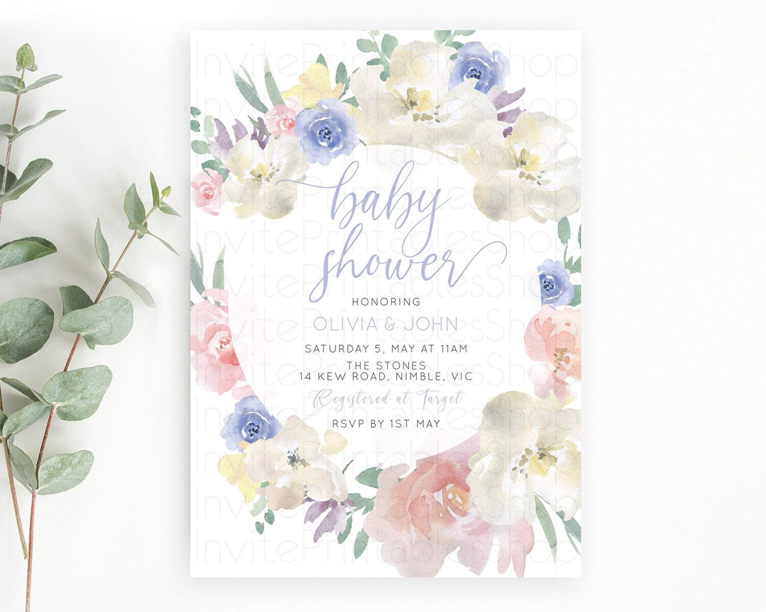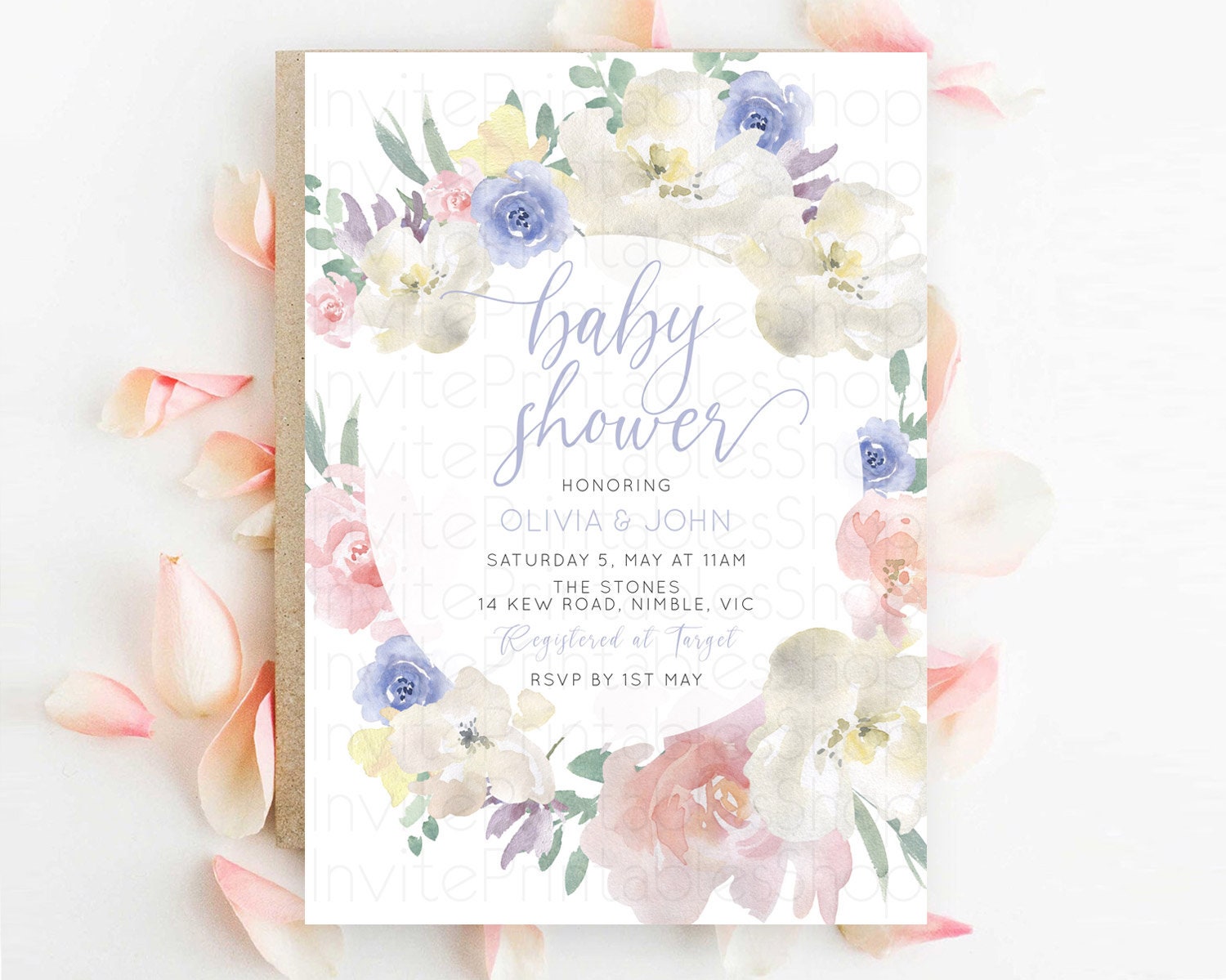 Wildflower Baby Shower Invitation, Secret Garden with Pastel Flowers, Botanical - Soft Organic Pink, Blue, and White Floral Theme D10841