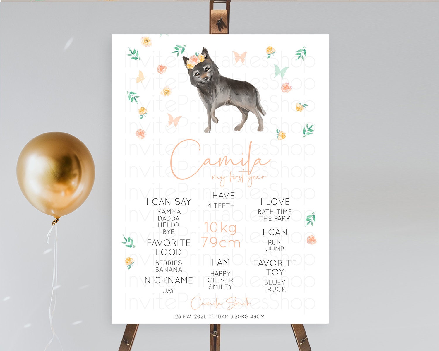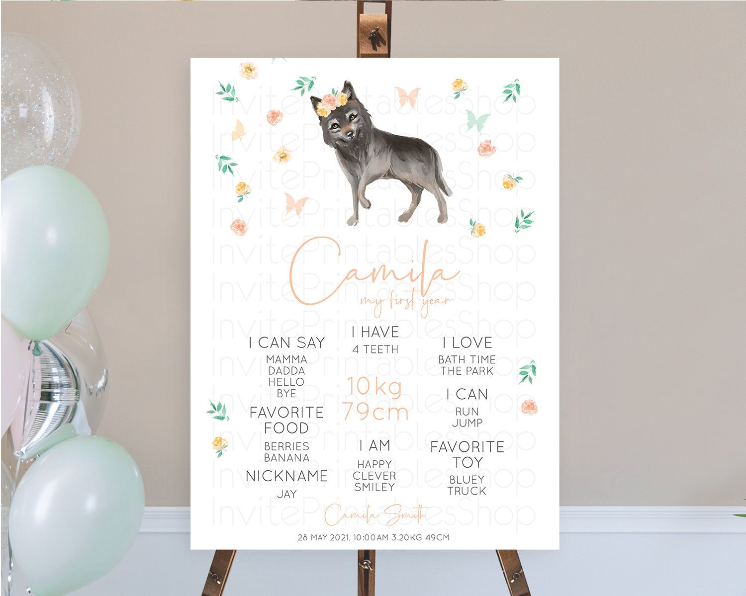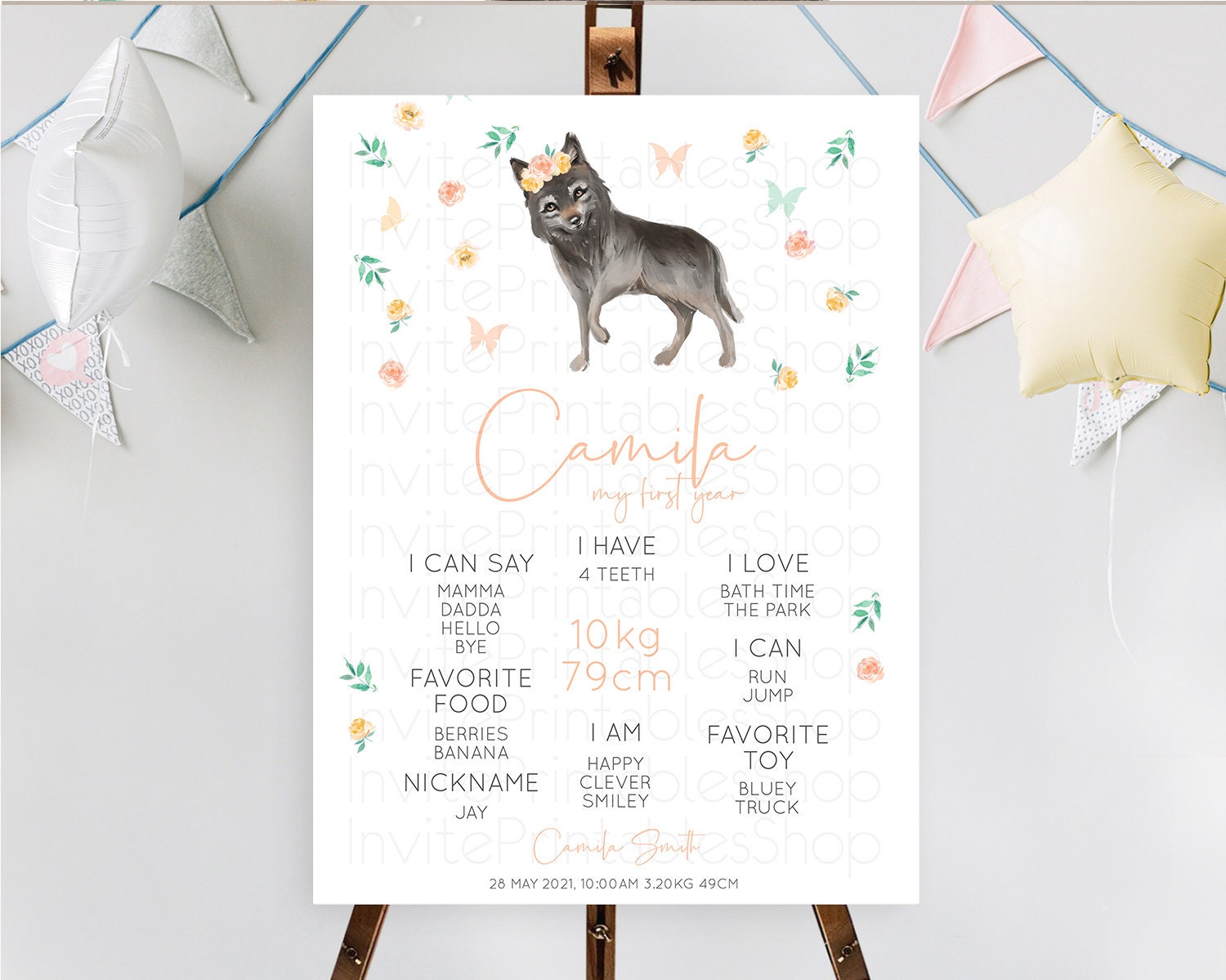 Wolf First Birthday Milestone Poster Wolf Milestone Board Pastel Floral Wolf Milestone First Birthday Welcome Sign D10362