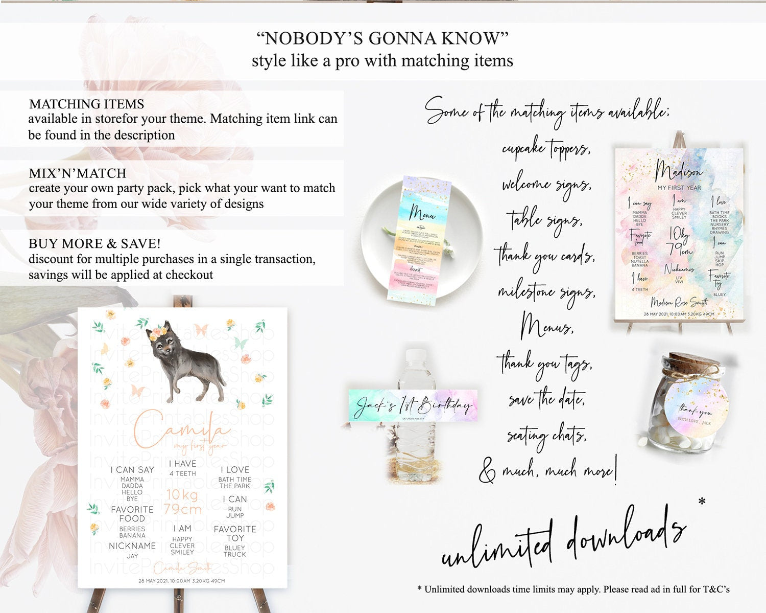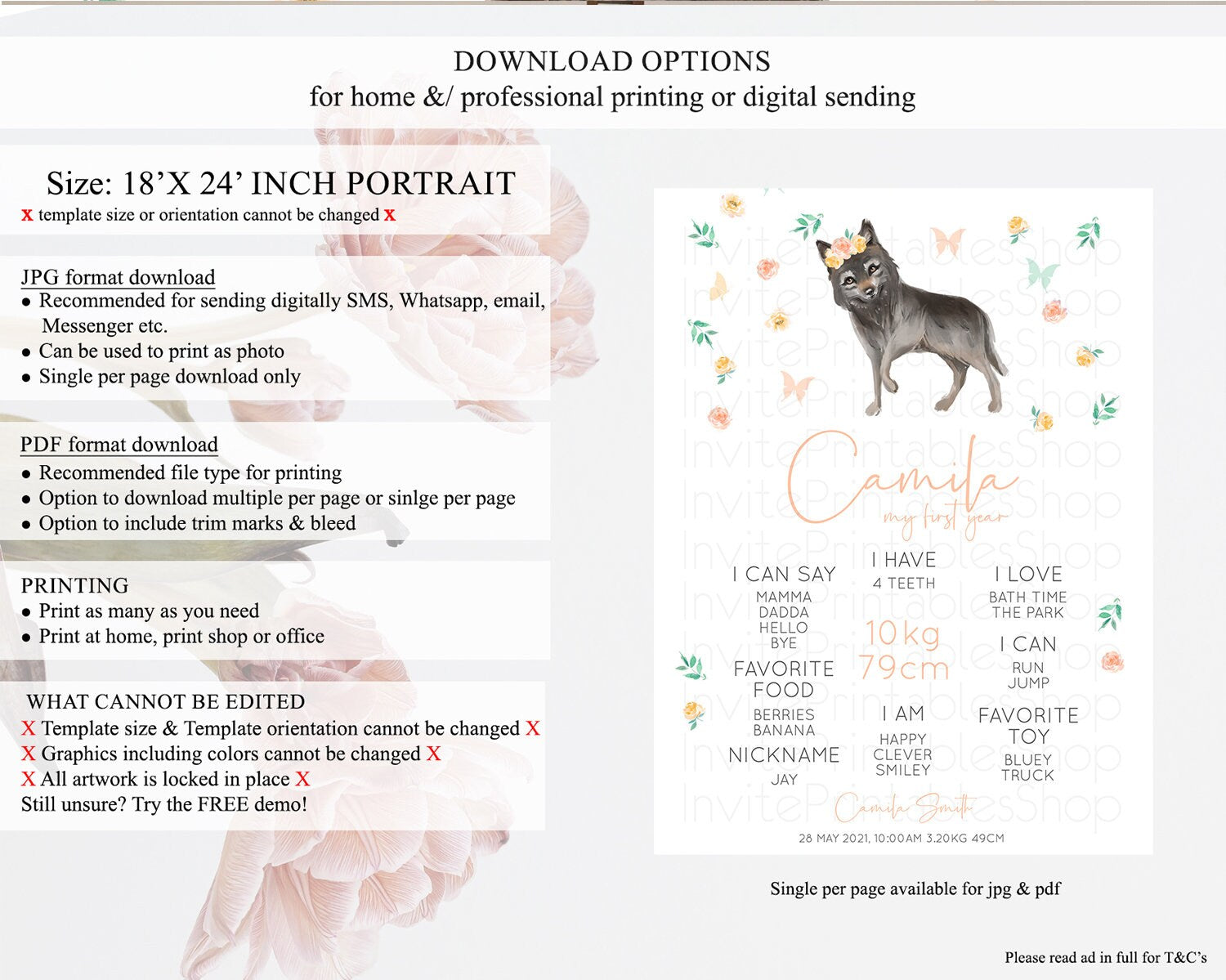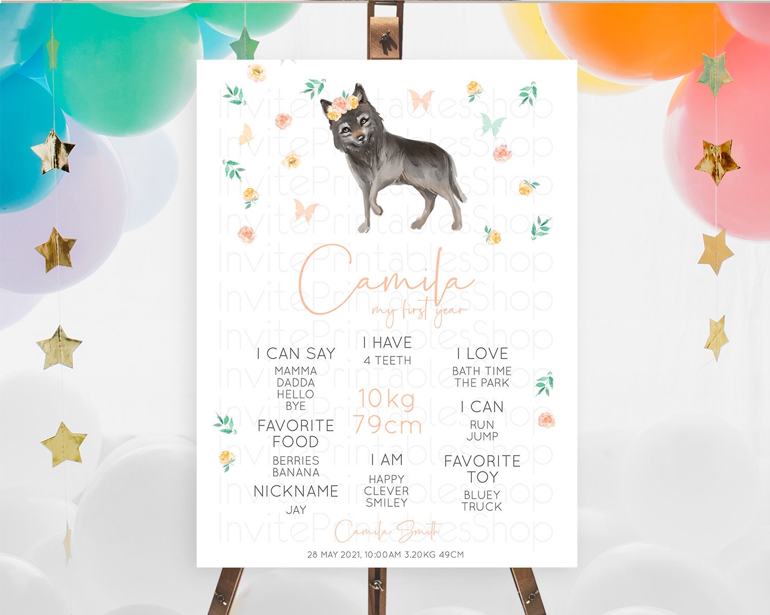 Wolf First Birthday Milestone Poster Wolf Milestone Board Pastel Floral Wolf Milestone First Birthday Welcome Sign D10362