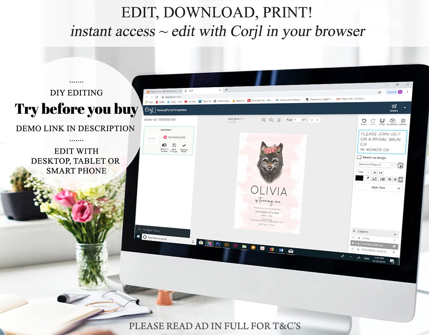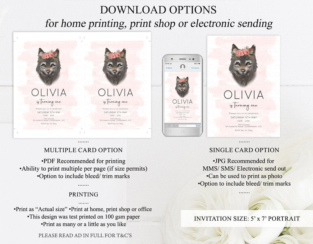 •Try before you buy! • DEMO LINK- https://www.corjl.com/d/3CPLN1 PLEASE READ AD IN FULL!! •Digital file. No physical item will be shipped •Do it yourself Editing. Edit online with Corjl or Edit with your mobile ITEM DETAILS Invitation size: 5’x7’ File type: PDF, JPEG Resolution: 300DPI PDF FILE OPTIONS: •Recommended for printing •Ability to print multiple per page (if size permits) •Option to include bleed/ trim marks JPG FILE OPTIONS: •Recommended for MMS/ SMS/ Electronic send out •Can be used to print as photo •Option to include bleed/ trim marks EDITING • Do it yourself editing • Mobile editing is available • Google chrome is the recommend browser for Corjl. Please download here for FREE: https://www.google.com/chrome/ • Using other browsers may not show all of Corjl's editing features • Editing on a desktop/ laptop computer is recommended to access all of Corjl features • Mobile editing is available, please use a desktop/ laptop computer to access all of Corjl features DOWNLOADS & EXPIRY •Maximum 3 downloads on the same edit •Link expires 30 days after purchase DOWNLOAD NOTICE •Once you have reached your download limits &/ “approve proof” in Corjl. You will not be able to request further downloads on your design. Further download requests are not permitted WHAT IS EDITABLE •Text - colours, fonts, size, move, delete & rotation. •Please see demo link for what you can and can’t do WHAT YOU CAN’T EDIT •Template size •Template orientation •Graphics CAN NOT BE deleted, moved, or changed in colour •Please see demo link for what you can and can’t do HOW TO 1. Choose design template & checkout on Etsy. 2. Email will be sent from Corjl. Follow link to access template 3. Edit, save & print INSTRUCTIONS •Instructions on how to edit your design have been written by Corjl and will be available with your purchase. PRINTING •Colours can vary depending on the monitor, printer & cardstock •Can be printed at home •Home printing will require you to select the high quality print settings, select appropriate paper thickness & click "Actual size" prior to you printing •This design was test printed on 100 gsm paper •Can be printed at local print shop. Please check printing requirements & any printing restrictions prior to purchase PERSONAL USE ONLY. This item cannot be shared, re-sold, or used commercially for profit. REFUND POLICY •We are unable to provide a refund/ exchange on commenced & completed work, instant downloads or self-editing link templates. Please use the demo link to work out if this product is right for you. Copyright © 2018 by InvitePrintablesShop PTY LTD All rights reserved. This file or any portion thereof may not be reproduced or resold without the express written permission of the publisher (including edits to the design). Our files are provided as high-resolution PDFs – the end result is dependent upon the printer and paper used. If using a professional printing company, InvitePrintablesShop are not responsible for their specific printing requirements, paper or colour quality. Any changes required to the template are not included with your purchase – the files come as described in the listing only and cannot be changed. Thank you for visiting Invite Printables Shop:)