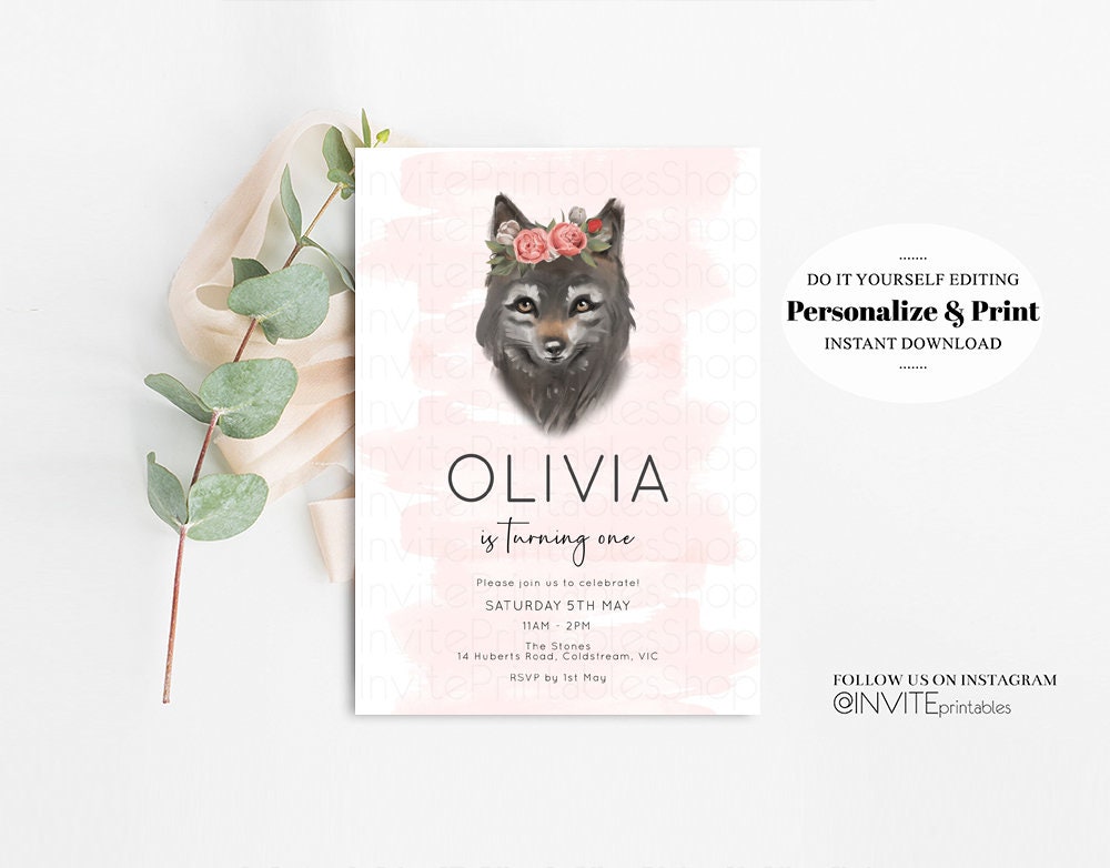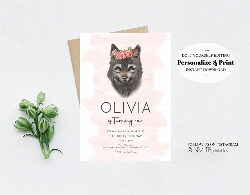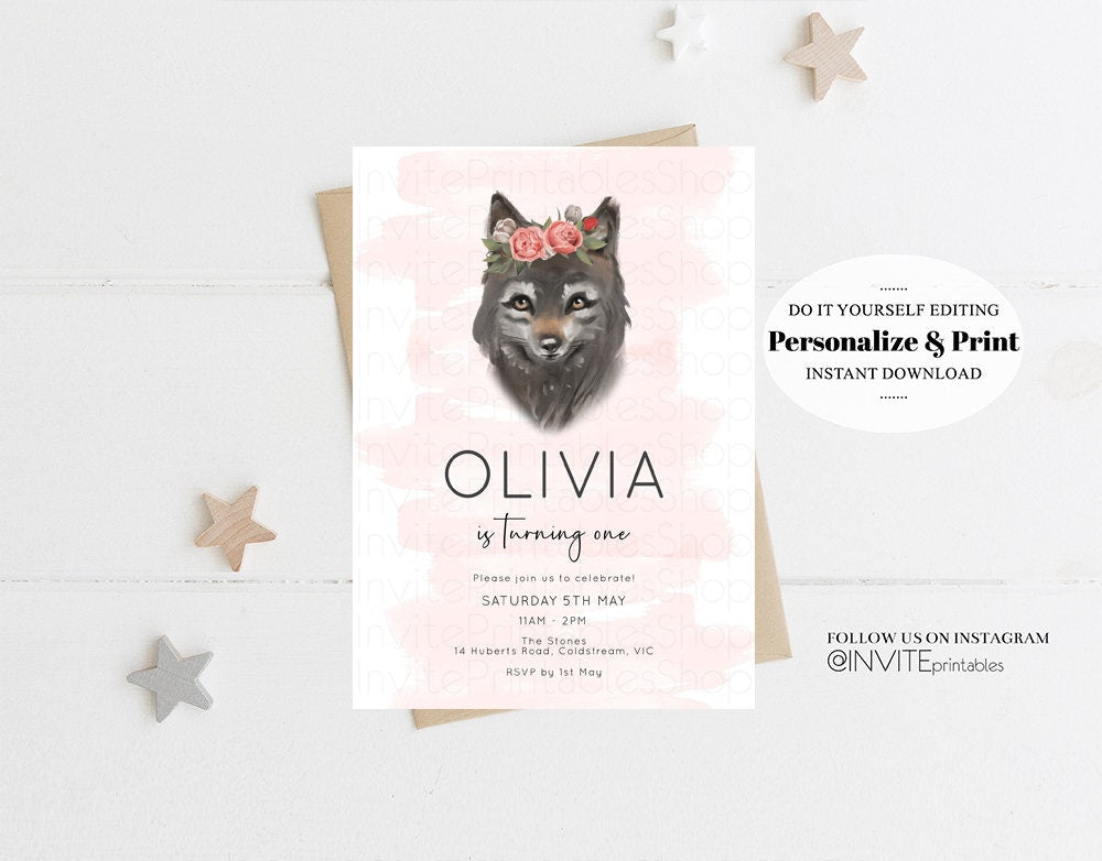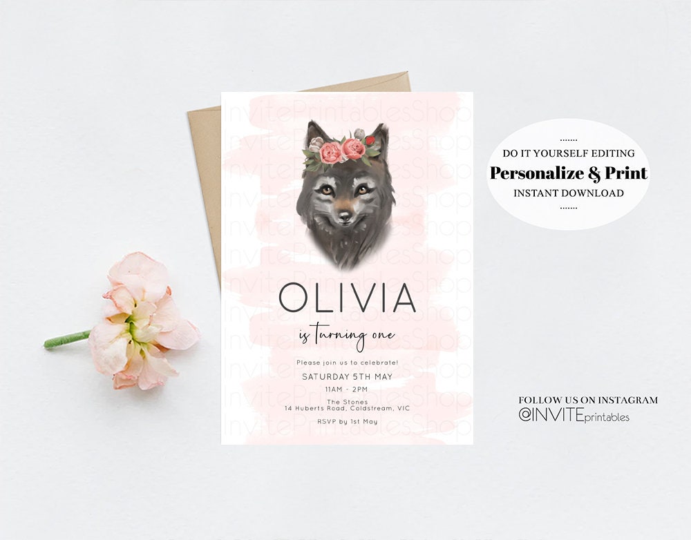 Wolf Invitation Wolf Birthday Invite Grey Baby Wolf Tribal Boho Pink Pastel Flower Crown Greenery Garden Forest Custom Invite