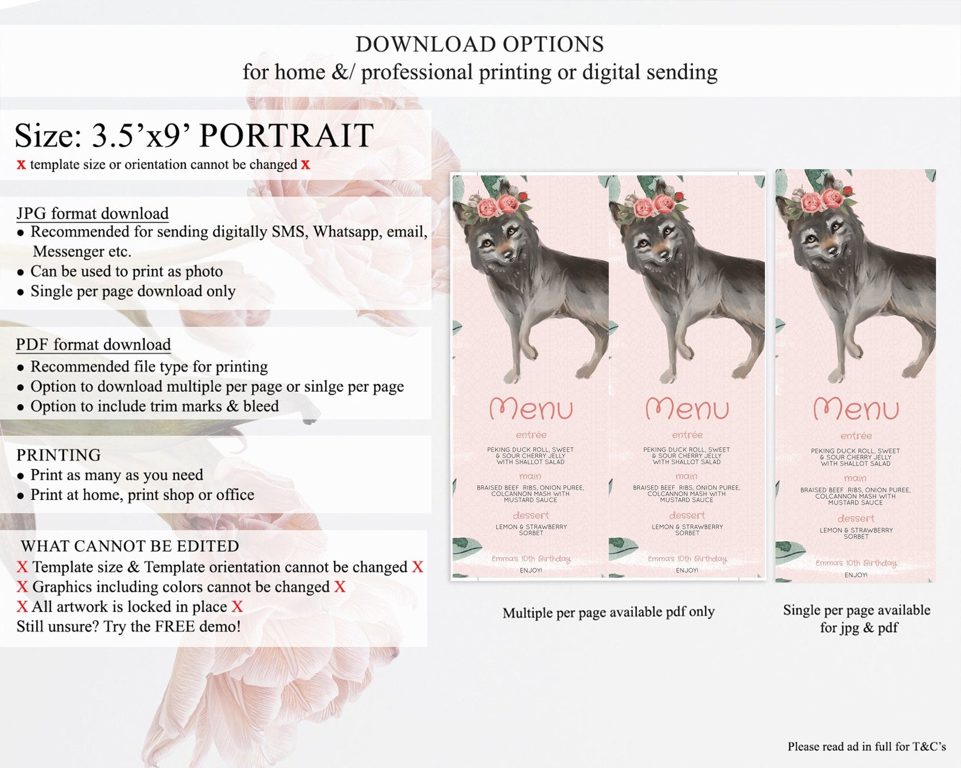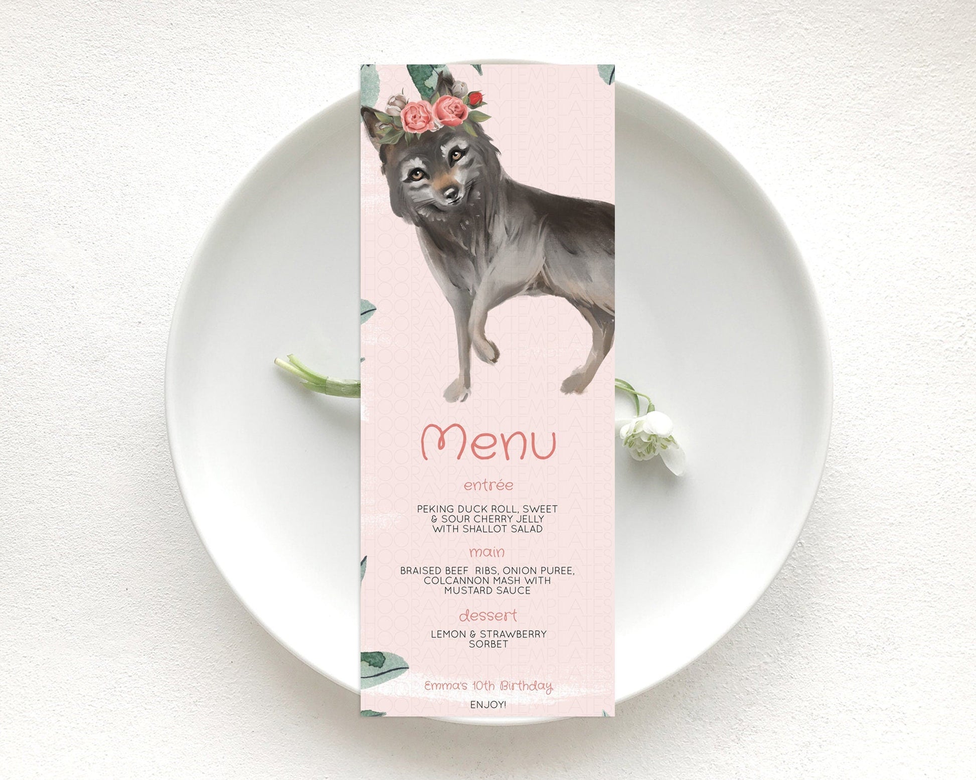 Wolf Menu Wolf Menu Template Pastel Floral Wolf Table Decor Forest Wolf Party Decor Wolf Dinner Dessert Menu Wolf Party Food Menu D10535