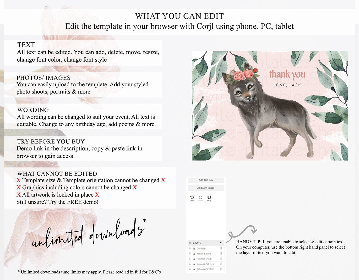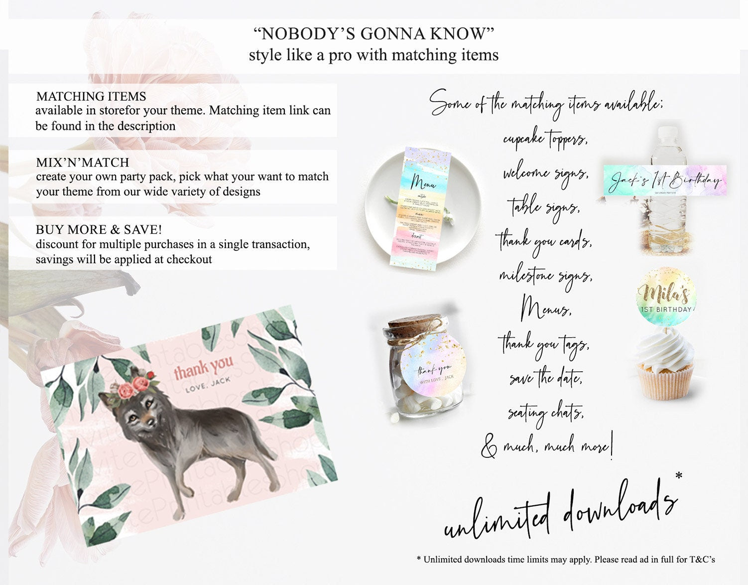 Wolf Thank You Wolf Thank You Card Pastel Floral Wolf Birthday Thank You Card Forest Wolf Party Decor Wolf Birthday Thank You Cards D10535