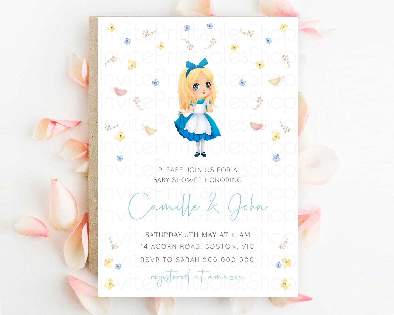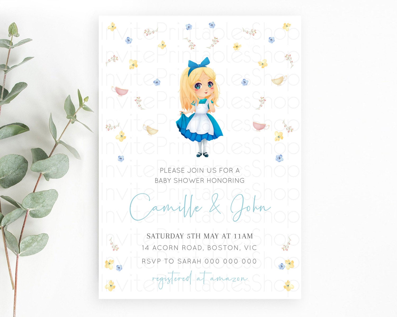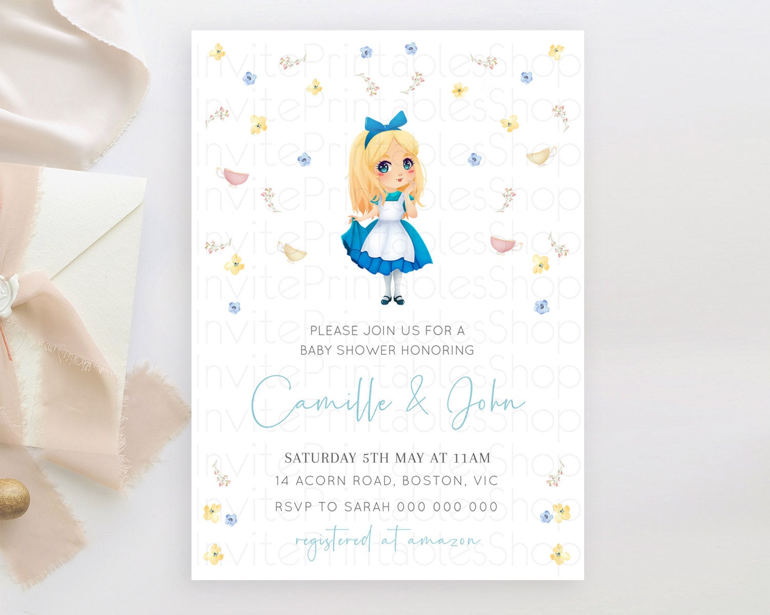 Wonderland Baby Shower Invitation- Garden Tea Party, Tea Cup, Blooms Botanical, Secret Garden Confetti Pastel Blue Yellow Pink Floral D10886