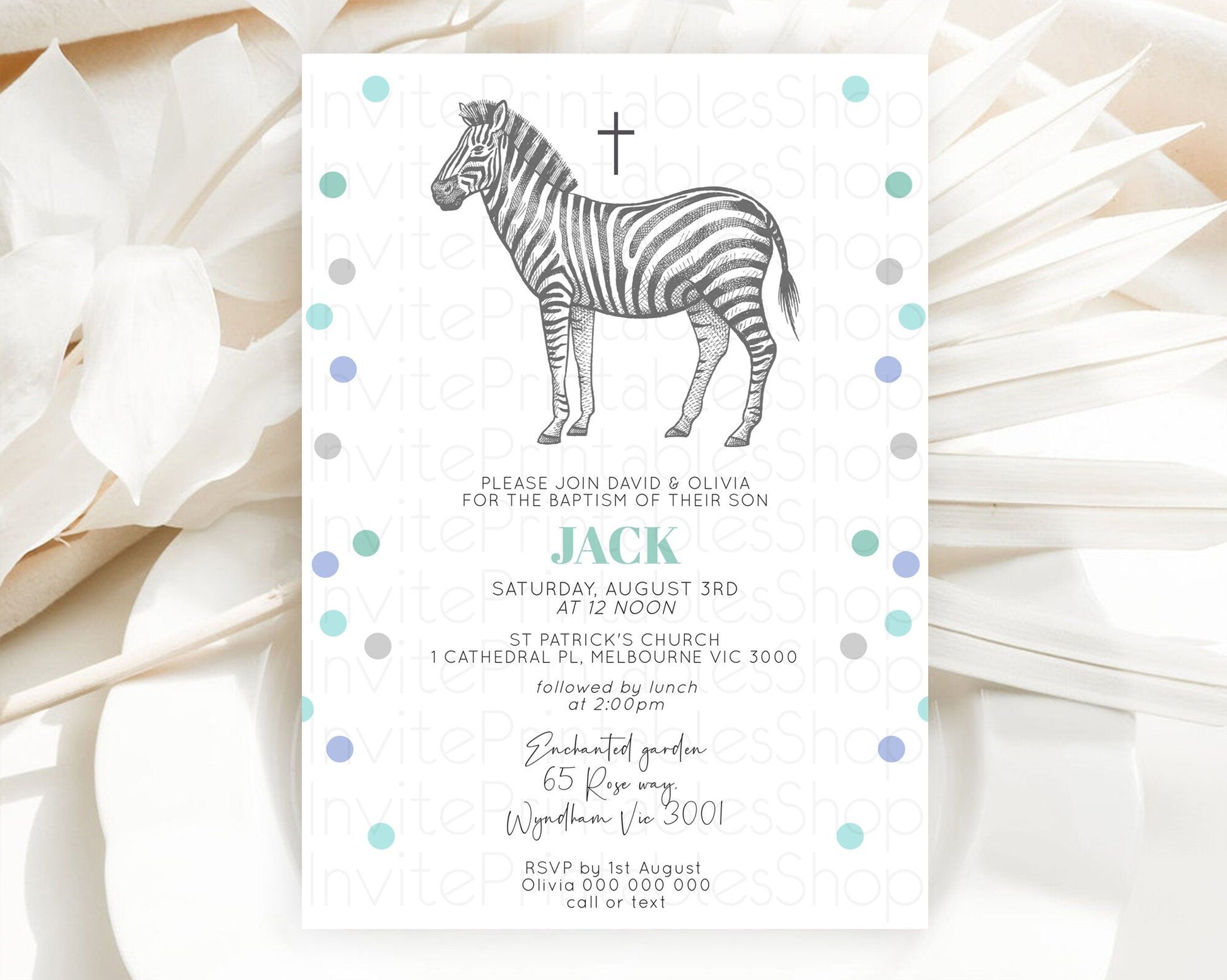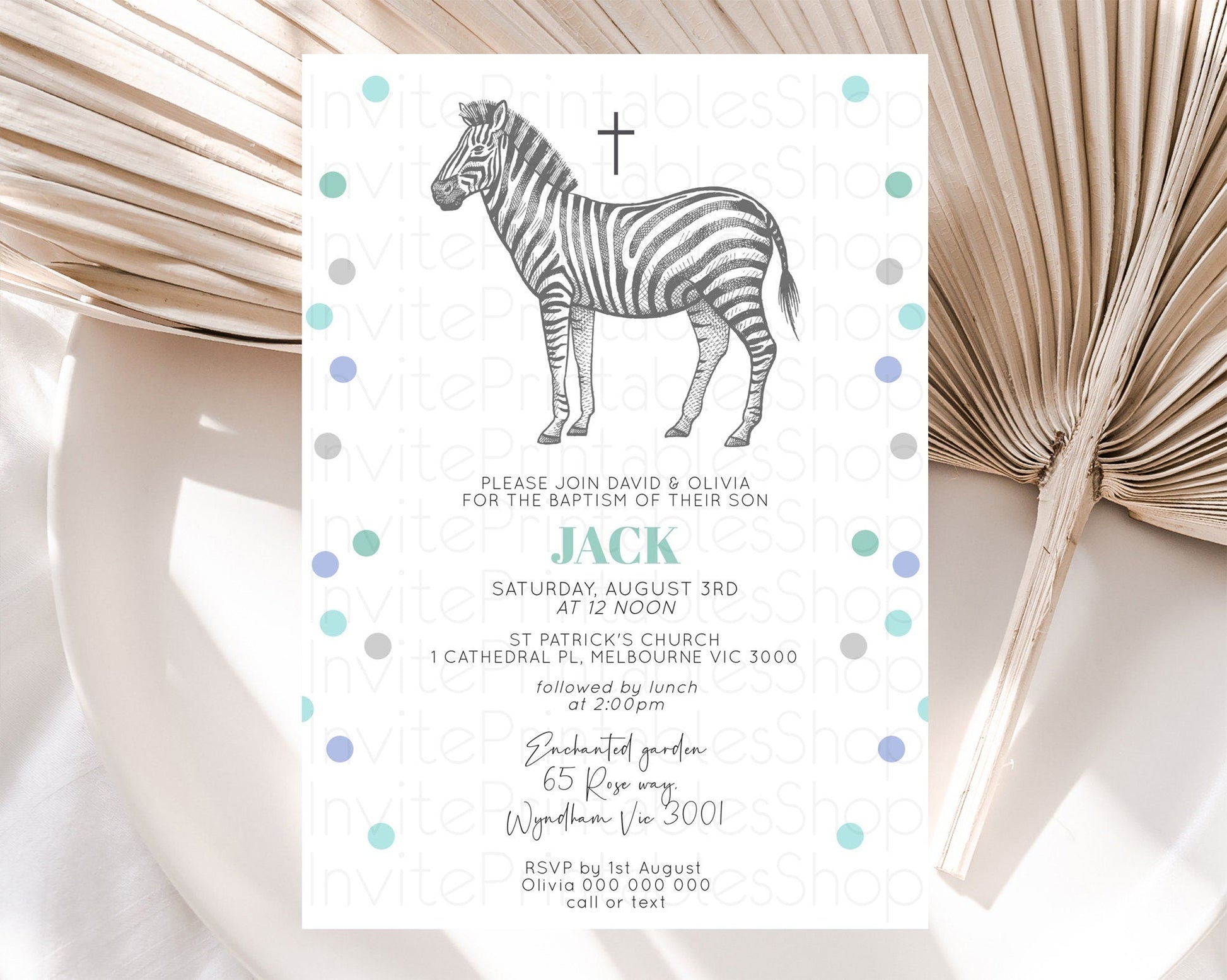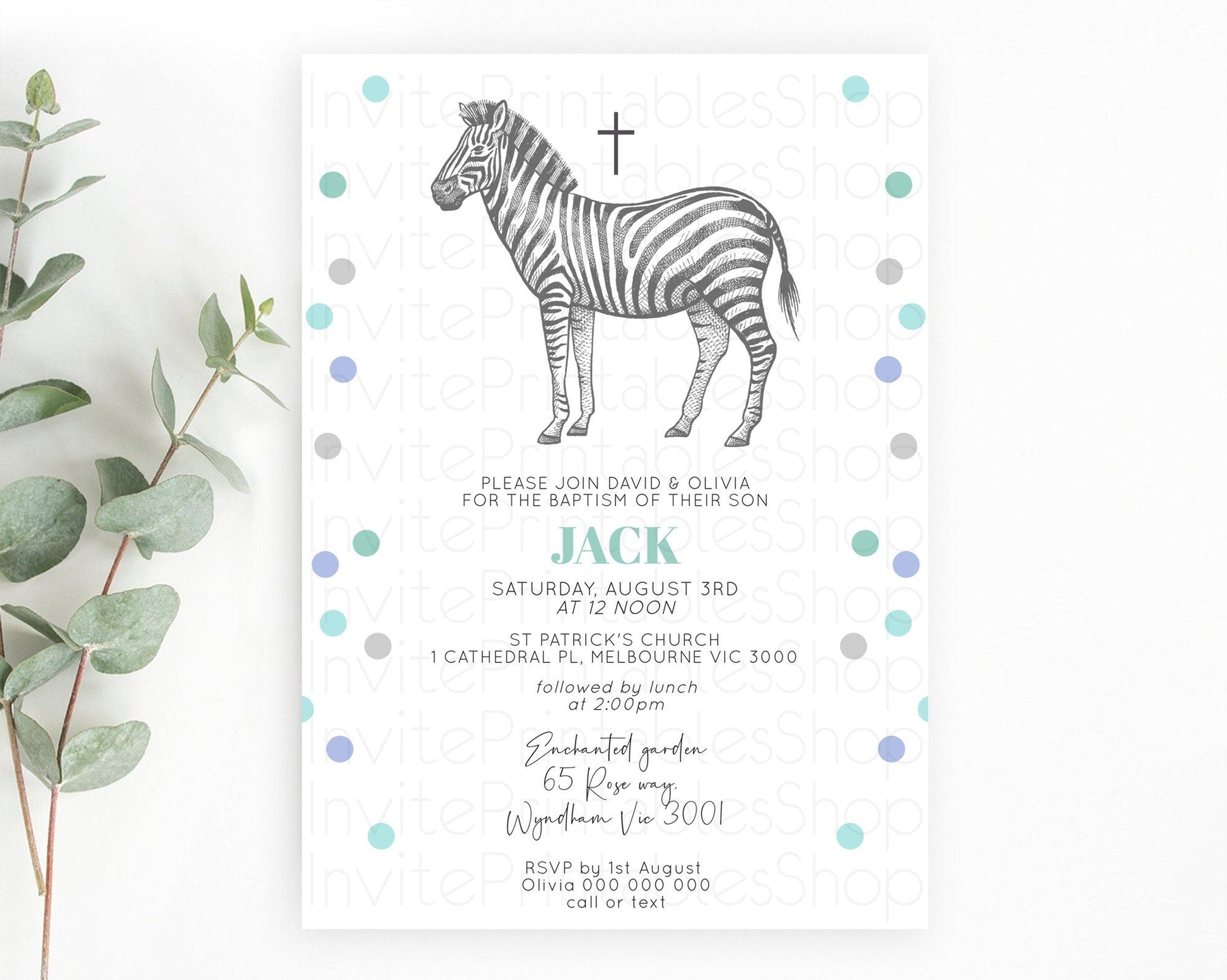 Zebra Baptism Invitation Zebra Baptism 1st Birthday Invitation Jungle Safari Christening Invite Watercolor Tropical Zoo Adventure D10856