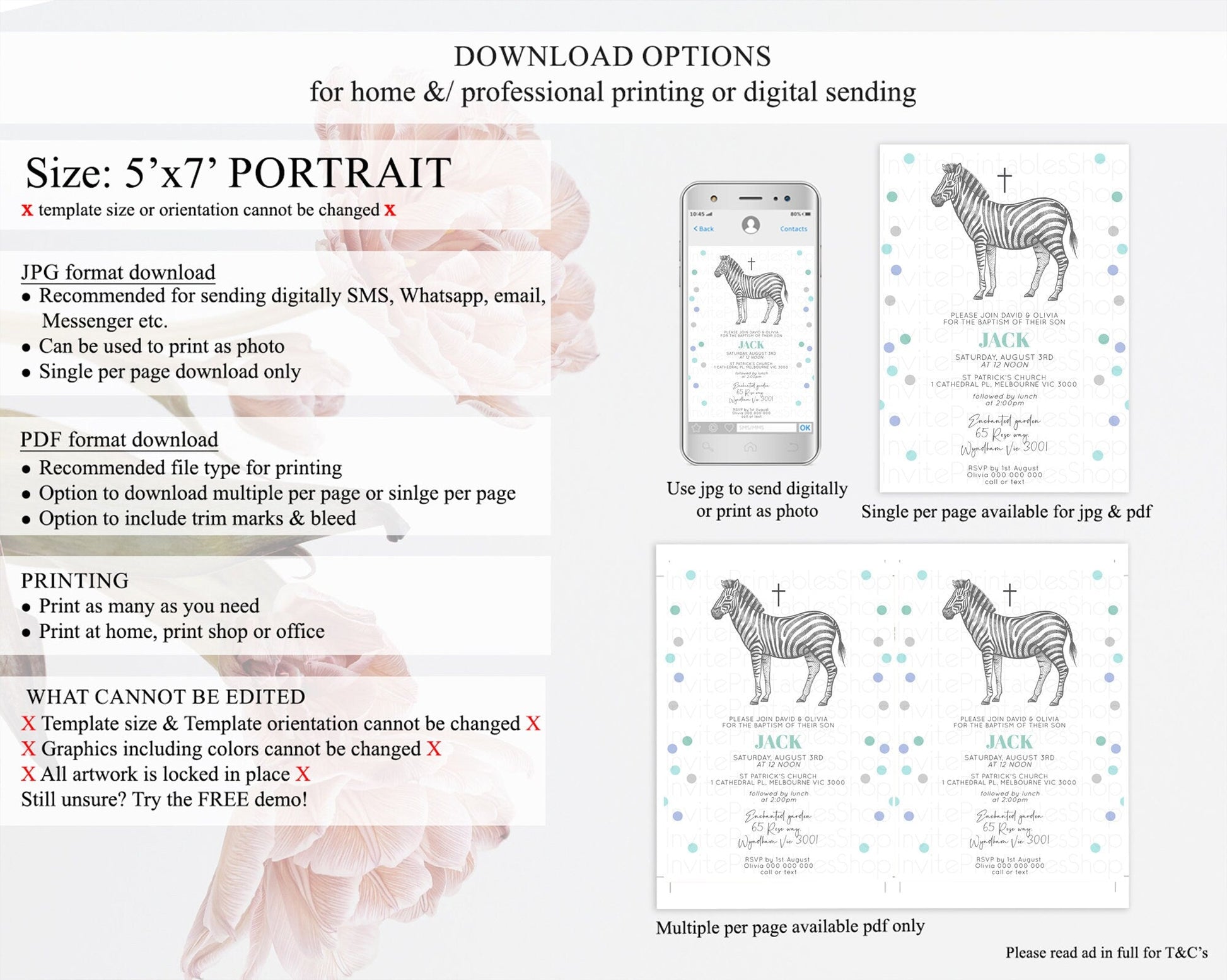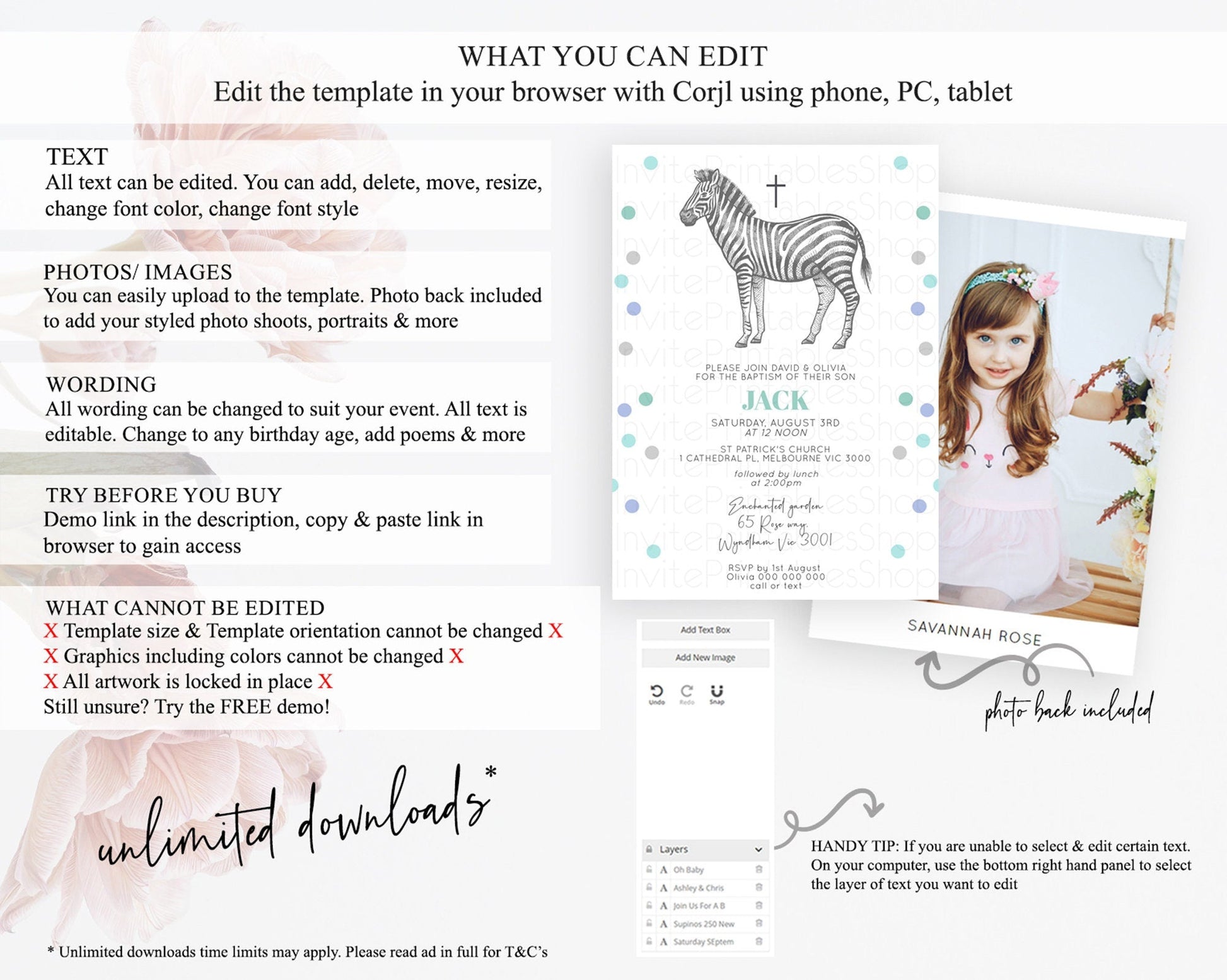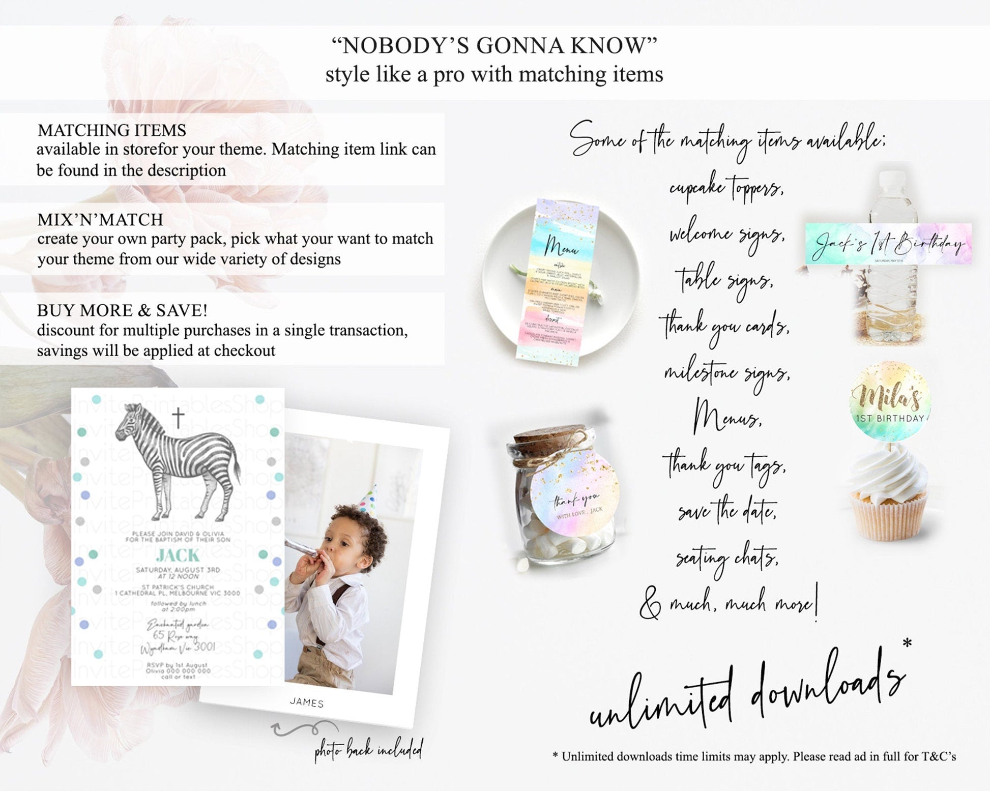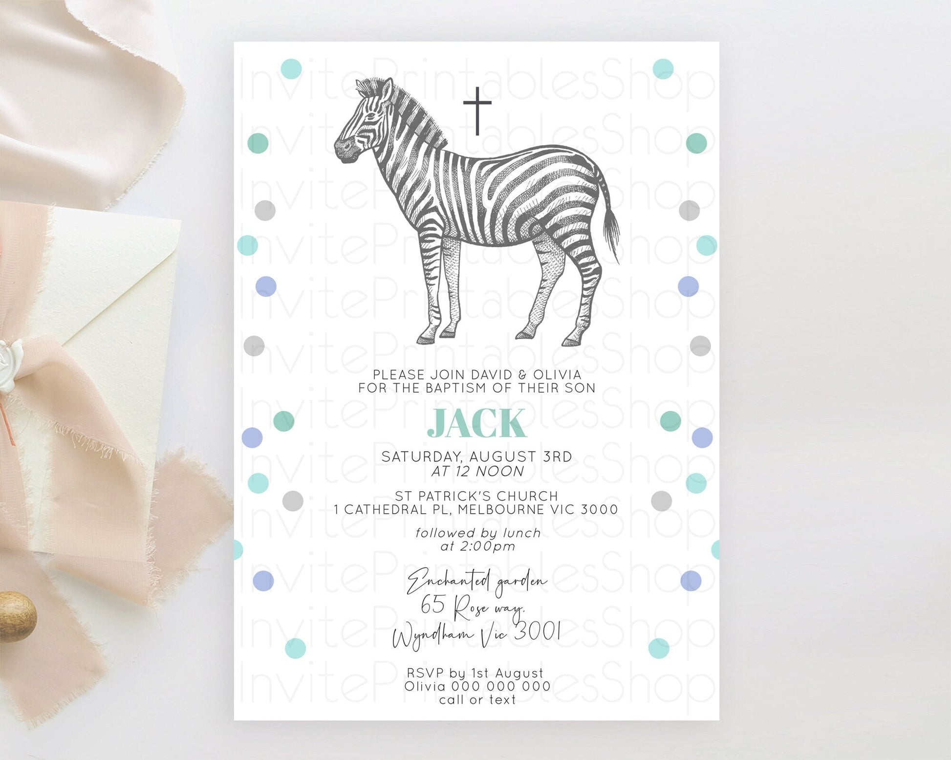 Zebra Baptism Invitation Zebra Baptism 1st Birthday Invitation Jungle Safari Christening Invite Watercolor Tropical Zoo Adventure D10856